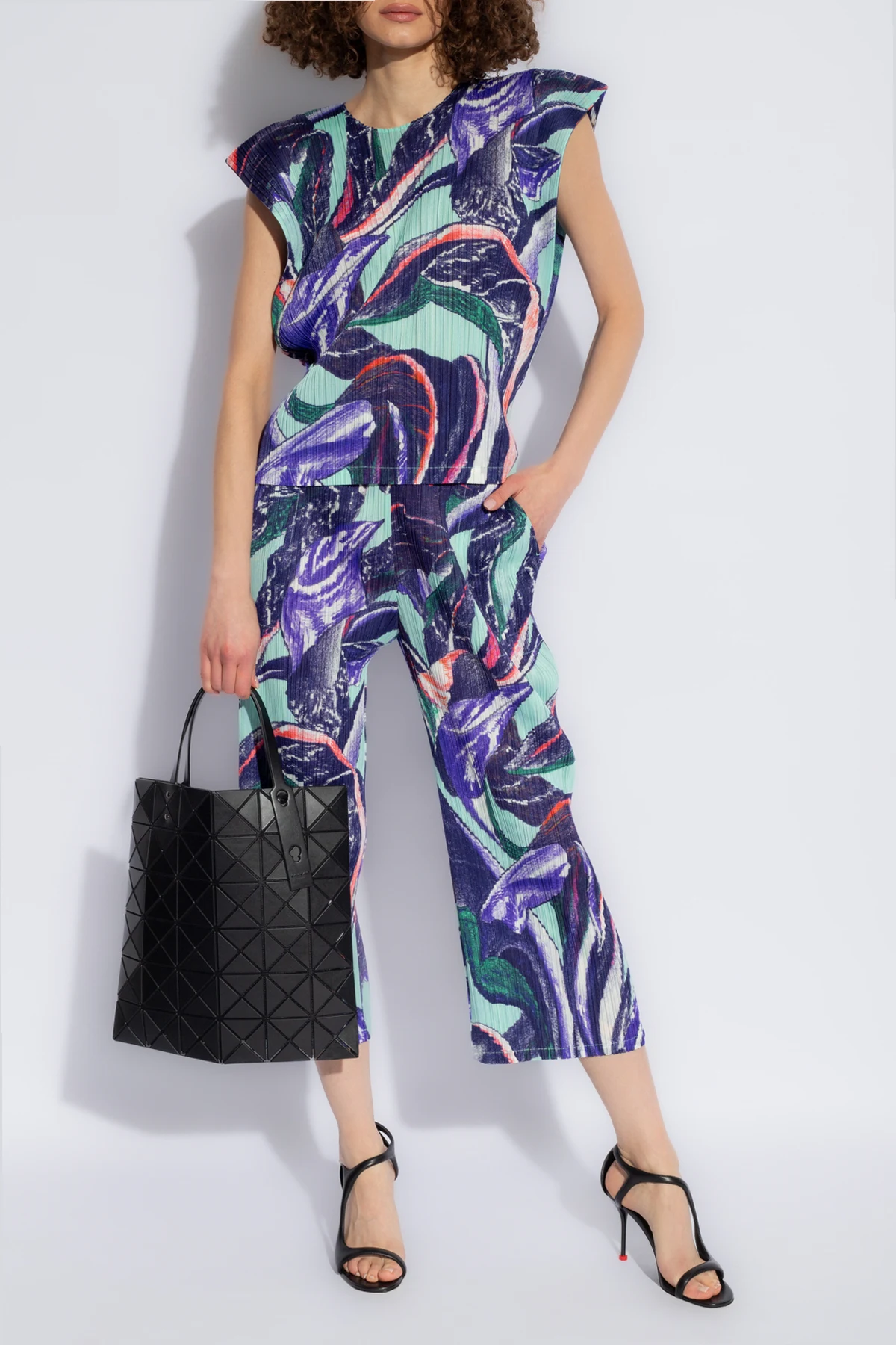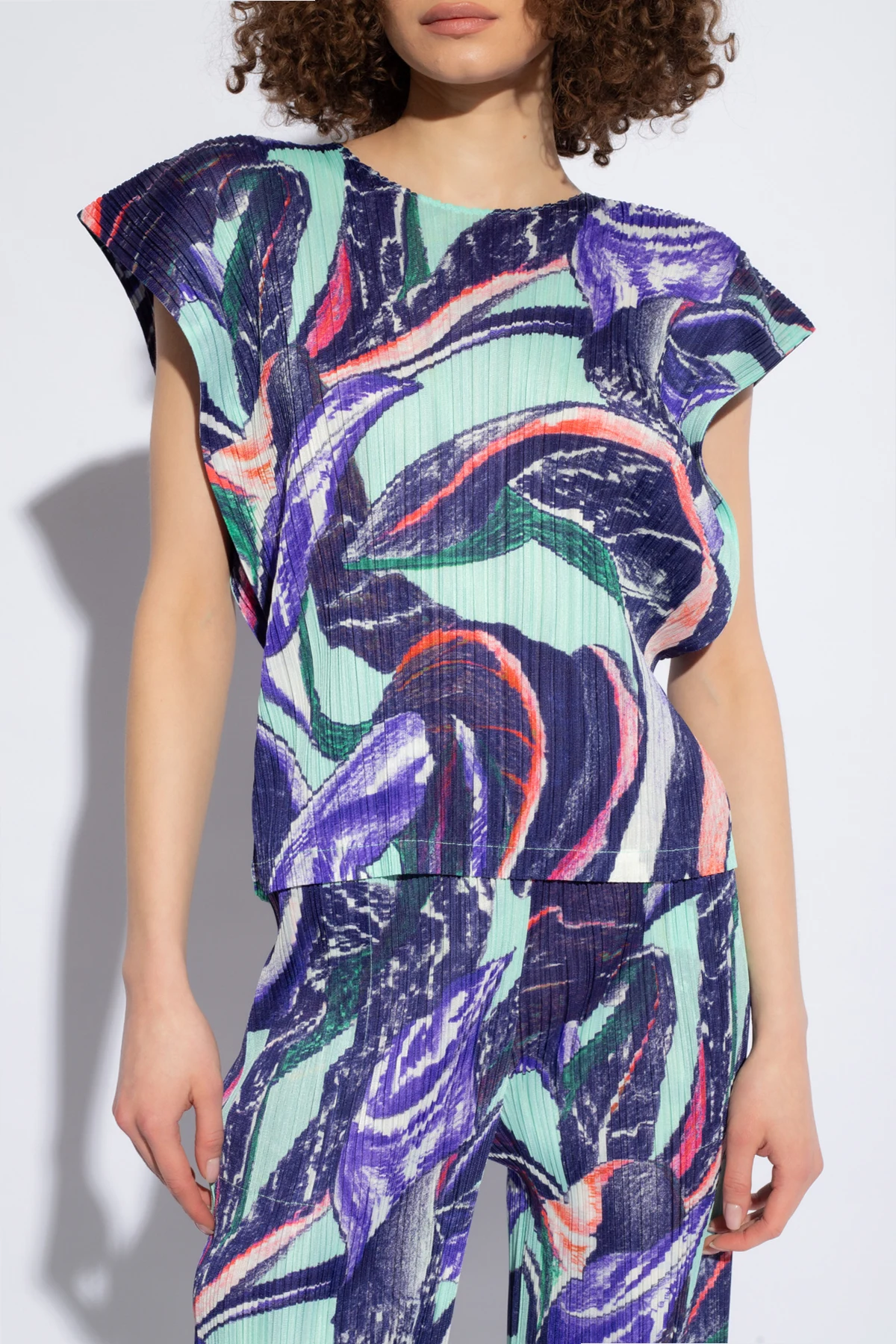 Der plissierte Top aus der Issey Miyake Pleats Please Kollektion ist die Quintessenz von Eleganz, gepaart mit einem außergewöhnlichen Design. Seine lockere Passform, ergänzt durch kurze, breite Ärmel, die auf den Schultern flattern, verleiht der Silhouette Leichtigkeit und einen modernen Charakter. Der runde Ausschnitt und die bis zu den Hüften reichende Länge betonen eine ausgewogene Harmonie der Proportionen und heben die Vorzüge jeder Figur hervor.