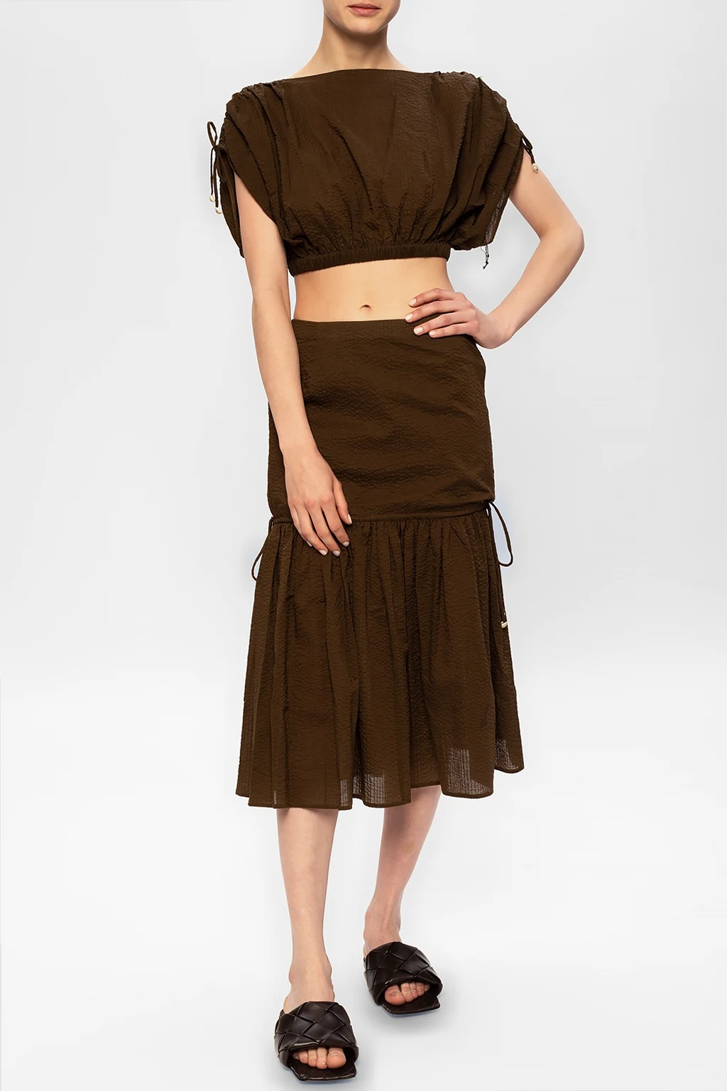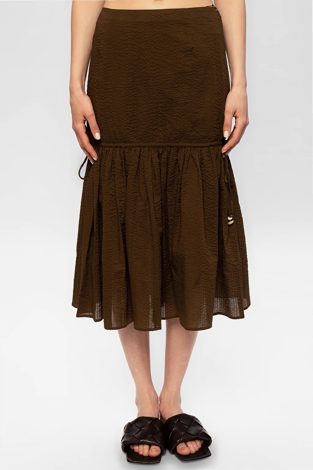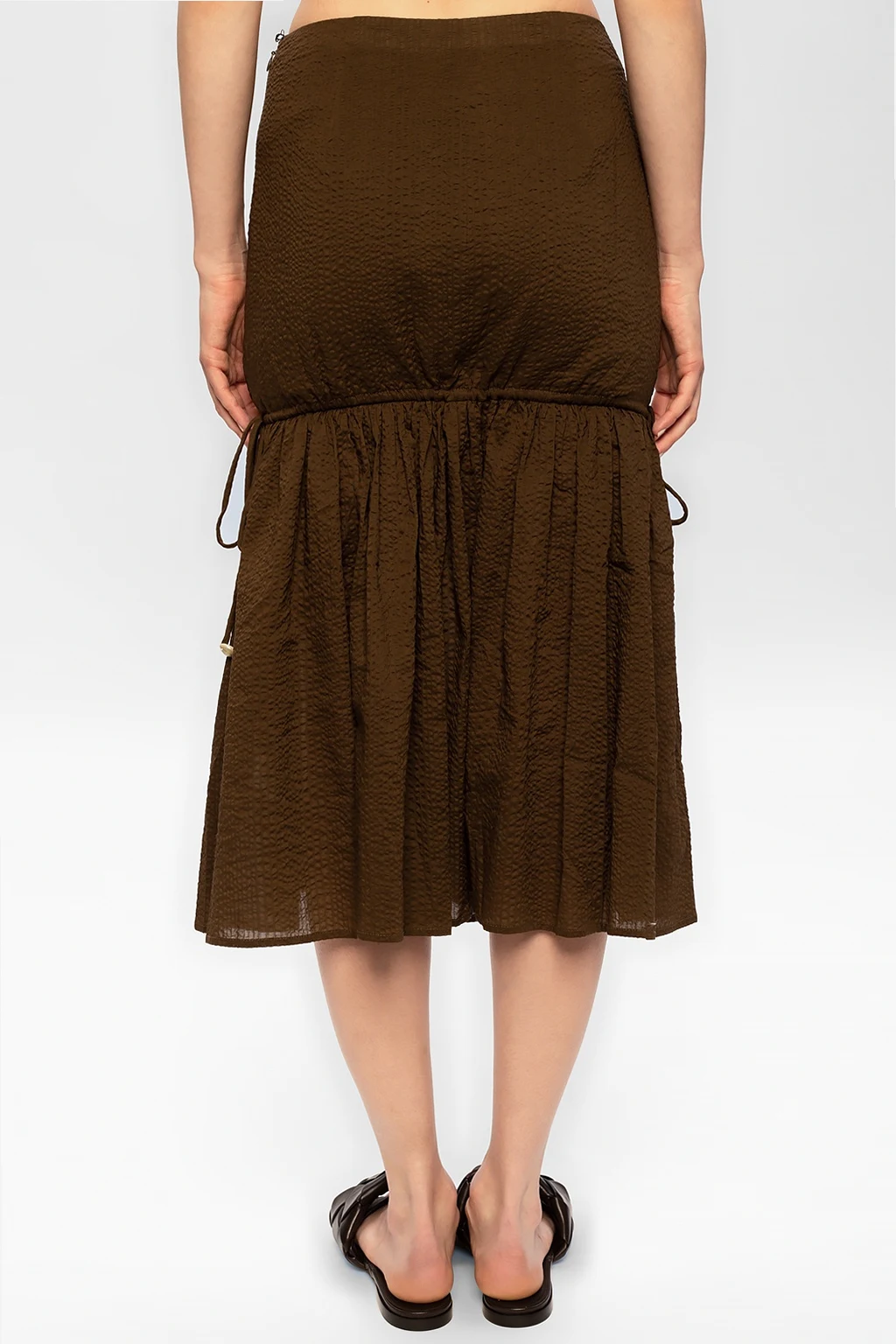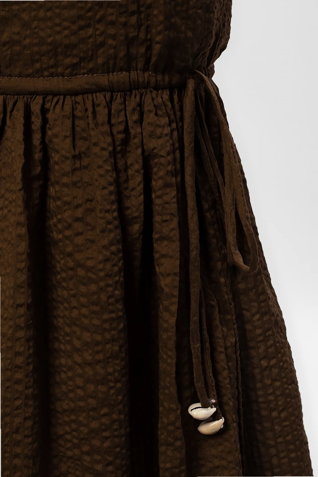 Brown flared skirt from Marysia. Made of cotton. Zip fastening on the side. Drawstring waist. Decorated with gathers.