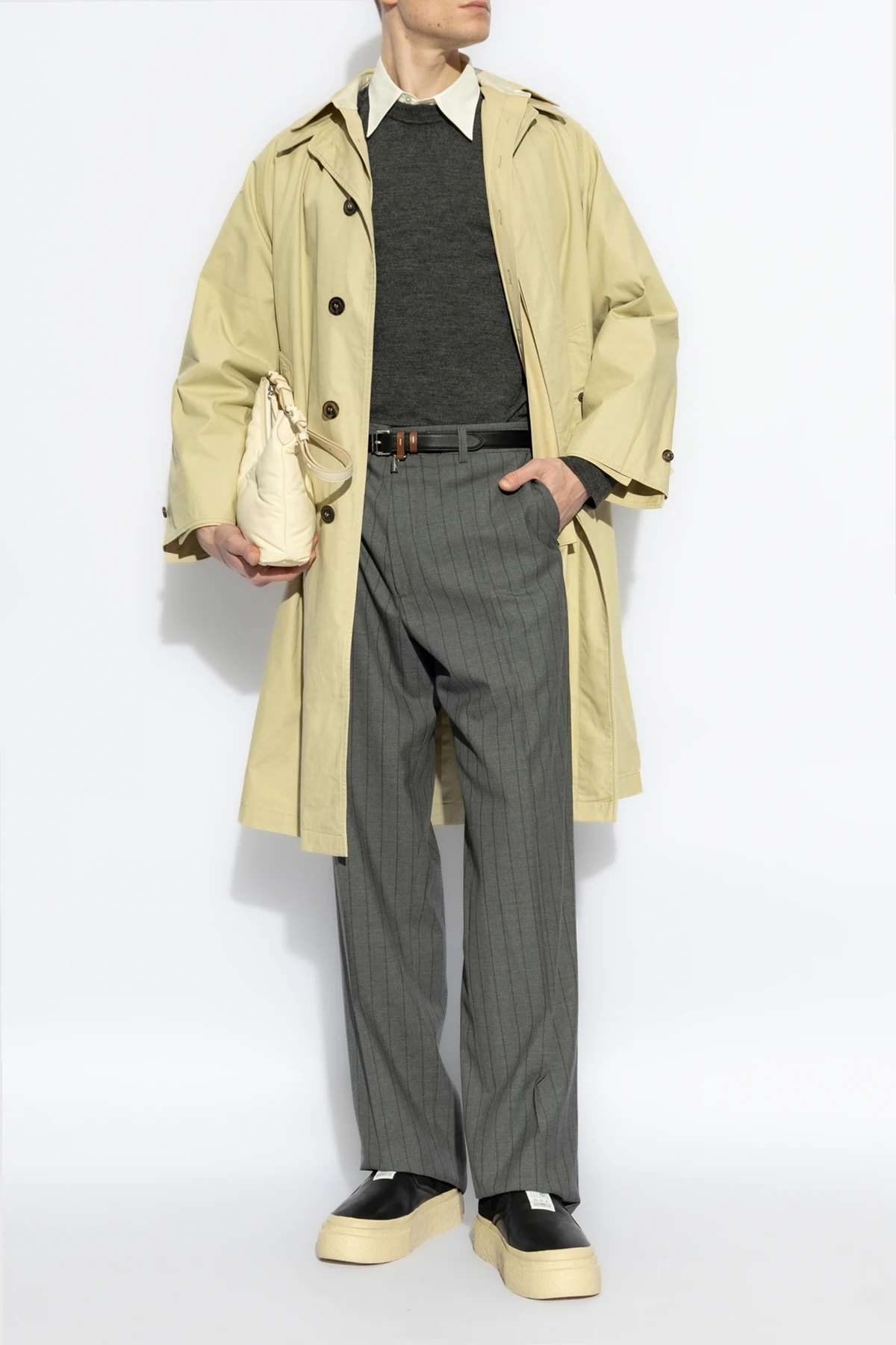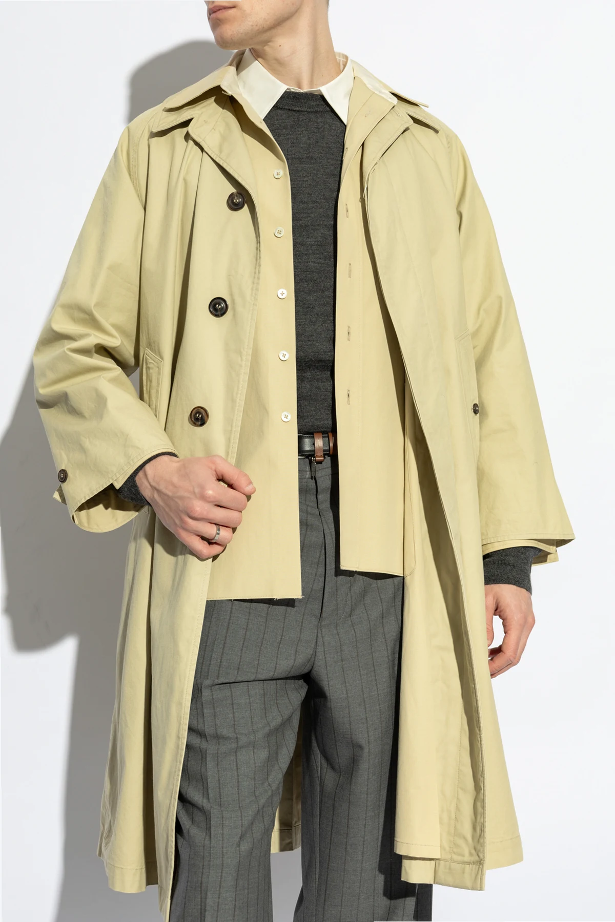 Wir präsentieren den Baumwoll-Trenchcoat von Maison Margiela – ein Synonym für klassische Eleganz kombiniert mit einem modernen Ansatz in der Mode. Dieser beige Trenchcoat, gefertigt aus hochwertigster Baumwolle, besticht durch seinen schlichten Schnitt, der bis zu den Knien reicht, und lange Ärmel mit verstellbaren Riemen. Das bequeme und luftige Material macht ihn ideal für jede Jahreszeit.