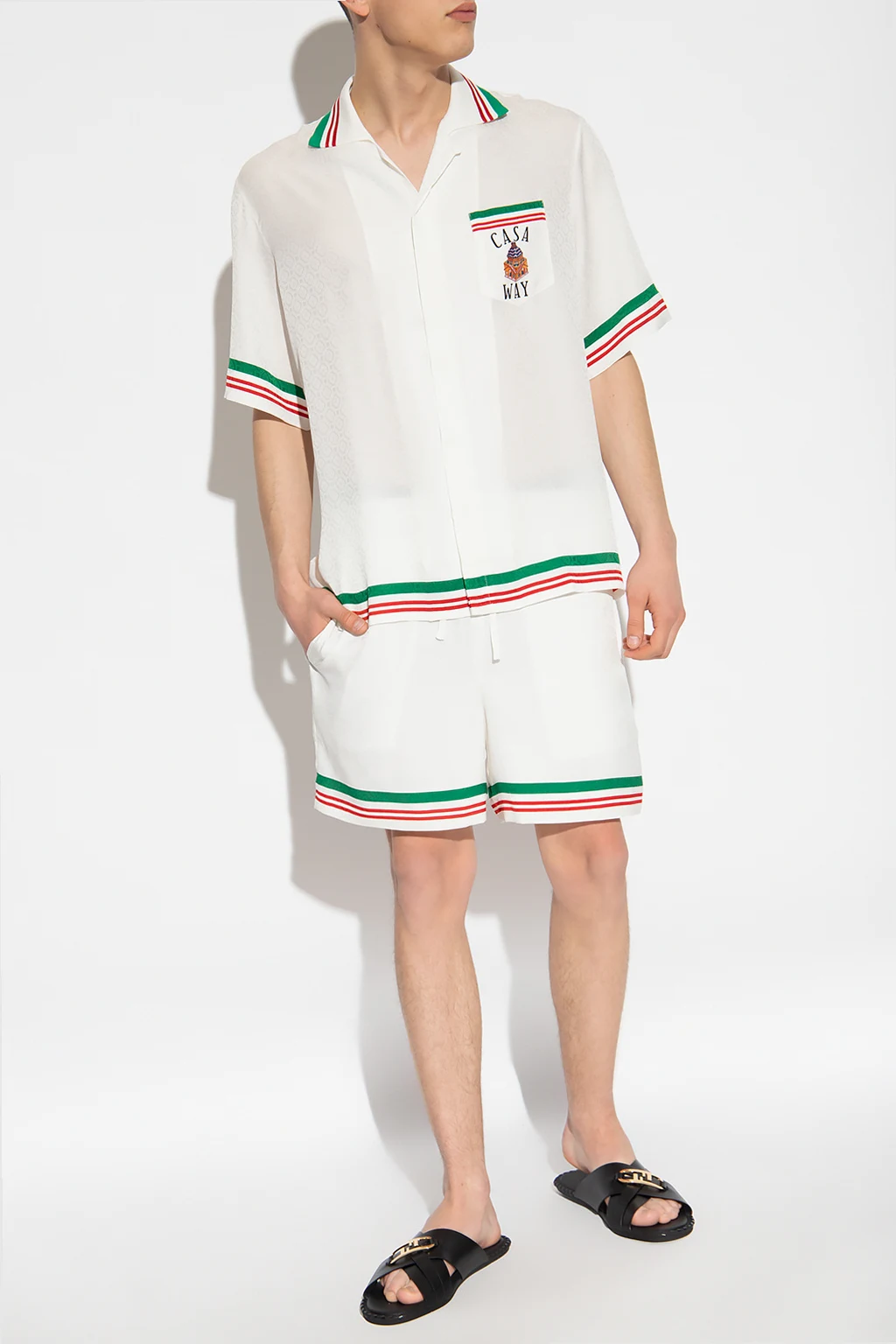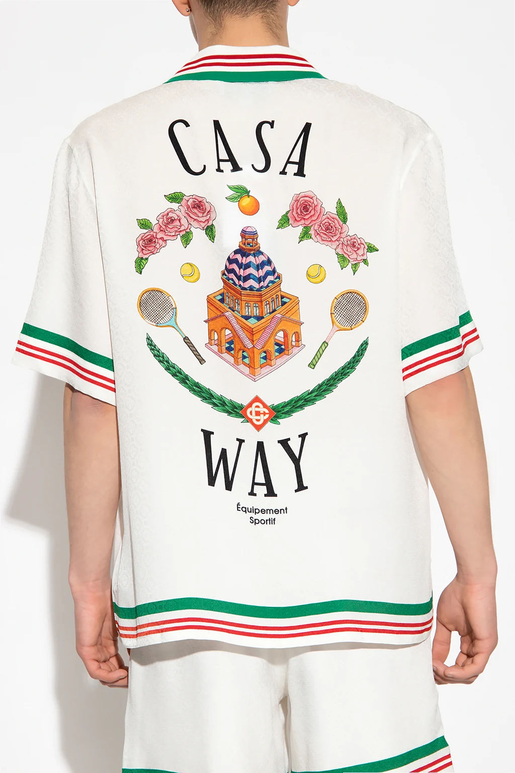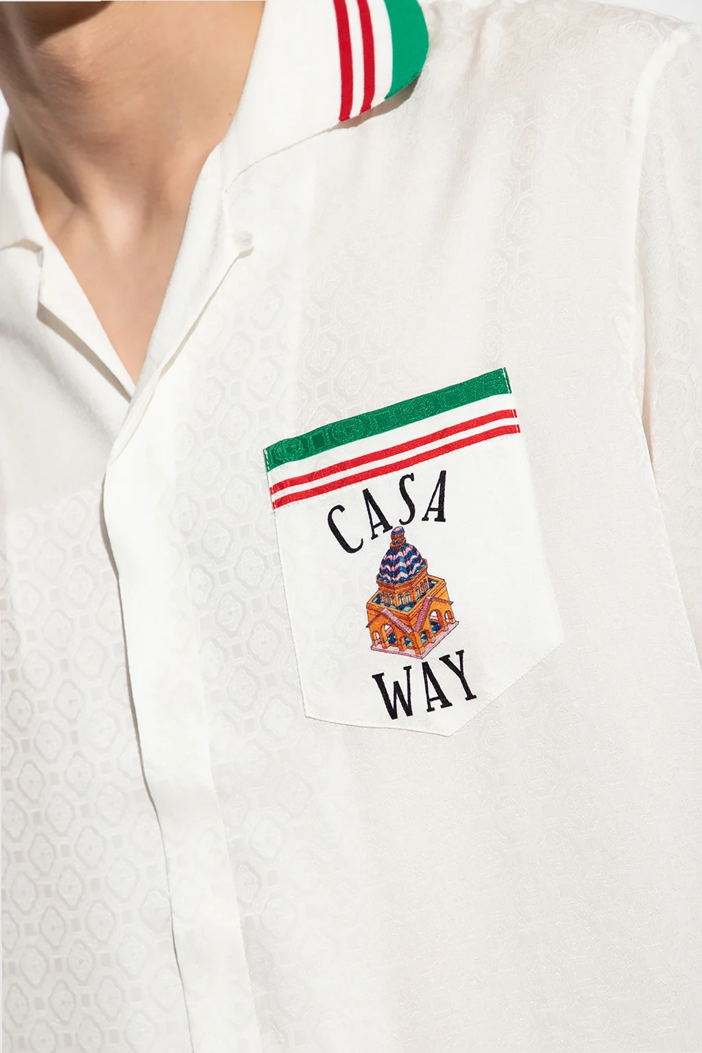 White 'Casa Way' shirt from Casablanca. Made of silk, this style fastens with buttons and showcases a jacquard monogram pattern and colourful logo motif. It is complete with short sleeves.