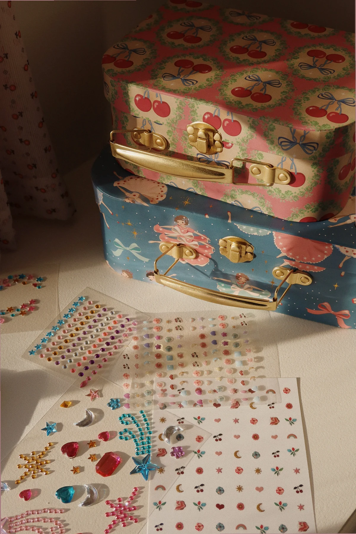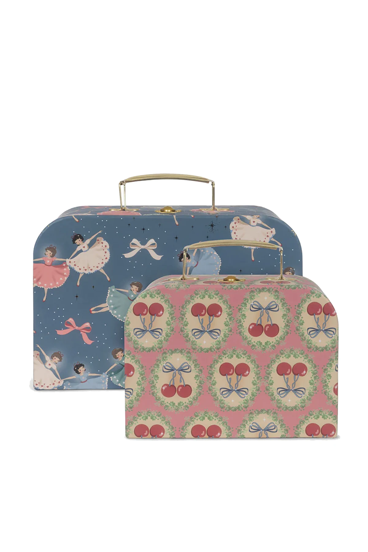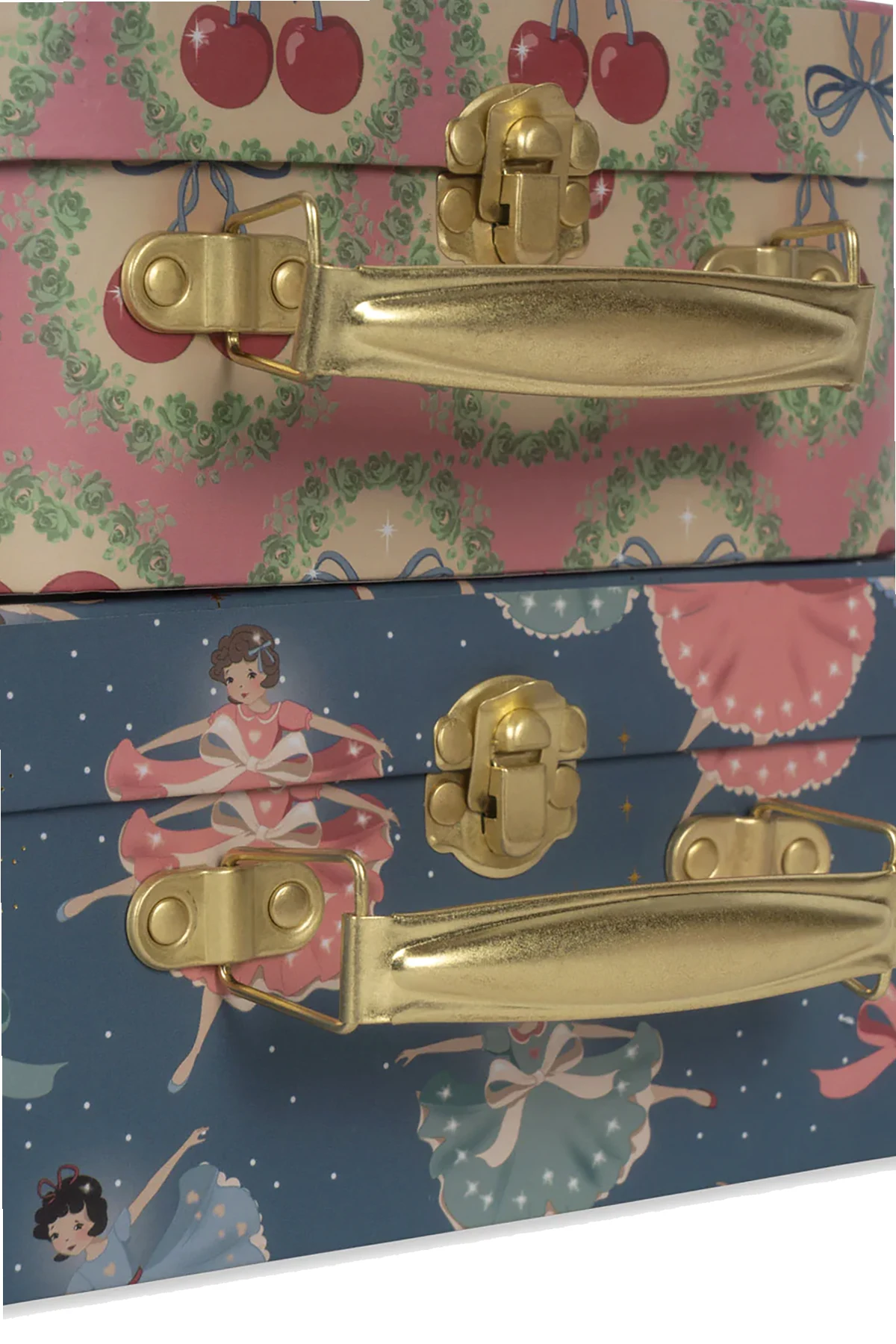Die Koffer zeichnen sich durch ihre rechteckige Form mit abgerundeten Kanten aus, was ihnen eine subtile Eleganz verleiht. Ballerina-Motive auf blauem Hintergrund und Kirschen auf rosa Hintergrund mit grünen Ornamenten machen sie einzigartig. Goldene, metallene Griffe und Verschlüsse unterstreichen ihren exklusiven Charakter.