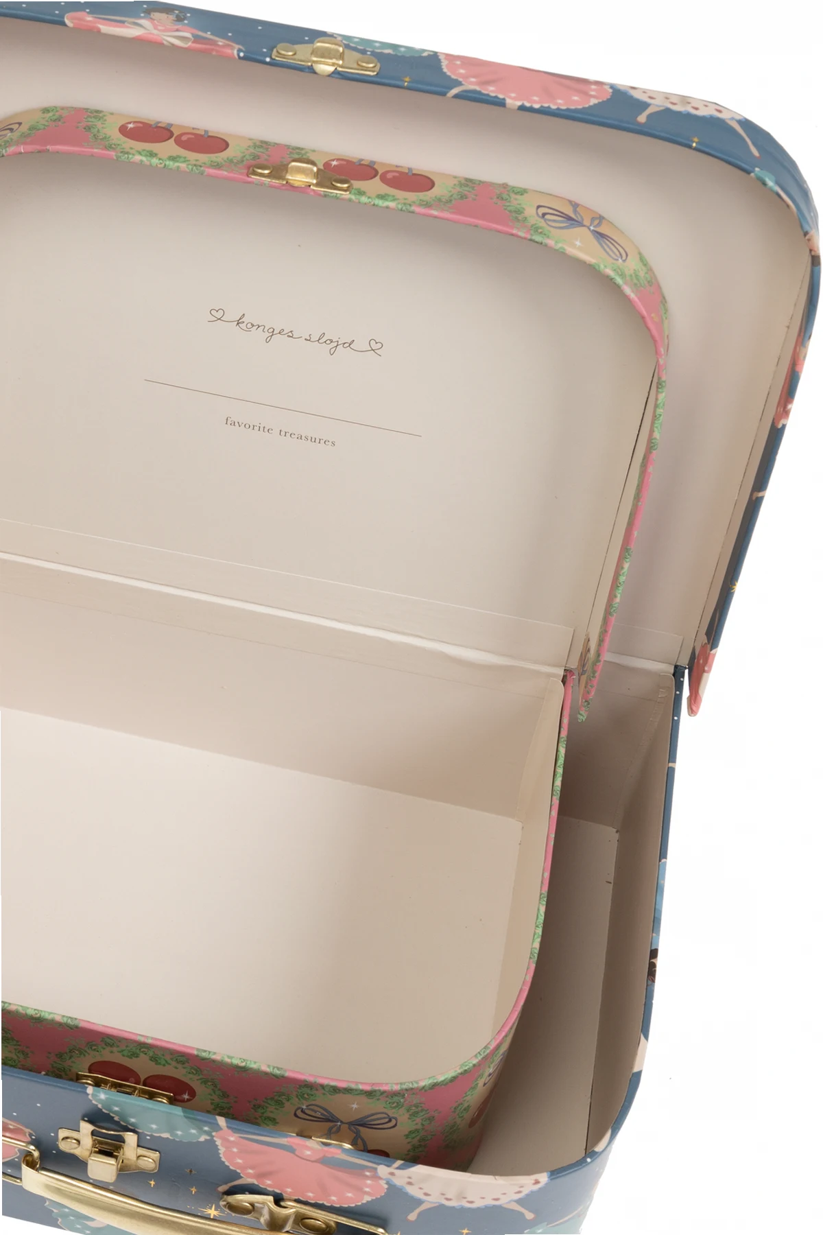 Das Innere der Koffer, verziert mit dem Markenlogo-Aufdruck, besticht durch Helligkeit und Liebe zum Detail, mit einem subtilen Schriftzug "konges sløjd" und "favorite treasures". Hergestellt aus FSC™-zertifizierten Materialien , sind die Koffer sowohl stilvoll als auch umweltfreundlich.