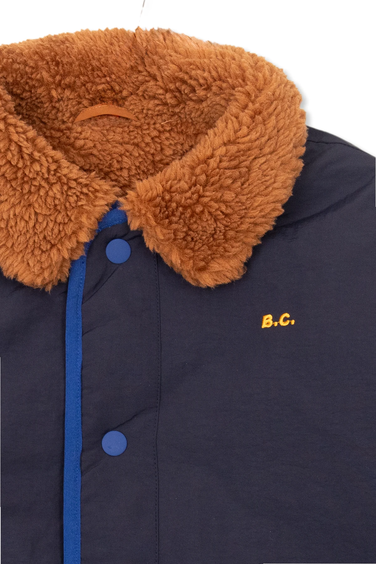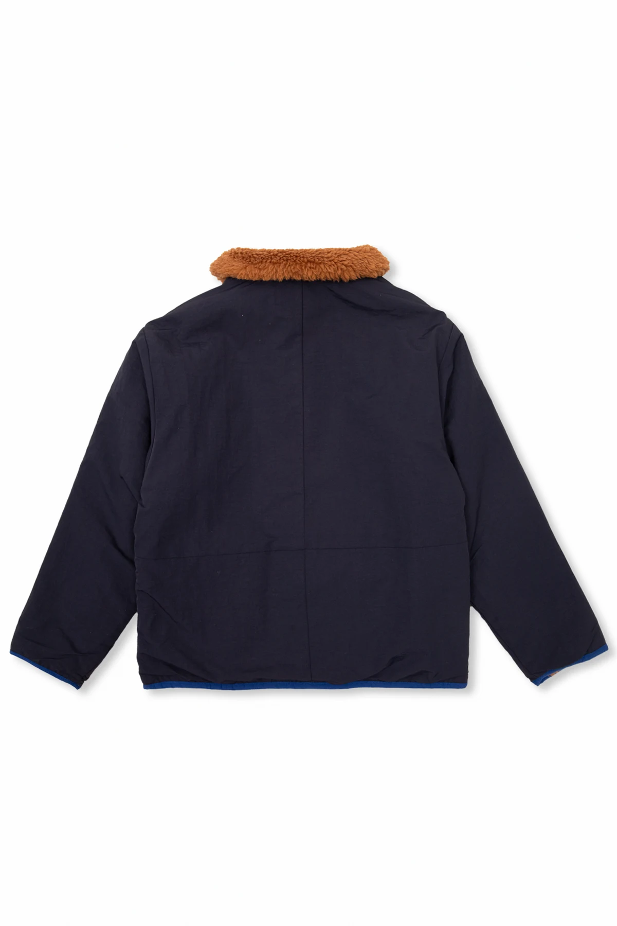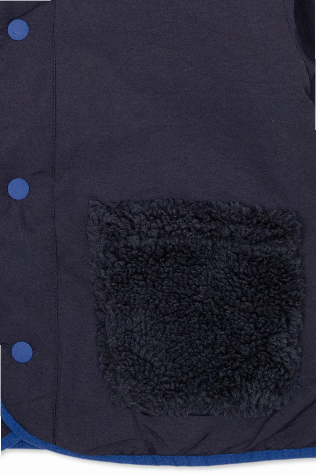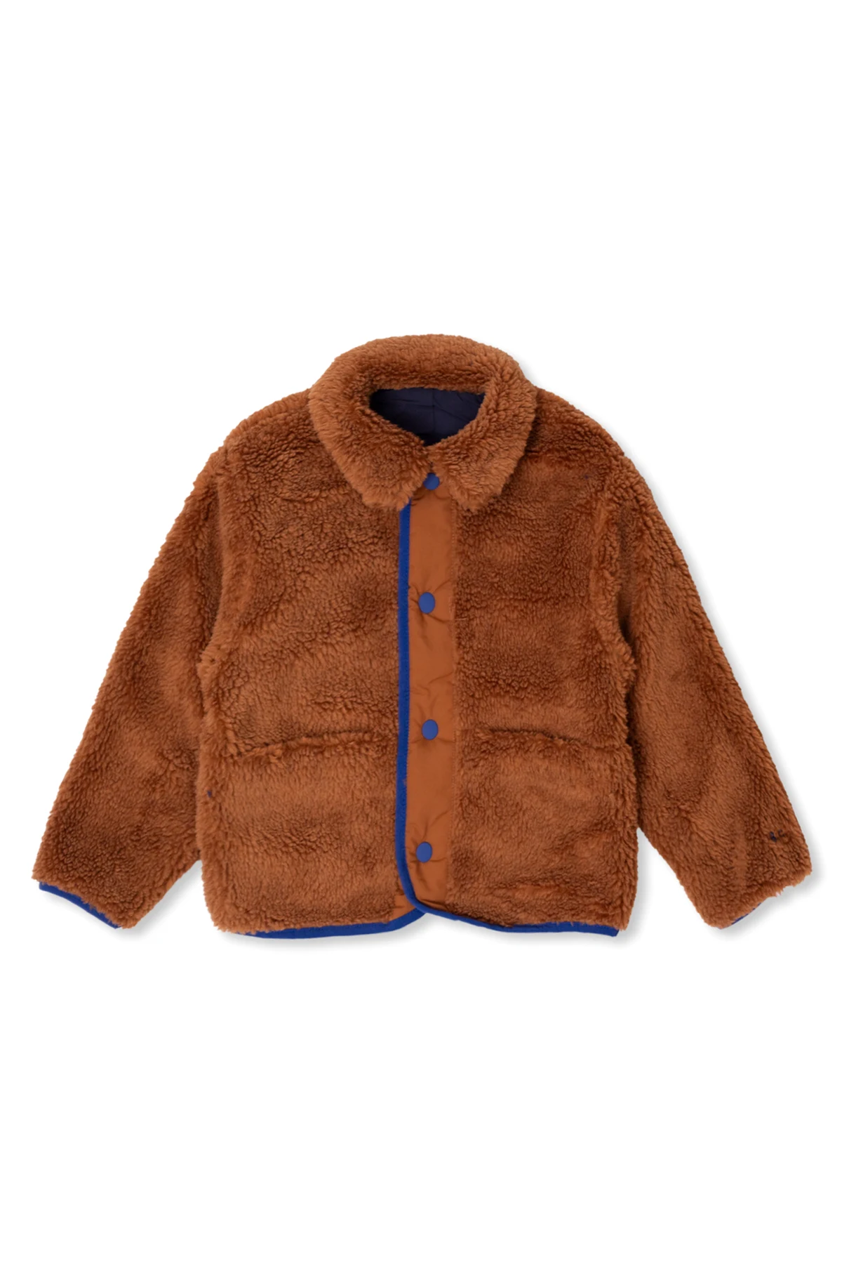 Reversible jacket in navy blue and brown from Bobo Choses. Made from recycled material, this style fastens with snaps and features piping on the long sleeves and hem. One side has logo embroidery and two slip pockets. The other side is made from fleece and has two slip pockets.