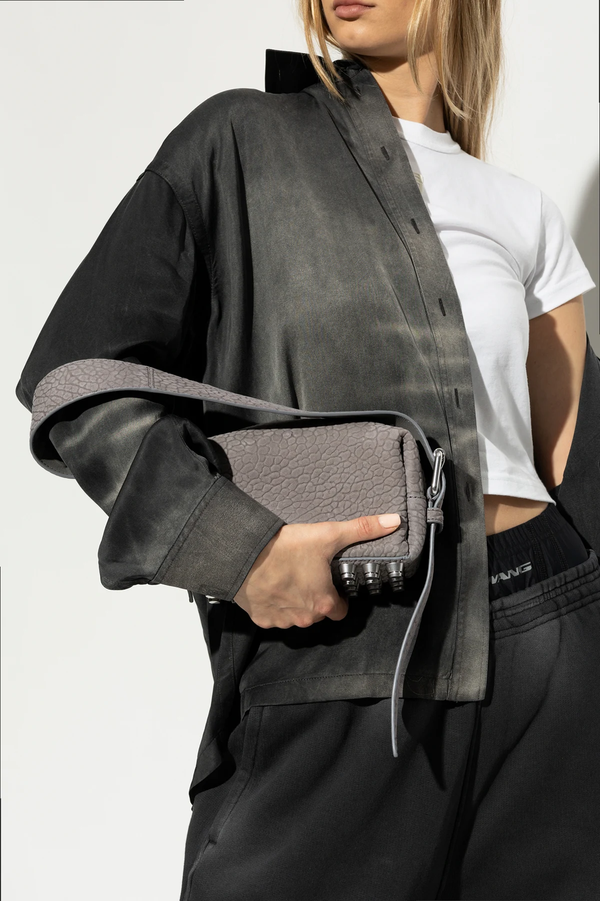 Wir präsentieren die Schultertasche „Ricco Small” von dem renommierten Designer Alexander Wang . Diese außergewöhnliche Tasche zeichnet sich durch eine texturierte Oberfläche, die an Tierhaut erinnert , aus, was ihr einen einzigartigen Charme und Eleganz verleiht.