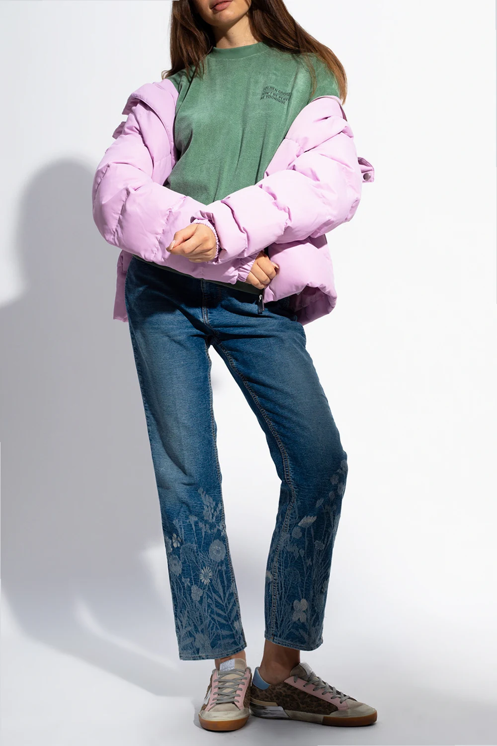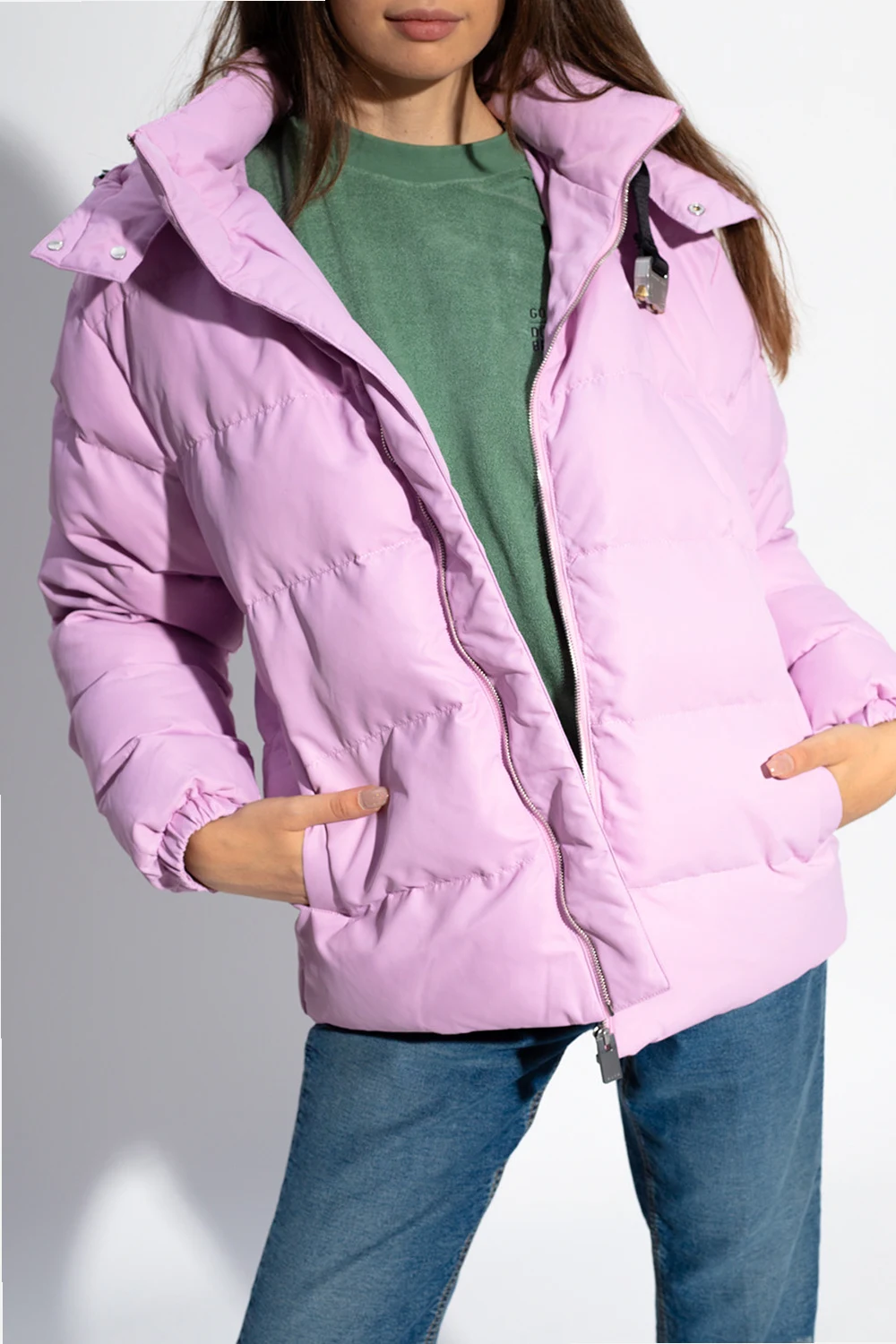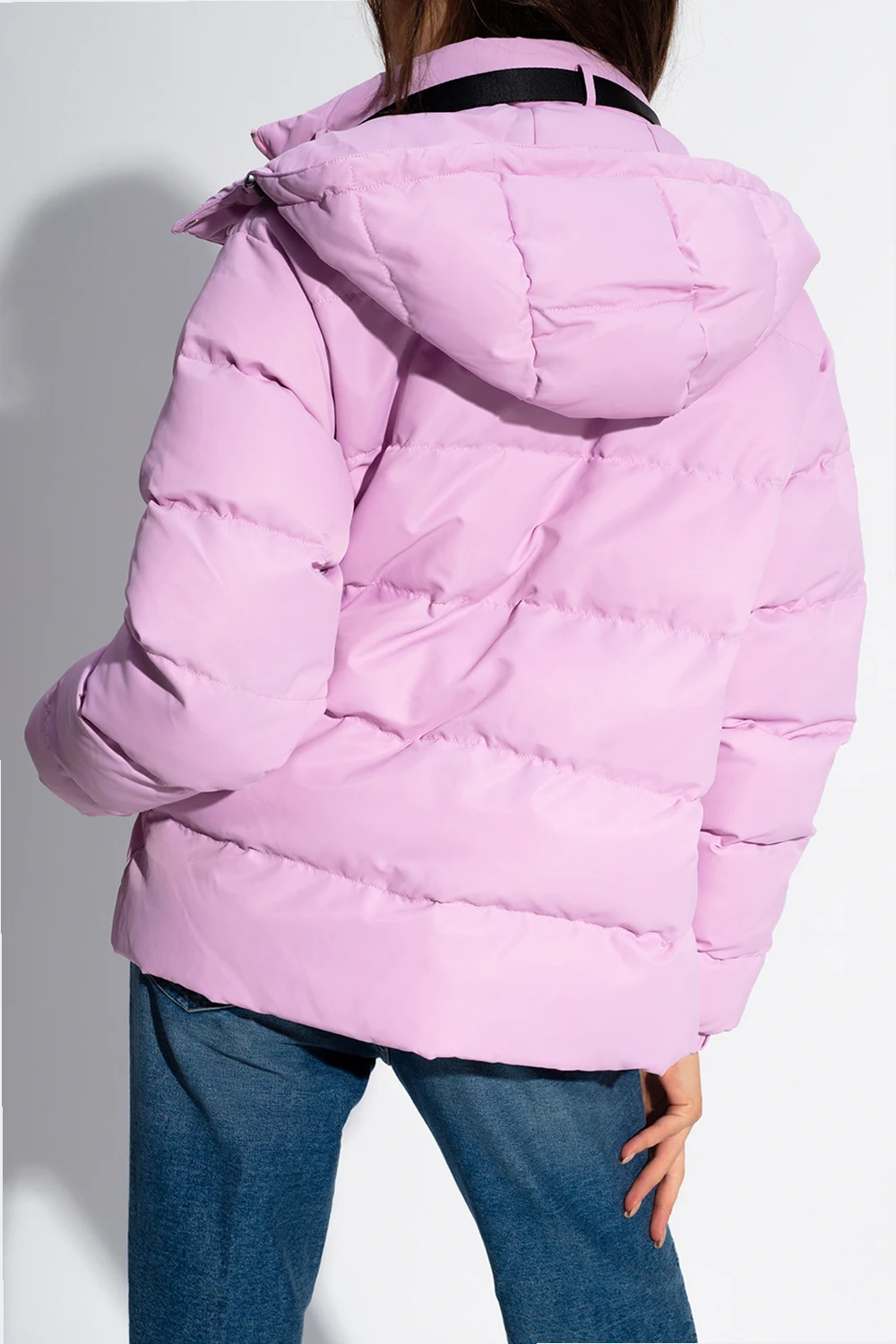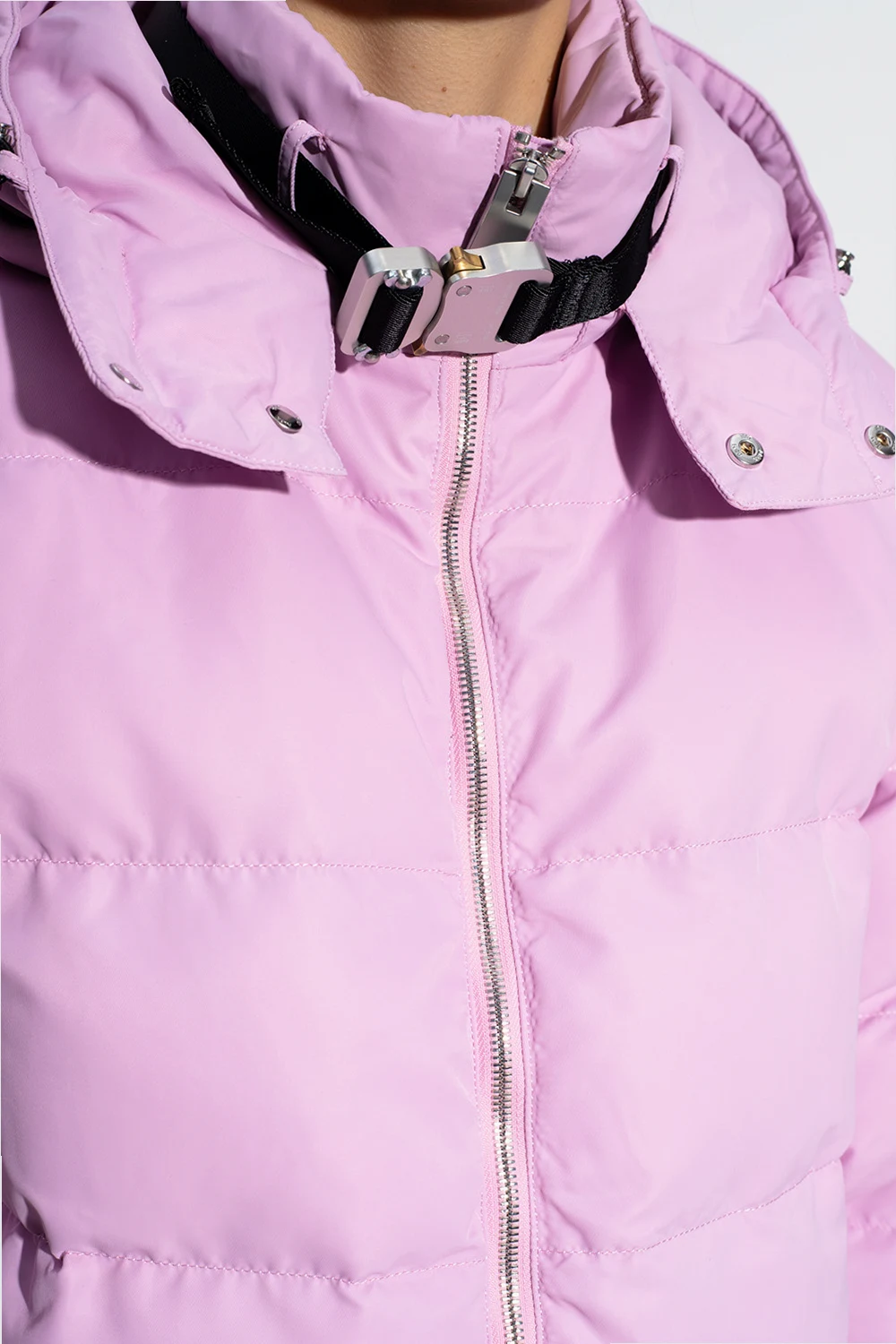 Pink insulated jacket from 1017 ALYX 9SM. Fastened with a zip, this garment is complete with a detachable drawstring hood, black strap with the label’s signature, silver-tone and gold-tone rollercoaster buckle, two snap-fastened pockets and elasticated cuffs.
