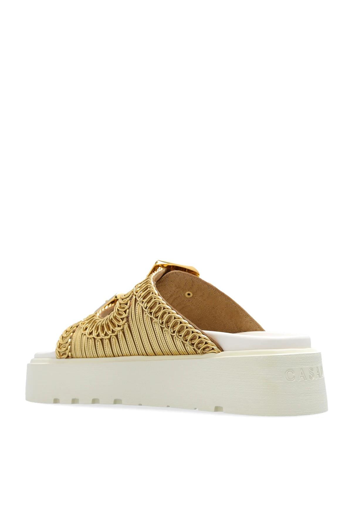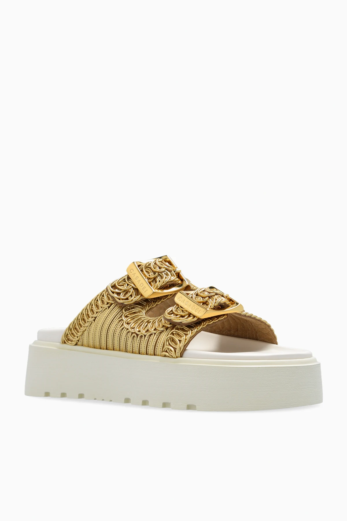 Gold-tone ‘Birky’ platform slides from Casadei. Made of woven fabric with a metallic finish, this pair features adjustable straps with branded buckles and a cream rubber sole.