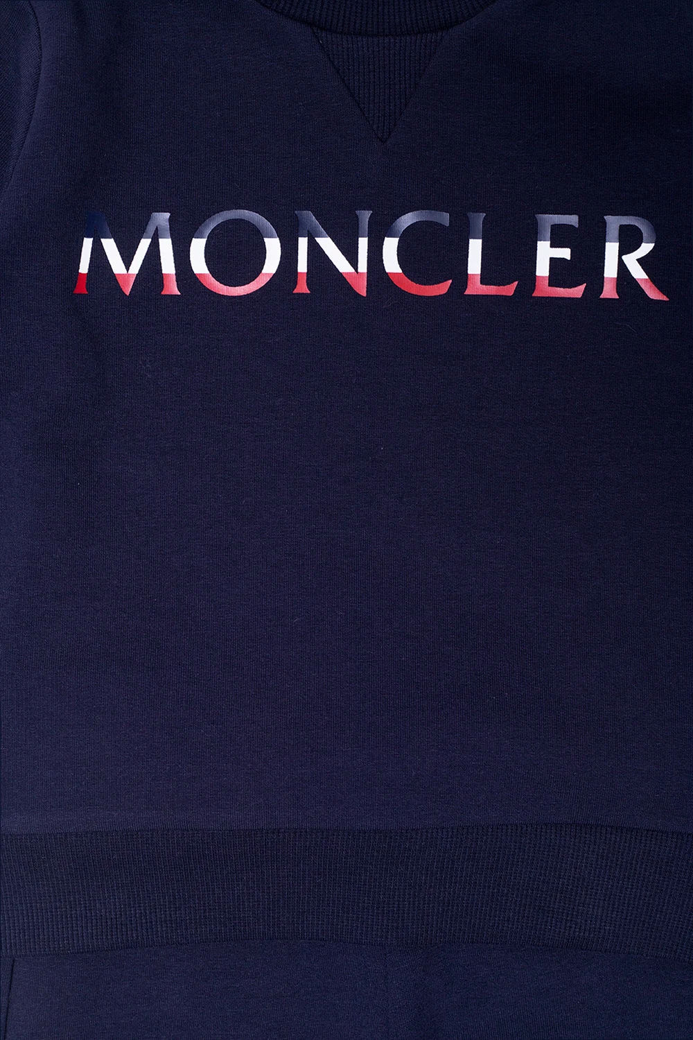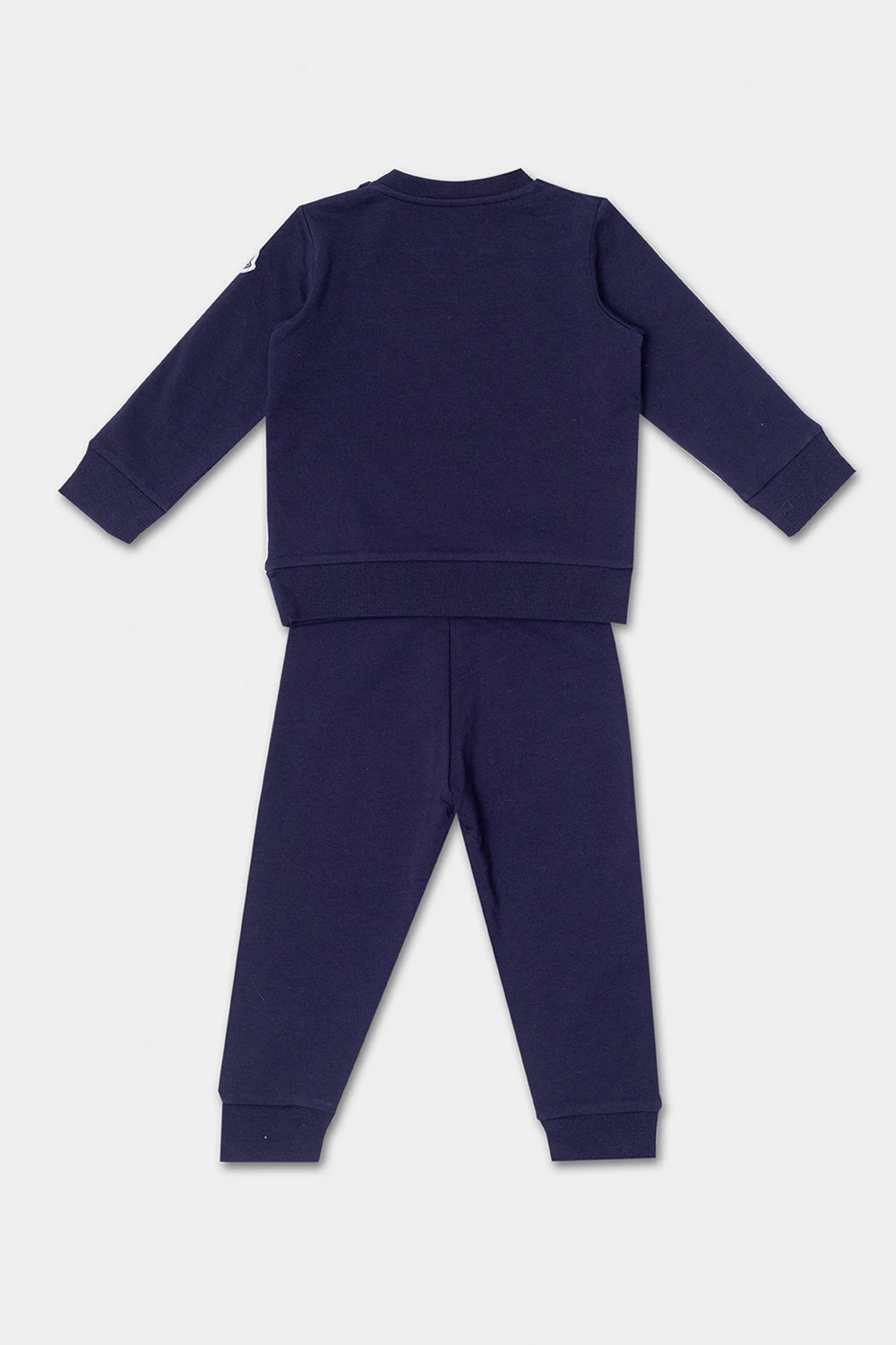 Navy blue sweatsuit from Moncler Kids. Made from cotton, this set includes a crewneck sweatshirt with snap closures, a navy blue-white-red rubberised logo on the front, a signature felt logo patch on the sleeve and ribbed trims on the edges, and sweatpants with an elasticated waistband and cuffs.