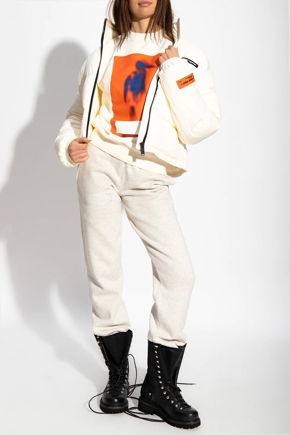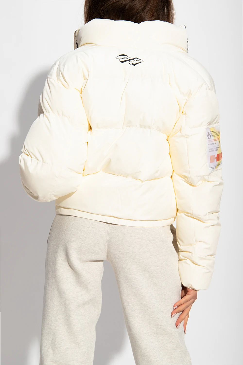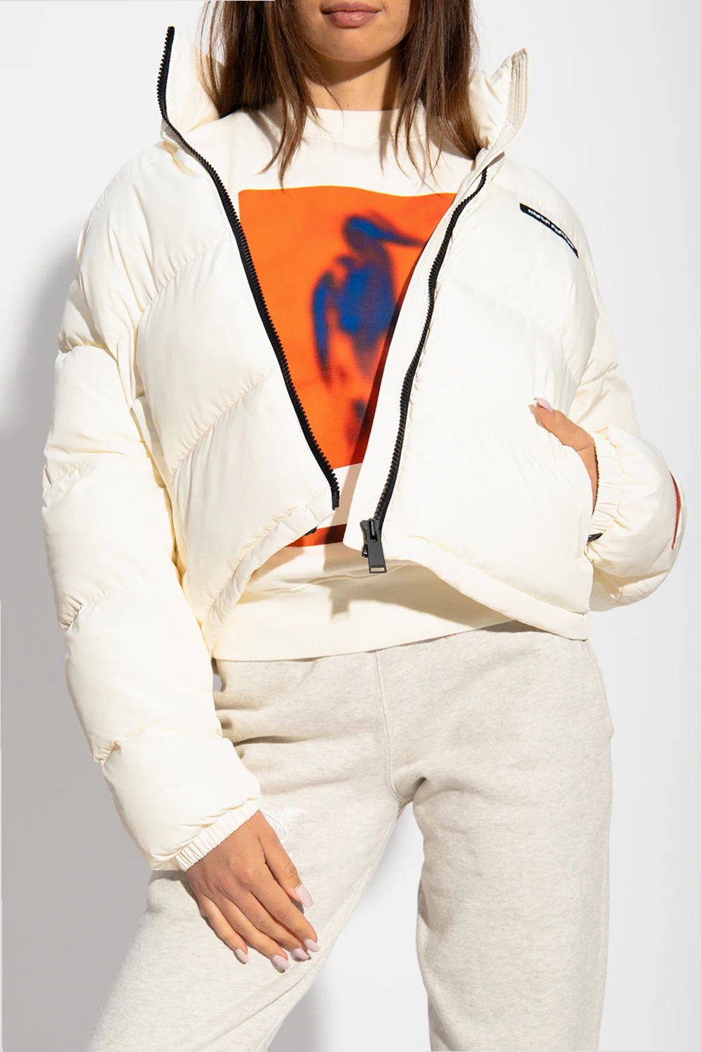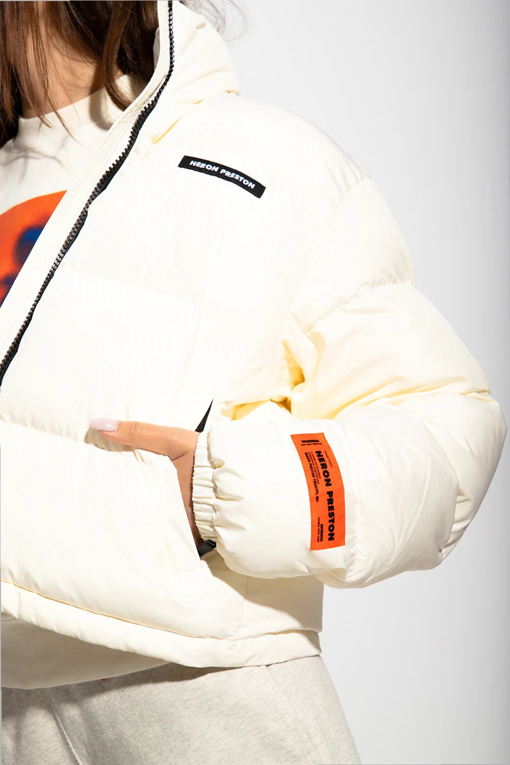 Cream padded jacket with a stand-up collar from Heron Preston. Fastened with a black zip, this garment features a logo patch, black print, two front zip pockets as well as an elasticated hem and cuffs.
