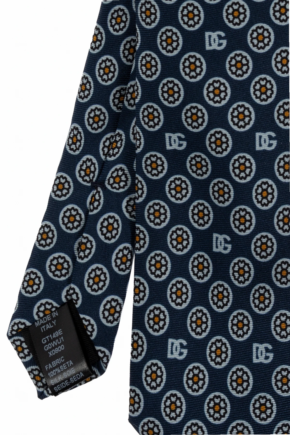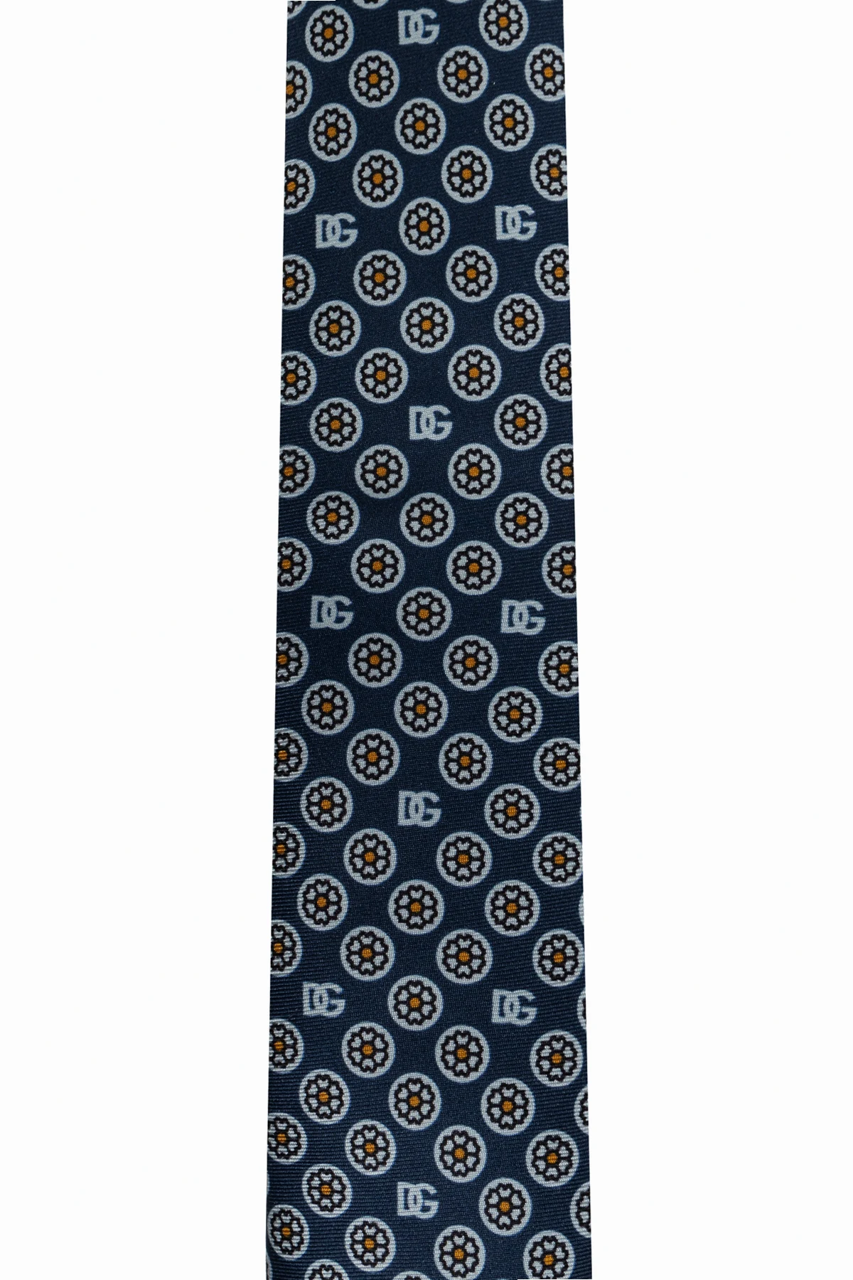 Wir präsentieren eine Seidenkrawatte aus der exklusiven Kollektion der Marke Dolce & Gabbana . Die dominierende marineblaue Farbe in Kombination mit einem charakteristischen Muster, das aus sich wiederholenden Kreisen mit einem floralen Motiv in der Mitte und dem deutlich sichtbaren Designer-Logo besteht, schafft eine einzigartige Komposition.