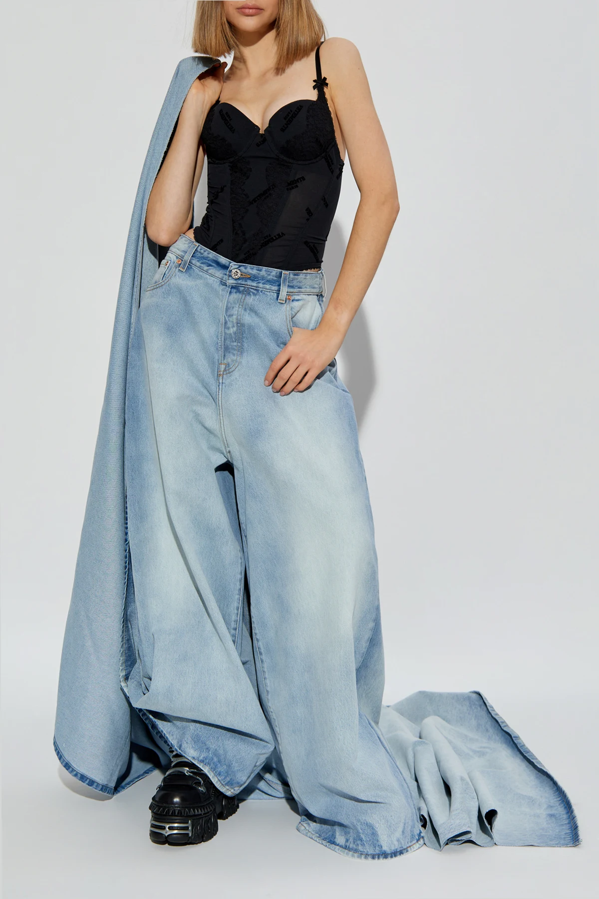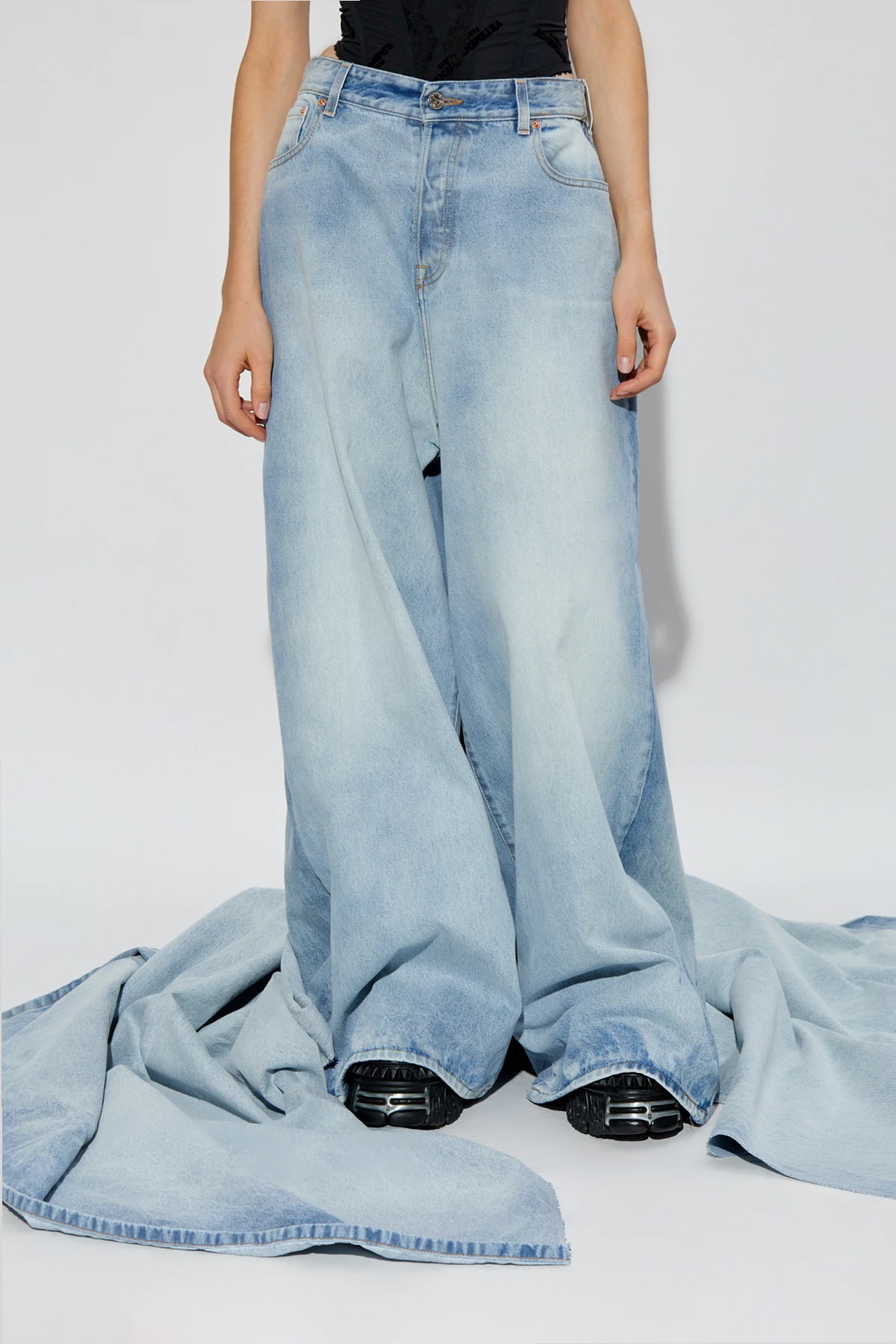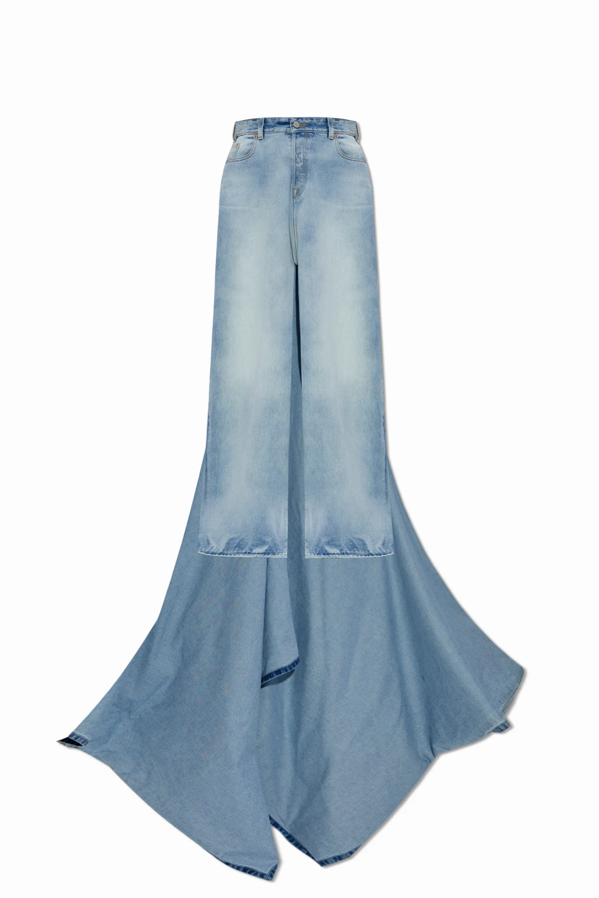 Entdecken Sie die Jeans mit Schleppe , ein einzigartiges Kunstwerk der renommierten Marke VETEMENTS . Diese avantgardistische Hose mit weitem Bootcut-Schnitt zeichnet sich durch extrem lange Hosenbeine aus, die nahtlos in eine beeindruckende Schleppe übergehen und ihnen ein dramatisches und einzigartiges Aussehen verleihen.