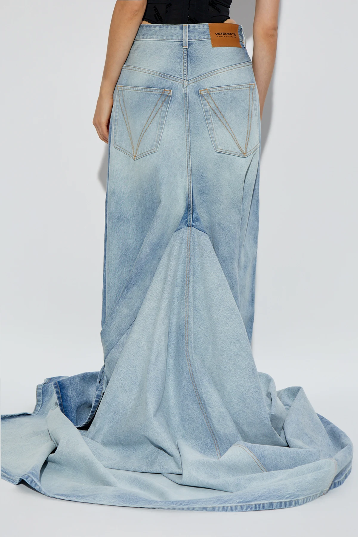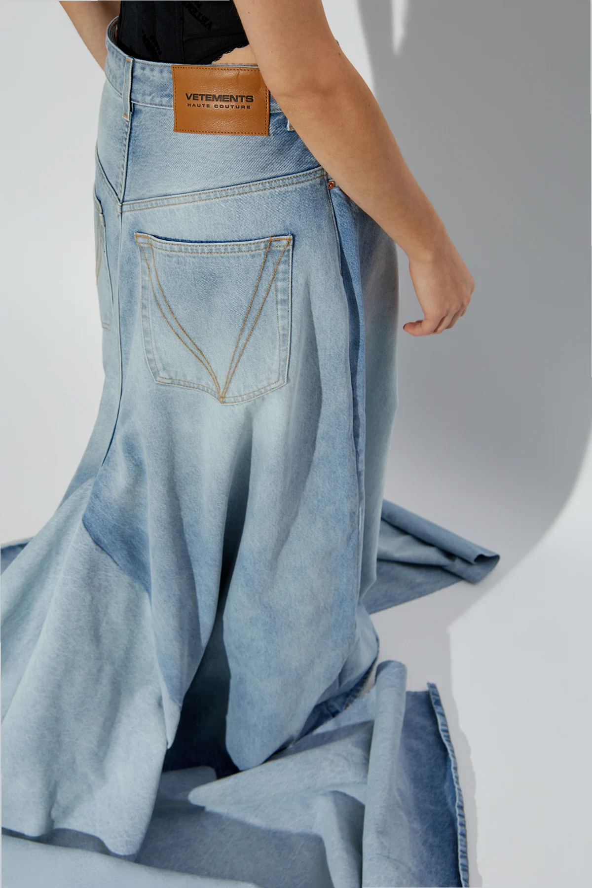 Gefertigt aus hellblauem Denim, vereinen diese Jeans klassisches Material mit modernem Stil, was sie zur perfekten Wahl für Personen macht, die Originalität und Luxus schätzen. Auf der Rückseite der Hose befindet sich ein Lederaufnäher mit dem Logo "VETEMENTS HAUTE COUTURE", der ihre exklusive Herkunft unterstreicht.