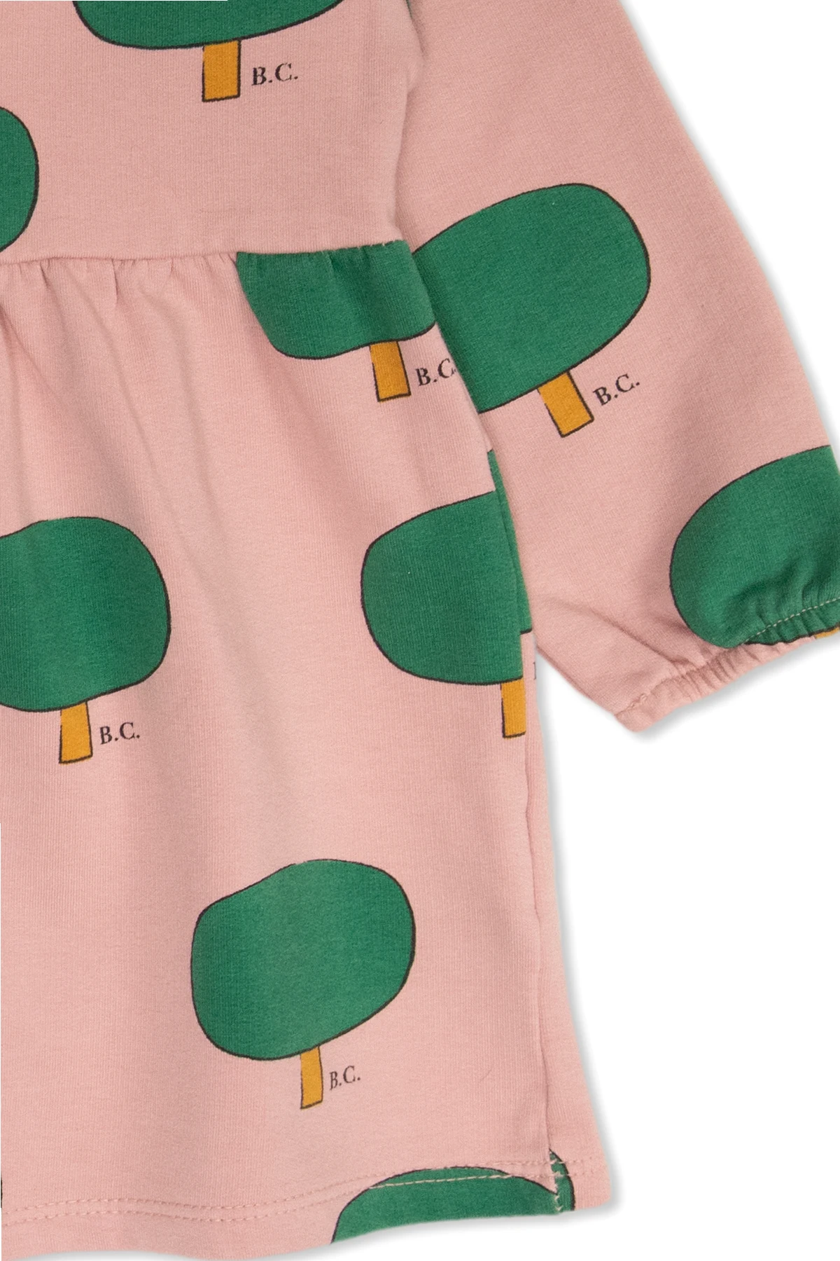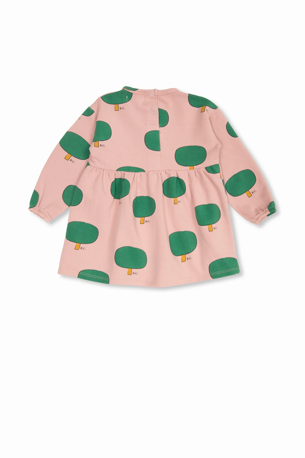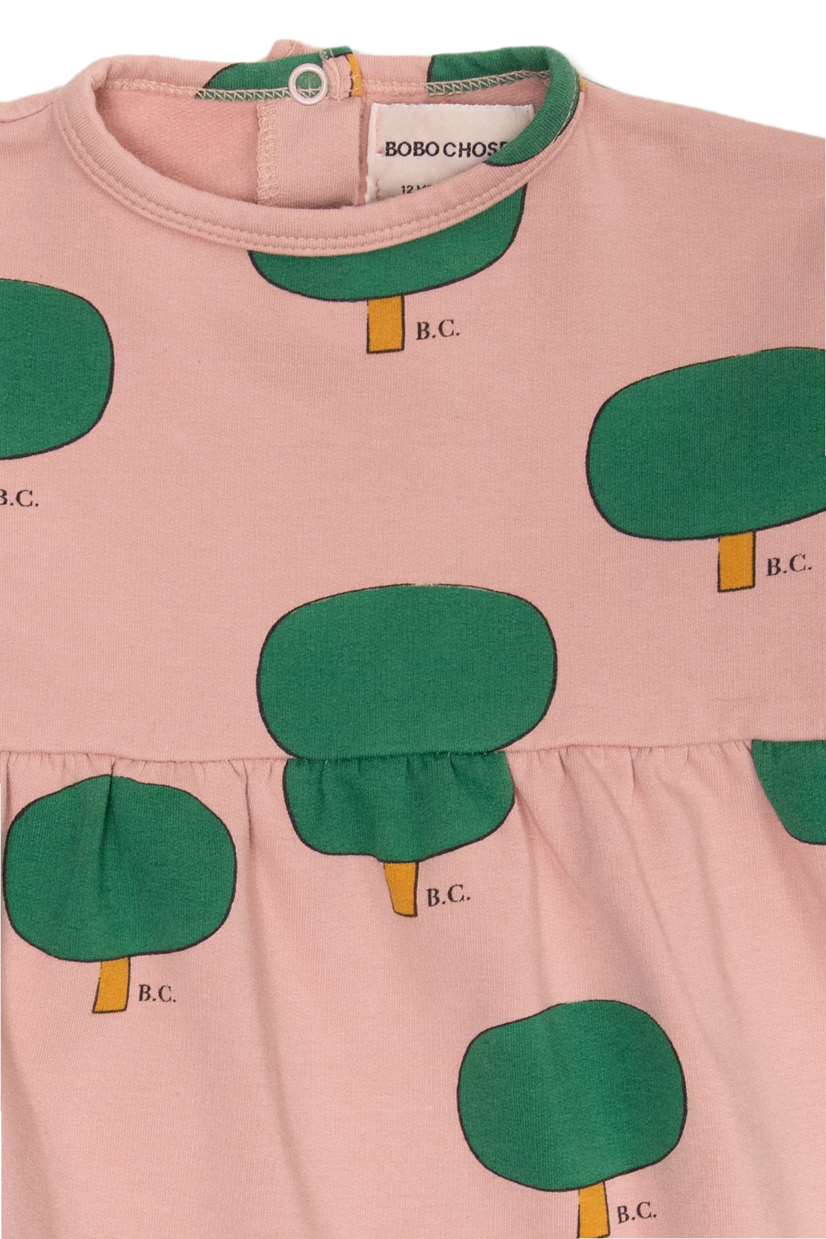 Pink dress from Bobo Choses. Made from organic cotton, this style fastens with snaps at the back and showcases a green and beige print with trees. It is complete with a round neck, long sleeves and ribbing on the edges.