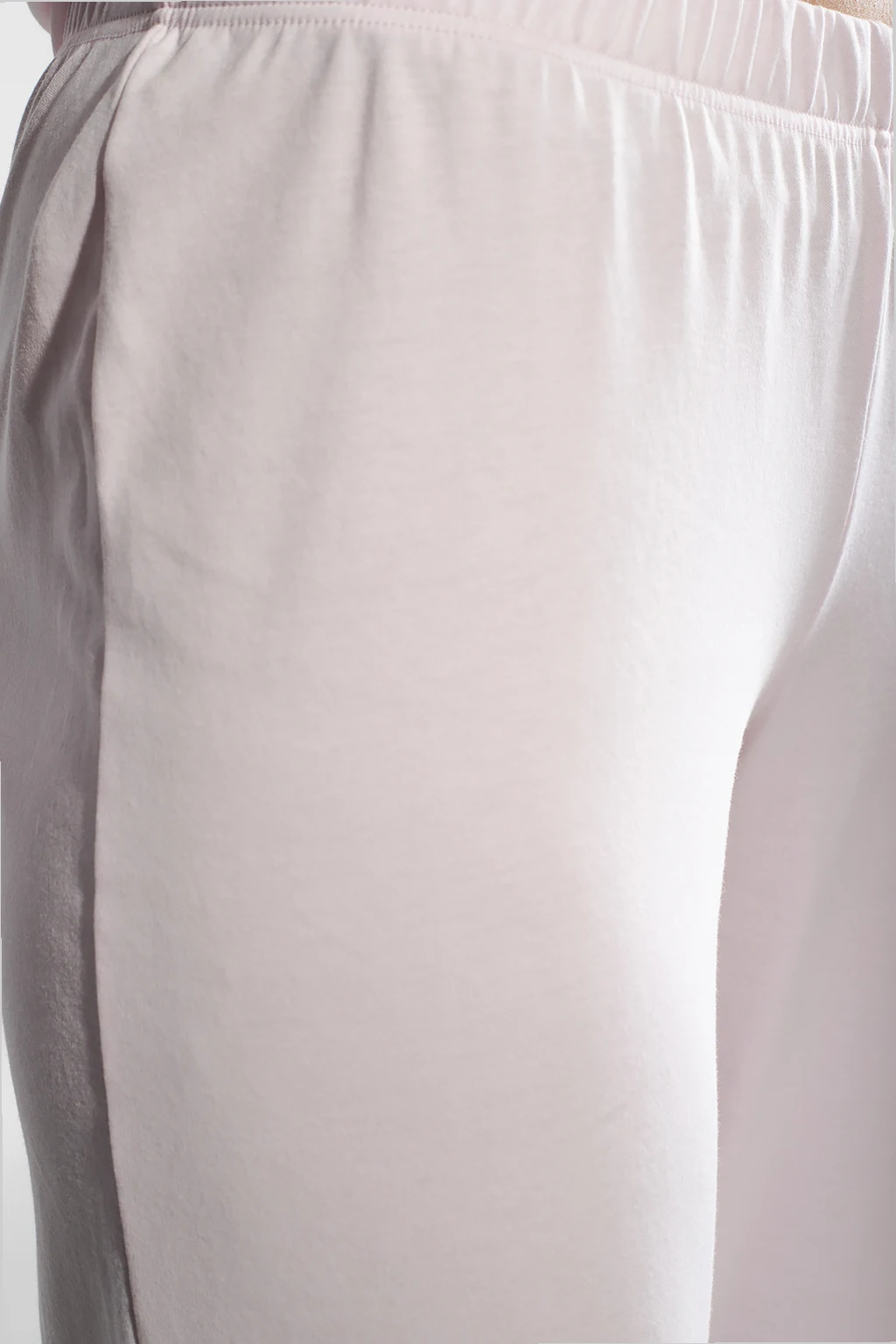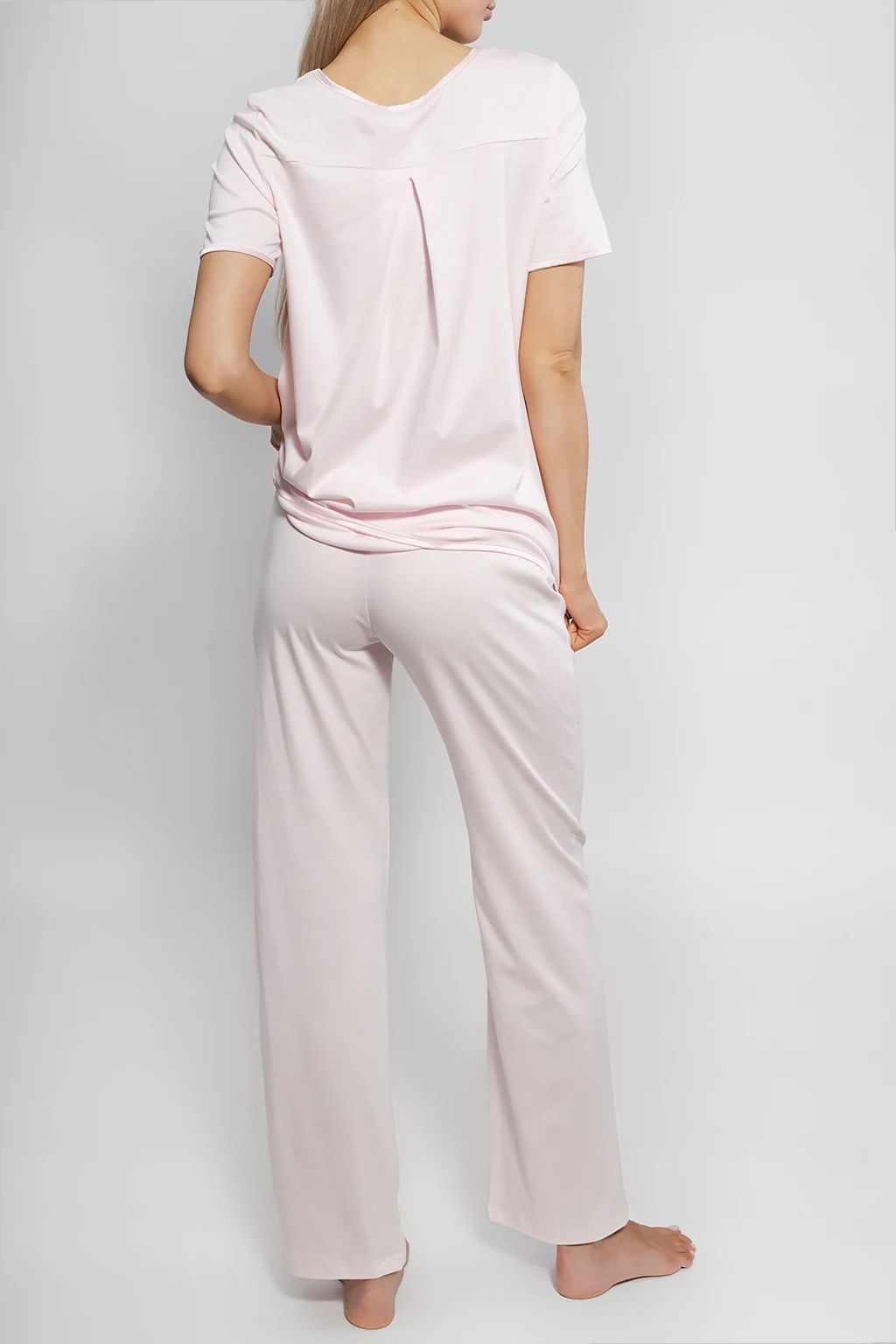 Pink ‘Cleo’ two-piece pyjama from Hanro. This set includes a V-neck top and long trousers with an elastic waistband.