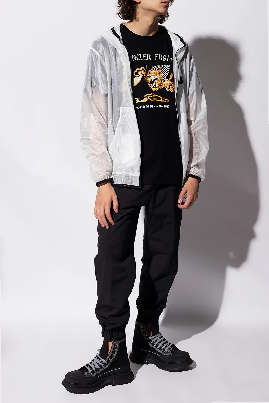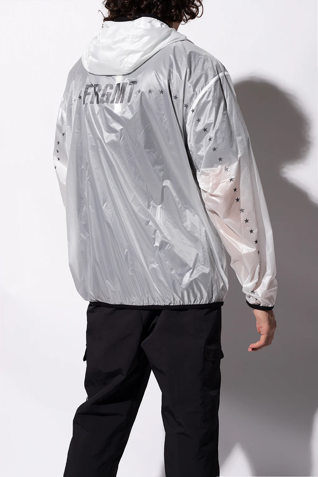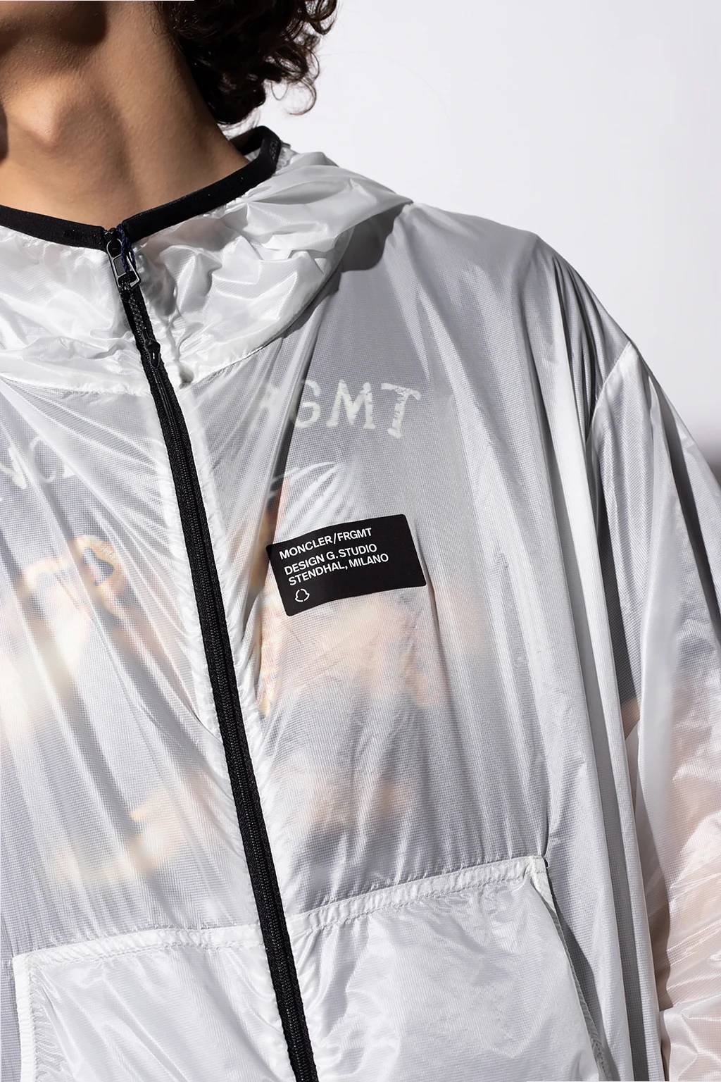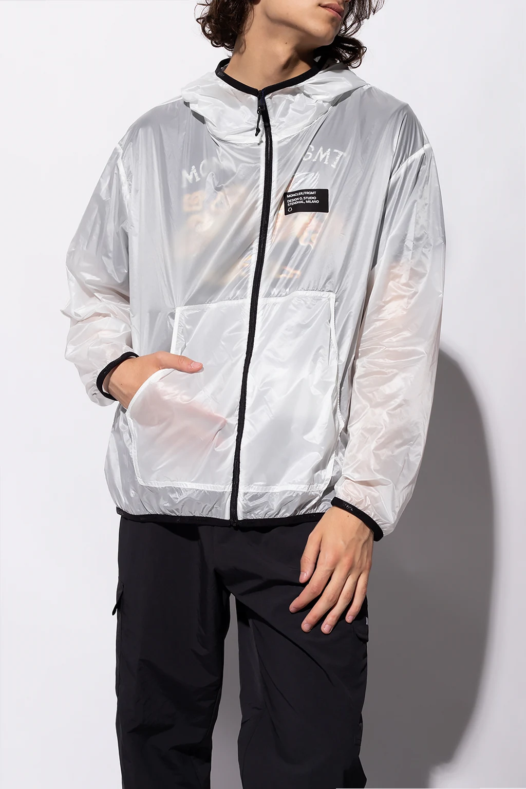 White and black ‘Mahpee’ transparent jacket with a hood from Moncler, the ‘Hiroshi Fujiwara 7’ collection. Printed with the brand's logo in black, this style features a zip fastening, long sleeves and two frontal pockets.