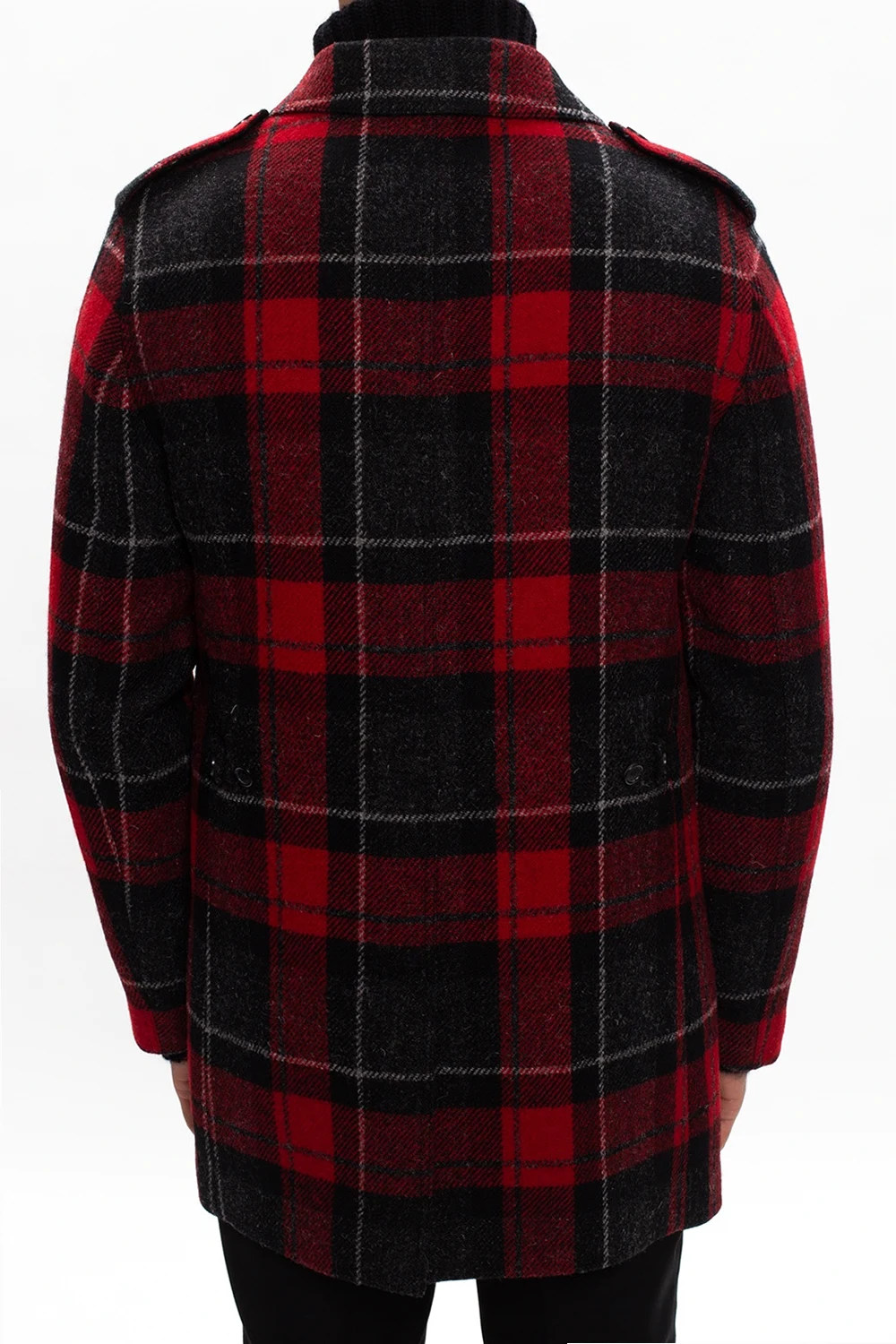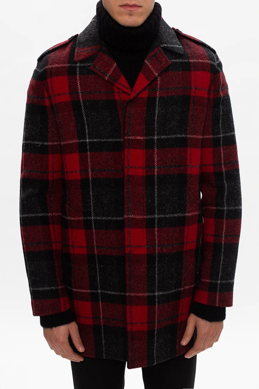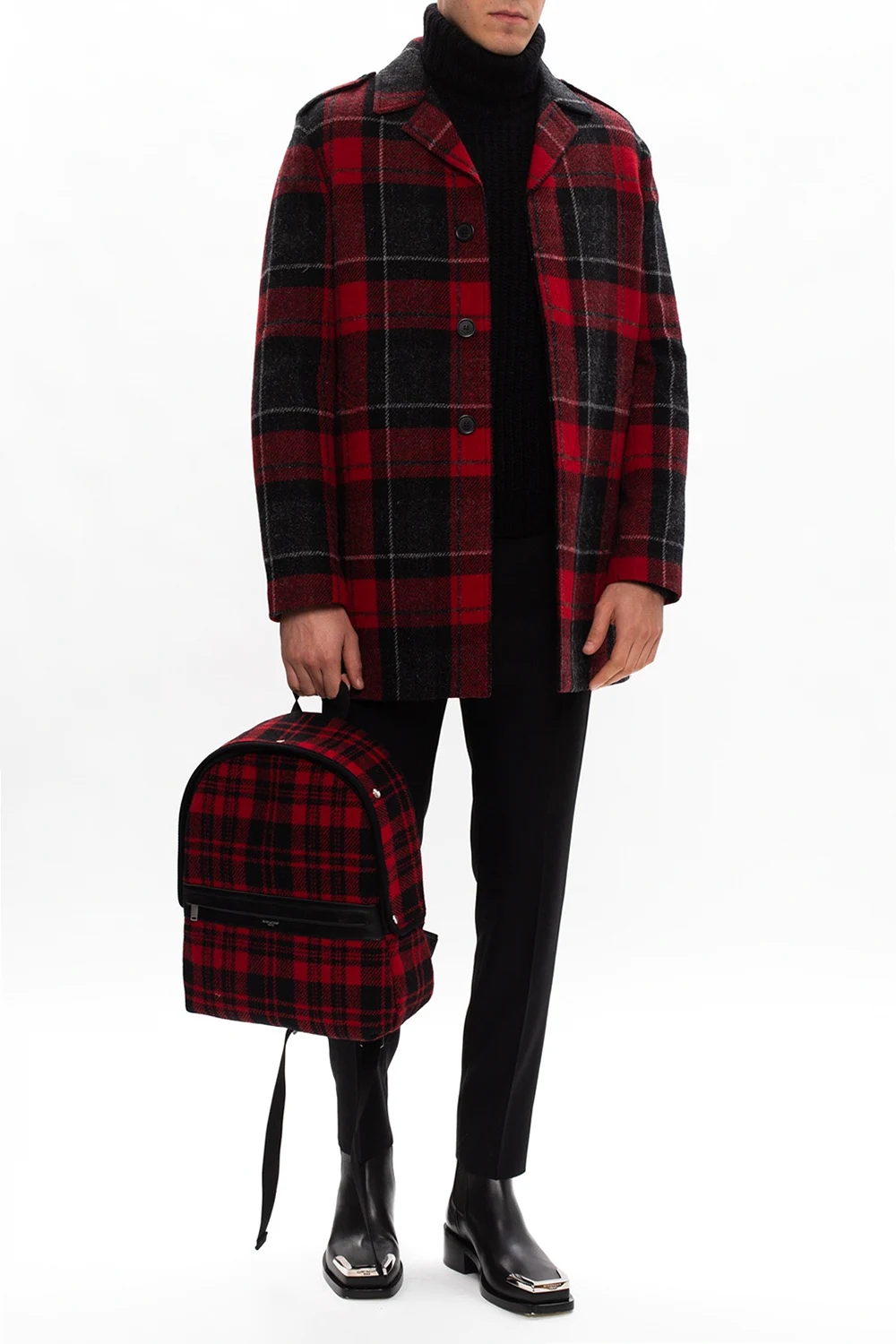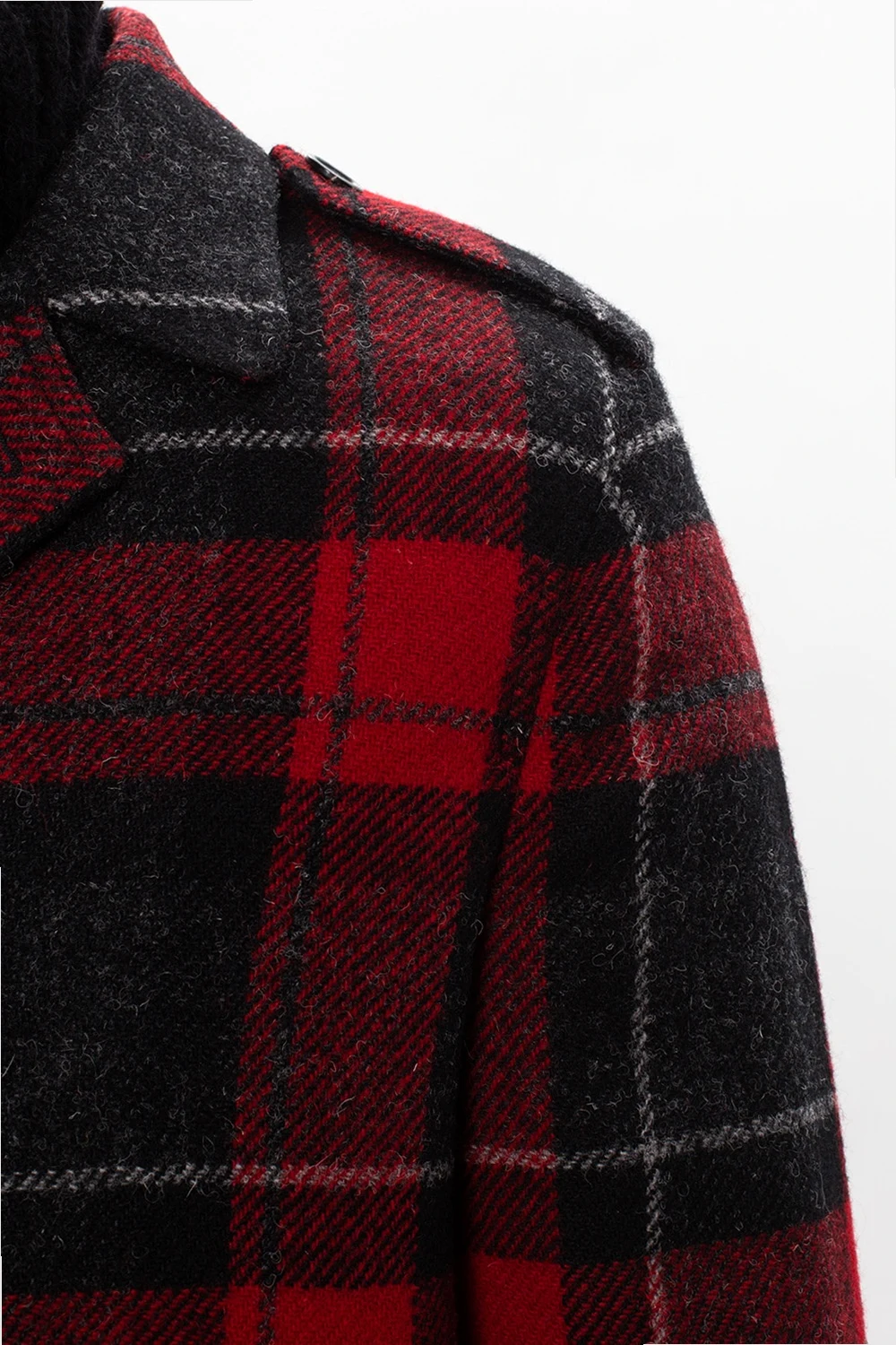 Red, black and white coat with notch lapels from Saint Laurent. Crafted from wool, this garment fastens with buttons and is complete with a check pattern, two front slip pockets and a slit at the back.