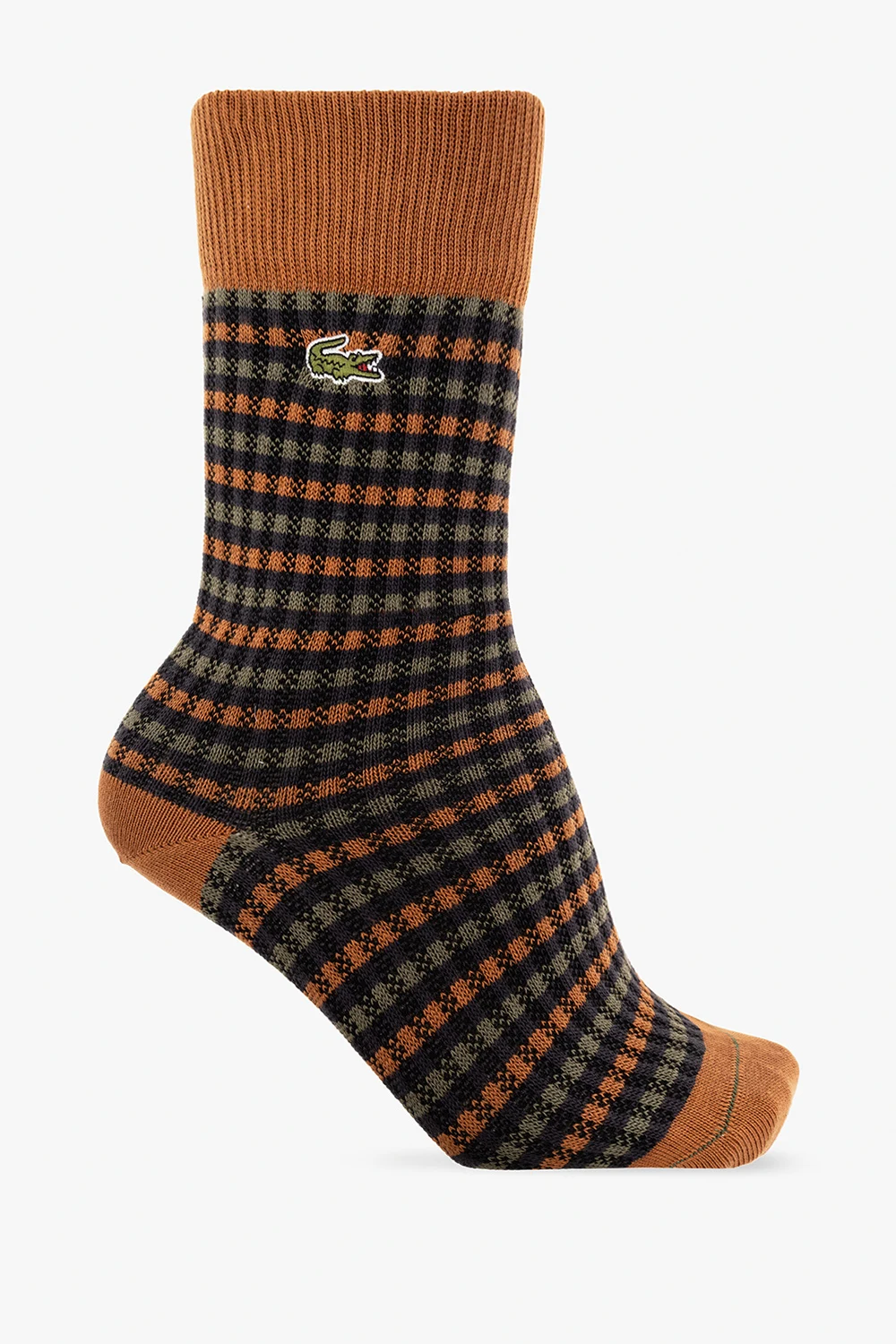 Orange, grey and brown-green-black socks three-pack from Lacoste. Crafted from a cotton blend, each pair features ribbed cuffs and logo patches – one has a stripe pattern.