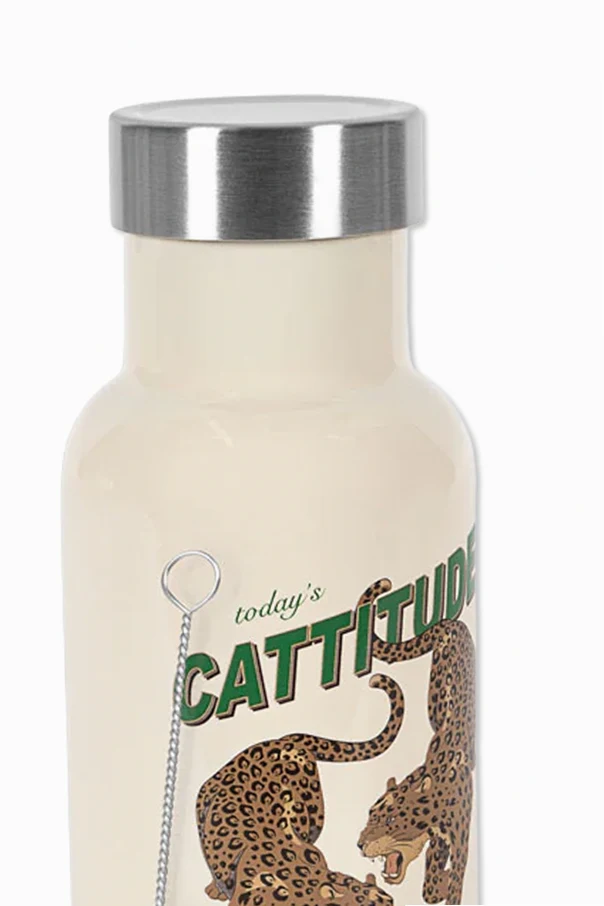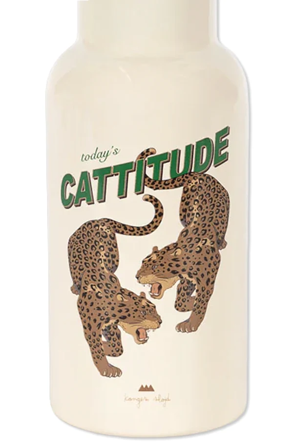 Thermoflasche mit farbigem Print ist eine meisterhafte Kombination aus klassischer Form und raffiniertem Design. Im cremefarbenen Ton gehalten, begeistert sie mit einer samtig glatten Oberfläche und einem auffälligen Print, der zwei dezent stilisierte Wildkatzen zeigt. Der zentral platzierte Slogan „today’s CATTITUDE“, mit einem betonten grünen Akzent, fasziniert und unterstreicht den einzigartigen Charakter des Produkts.