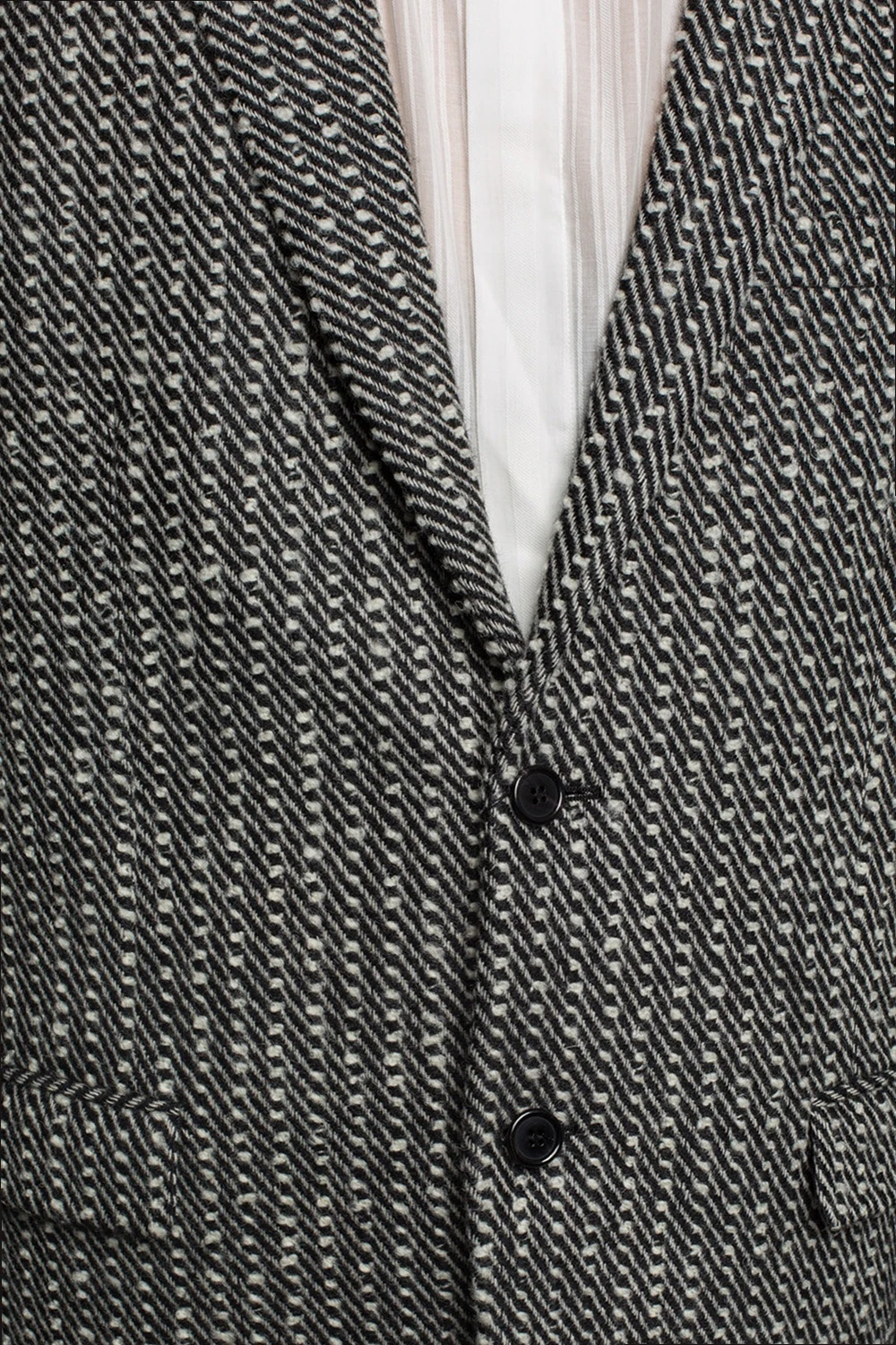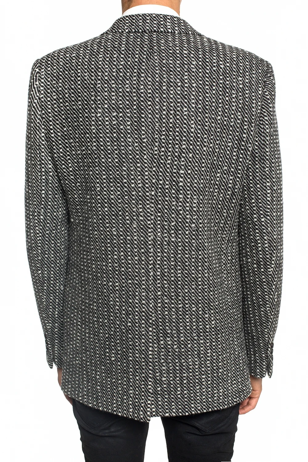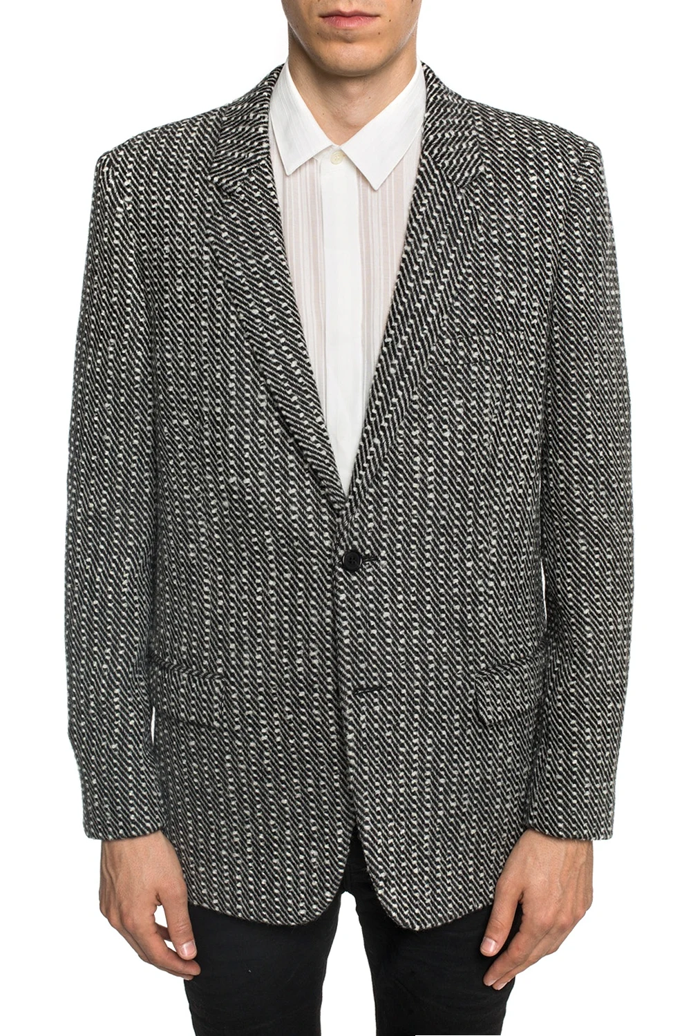 Black and white twill blazer with notched lapels from Saint Laurent. Made of wool. Fastened with buttons. Embellished with a texture throughout. It features 2 flap pockets and 1 slip pocket on the front, single split vent on the back and silk lining.