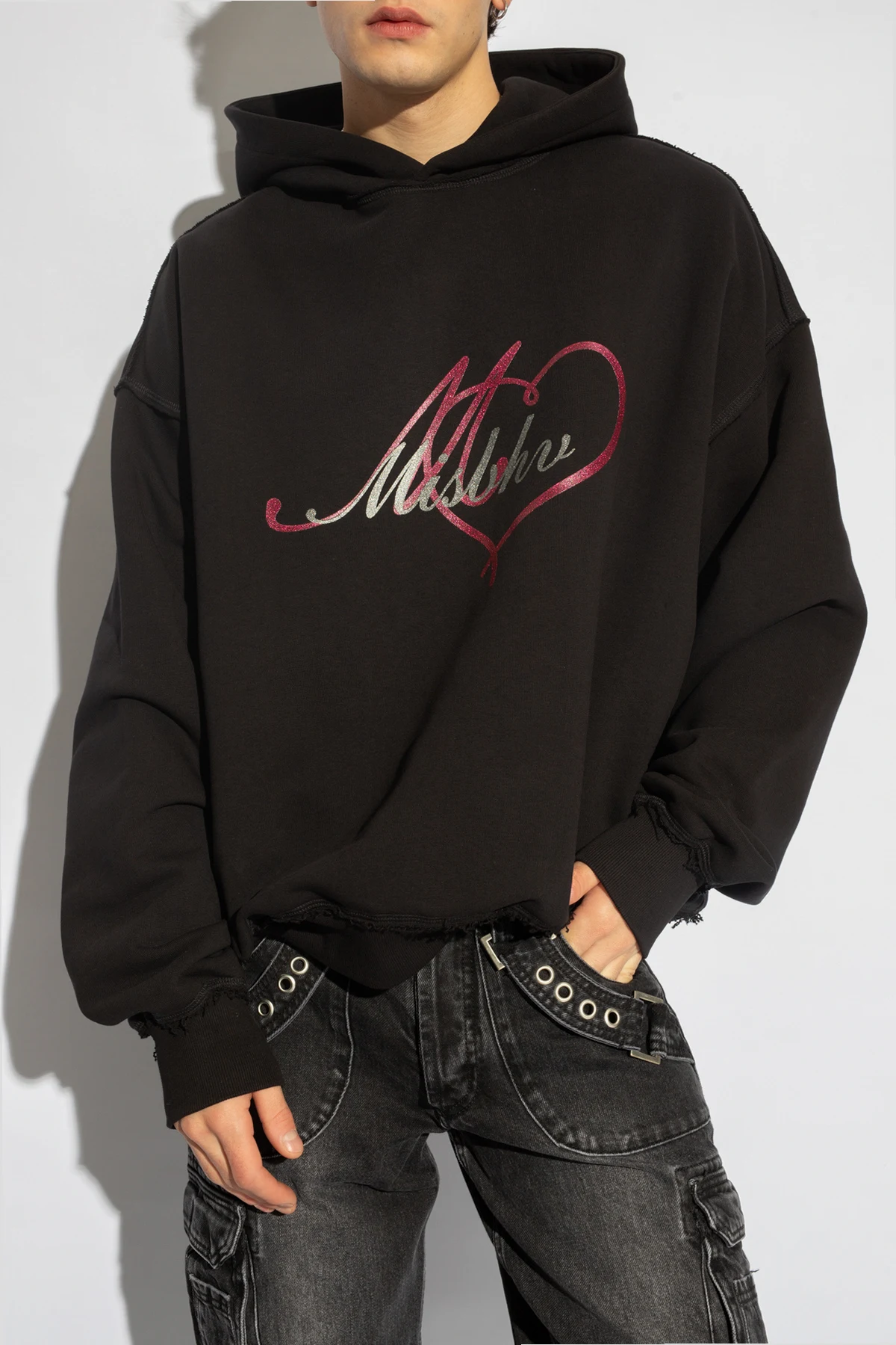 Black ‘I Love’ hoodie from MISBHV, the ‘Clear Light Of Bliss’ collection. Made of cotton, this design features a logo print, raw trims and ribbed trims at the hem and cuffs.