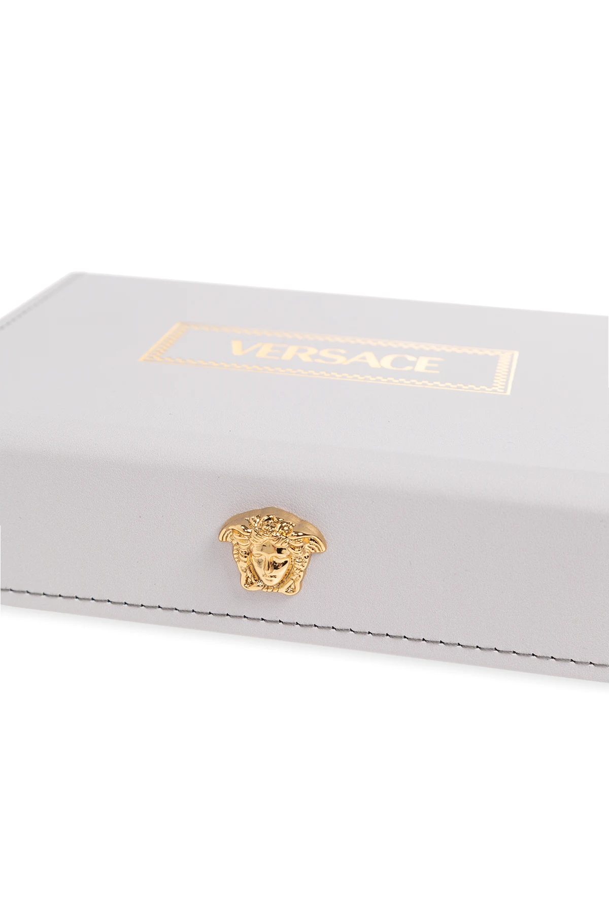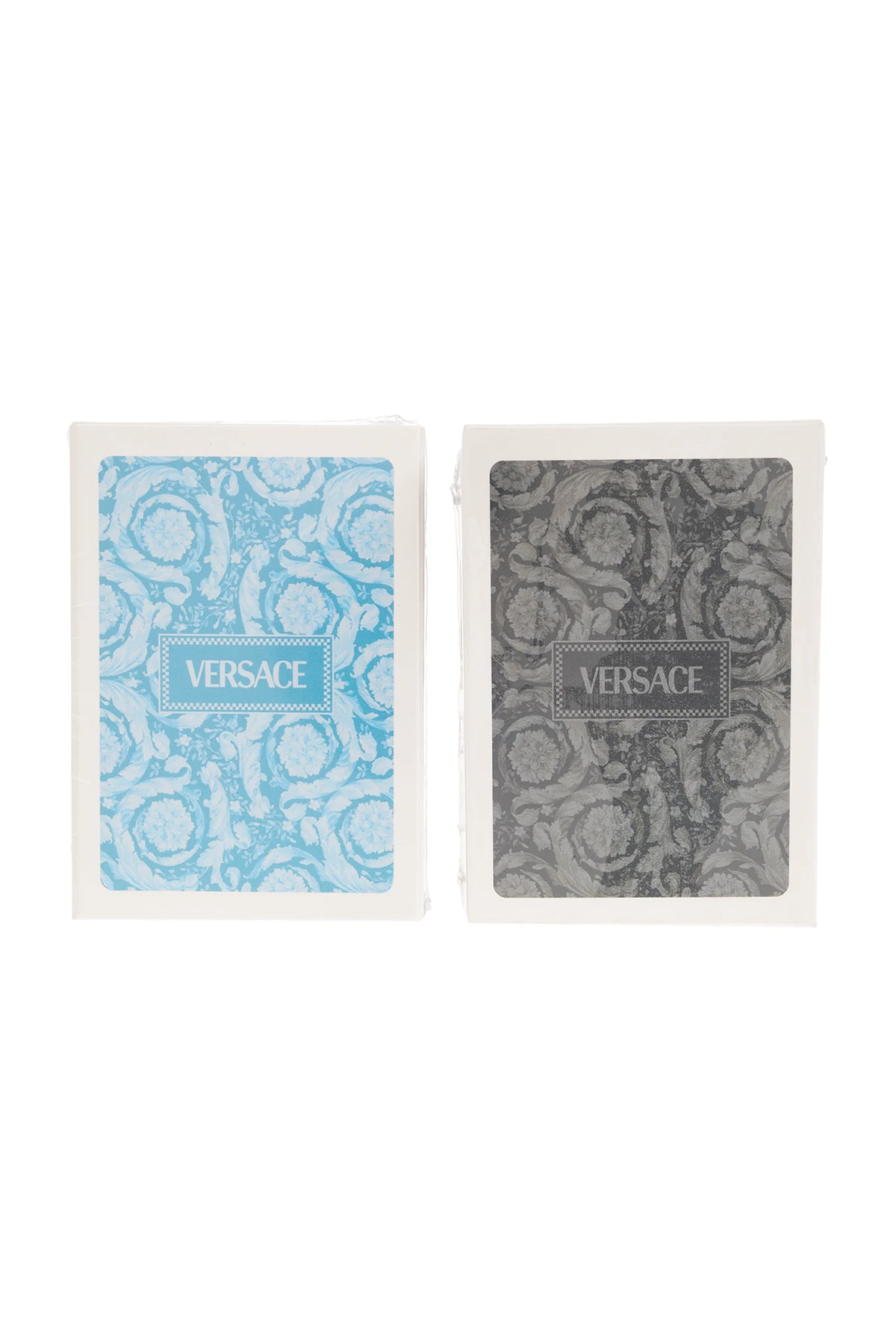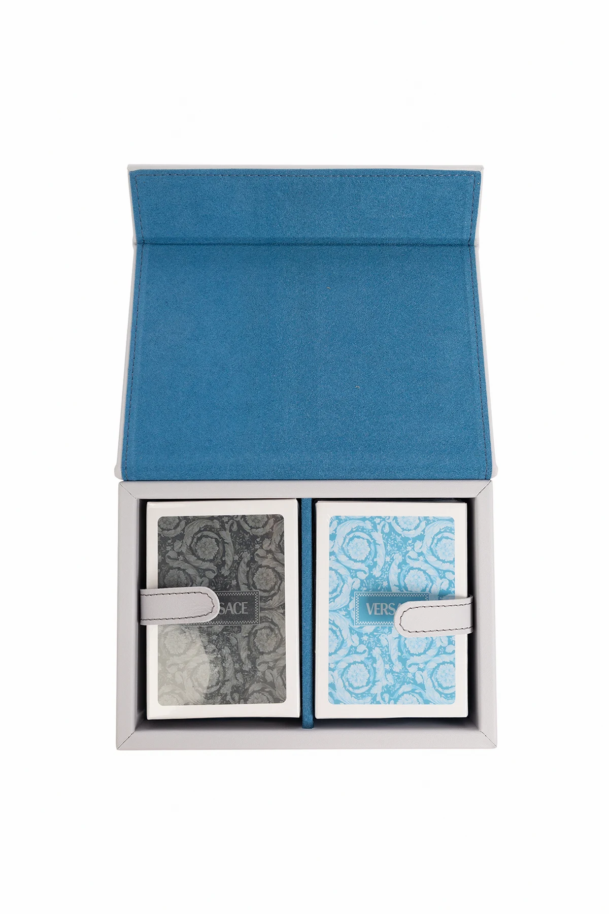 Two decks of playing cards in white & blue and white & grey from Versace Home. They come with a light grey calf leather case with a magnetic fastener, signature Medusa face detailing and a printed gold-tone logo.