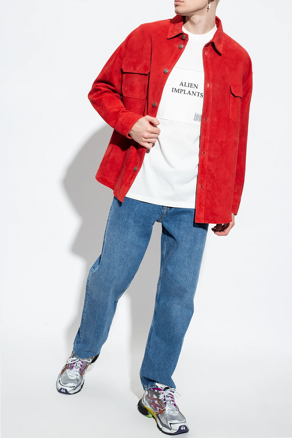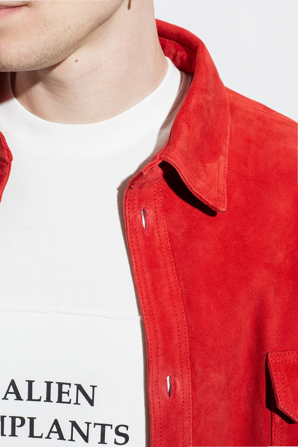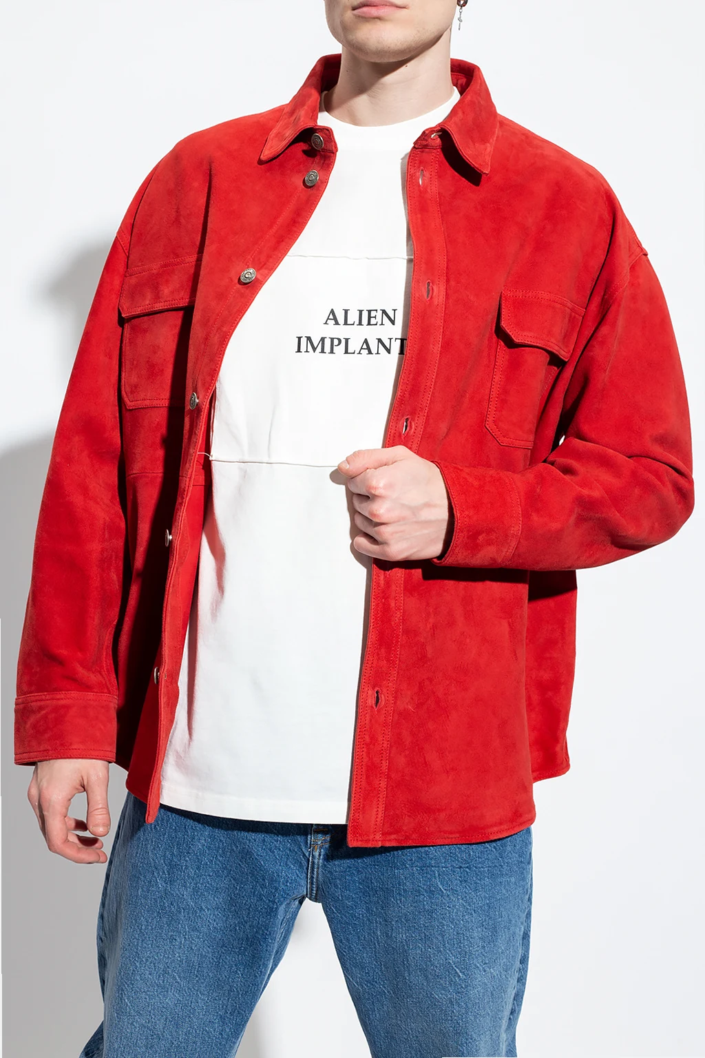 Red shirt from 424. Made of lamb leather, this style features button fastenings, two flapped pockets, long sleeves with button cuffs and a red and black logo patch on the back.