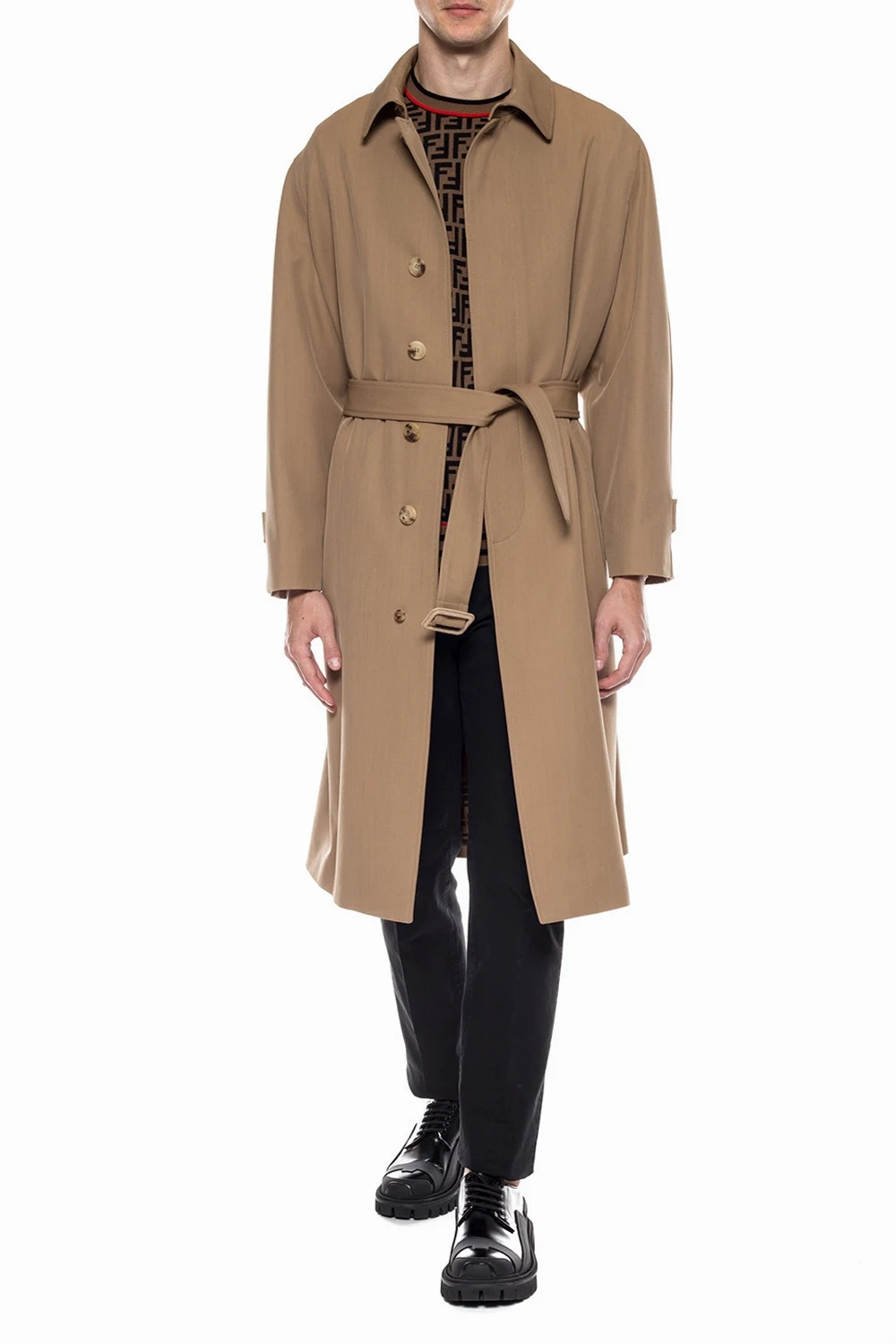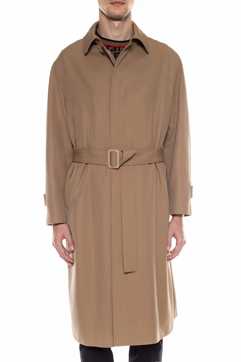 Beige trench coat from Fendi. Made of wool. Fastened with buttons with a concealed placket. Buckle belt at the waist. Single rear vent. Brown silk lining featuring a logo.