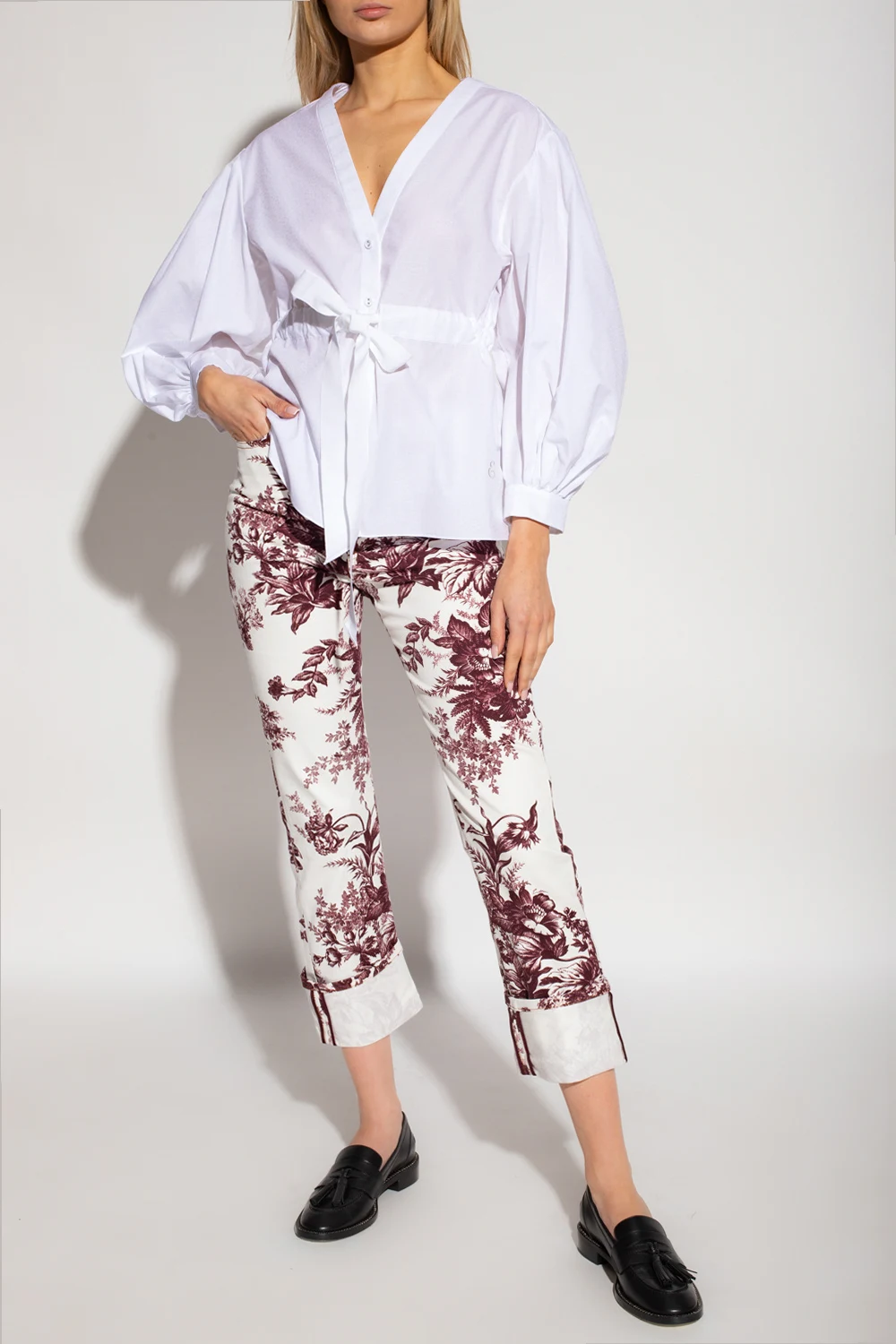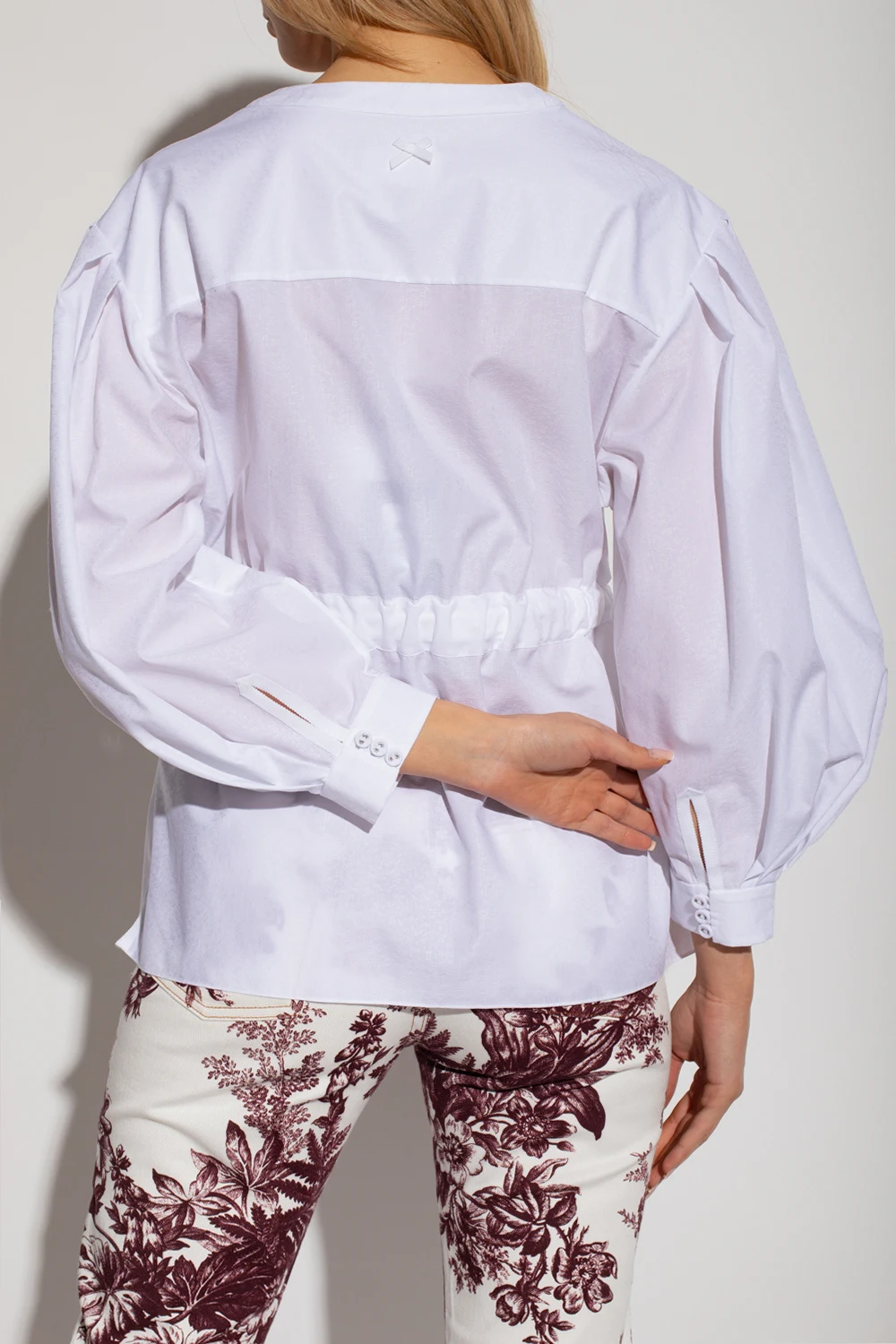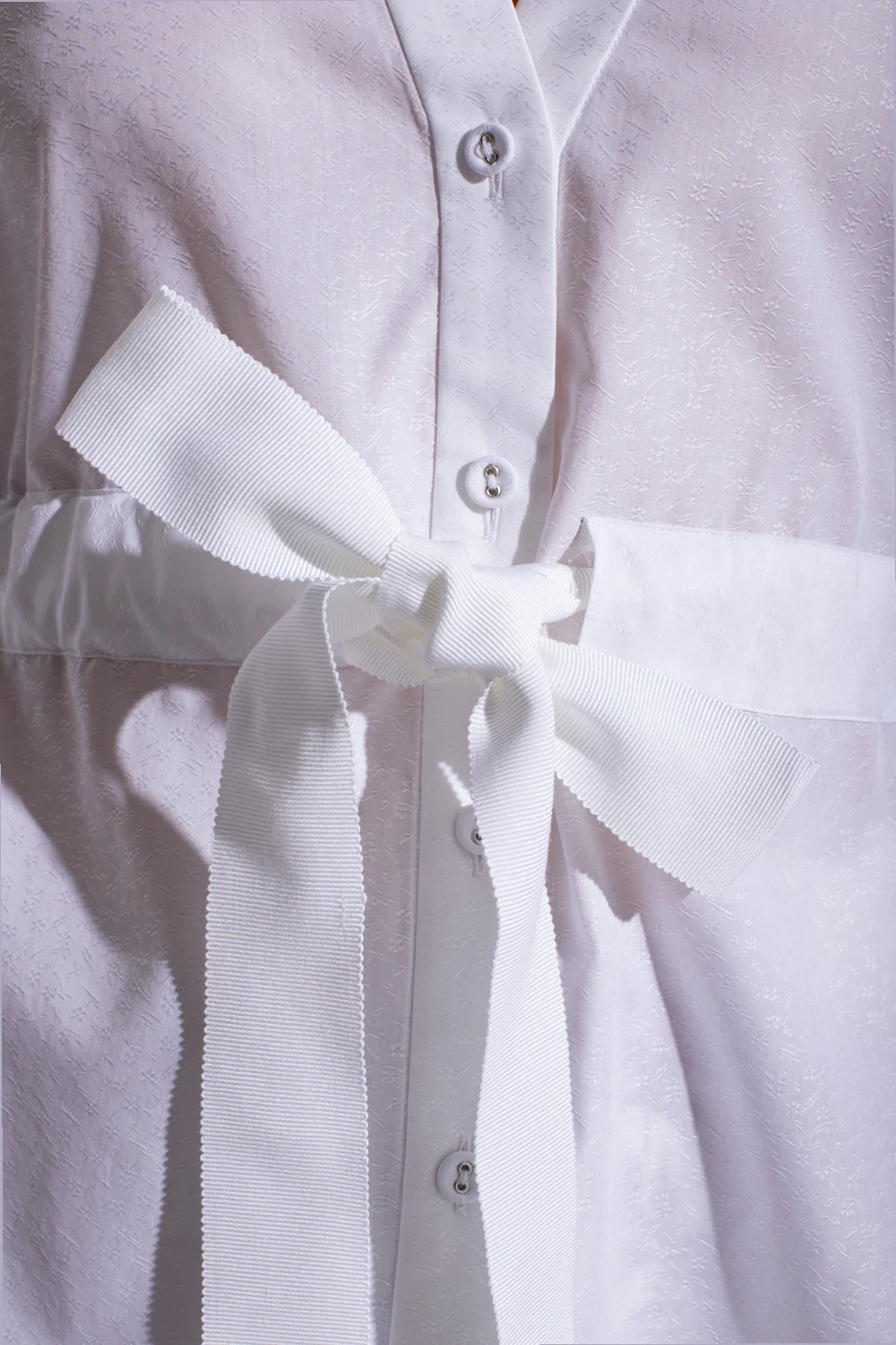 White ‘The Robe’ shirt from Erdem. Made of cotton. Fastened with buttons and a waist belt, this design features a subtle jacquard floral motif, logo embroidery, bow appliqué at the back, V-neck and puff sleeves with button cuffs.
