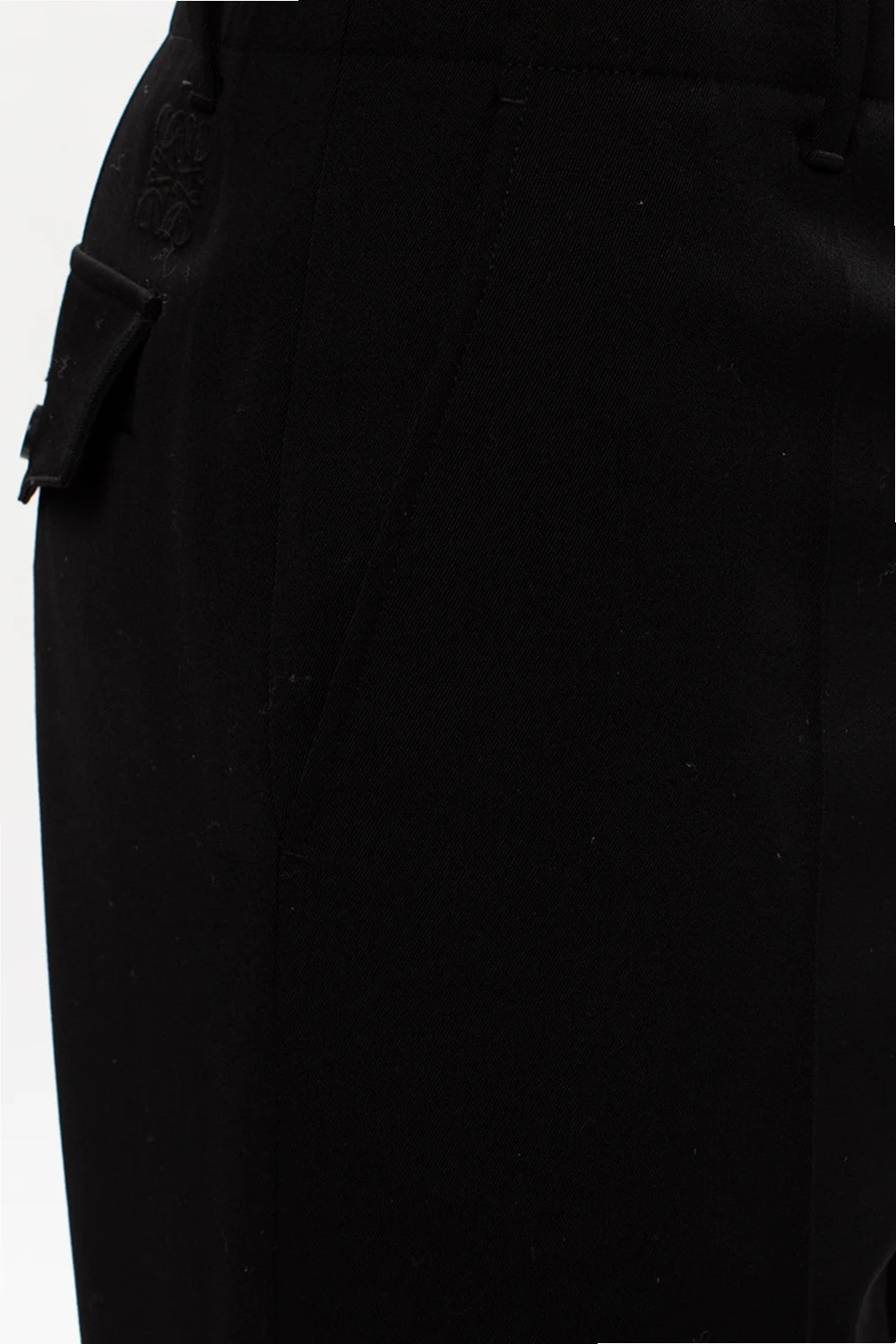 Black pleat-front trousers from Loewe. Made of wool and fastened with a zip and a button, this tapered leg design is complete with a logo embroidery, two front slip pockets and a buttoned flap pocket at the back.