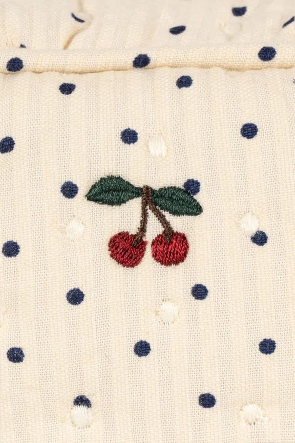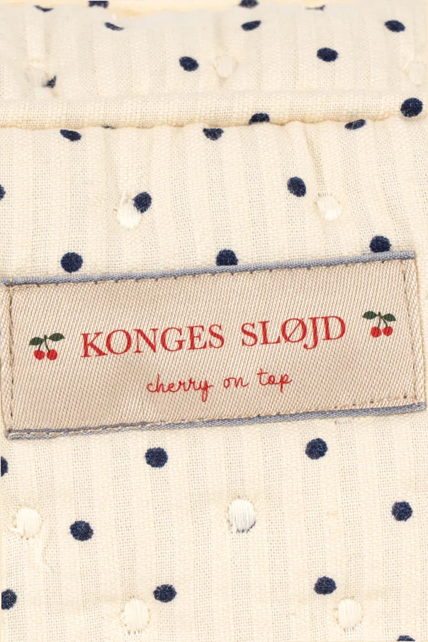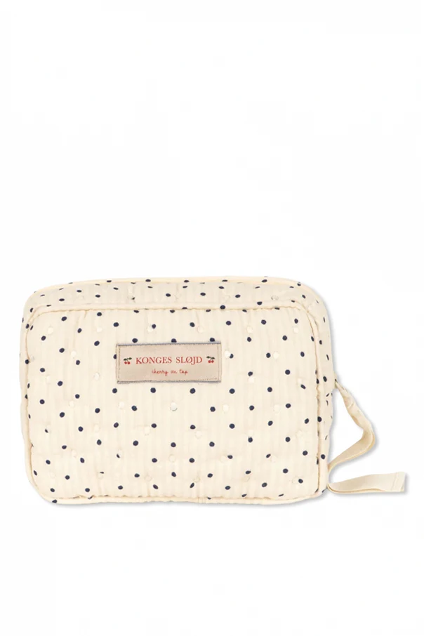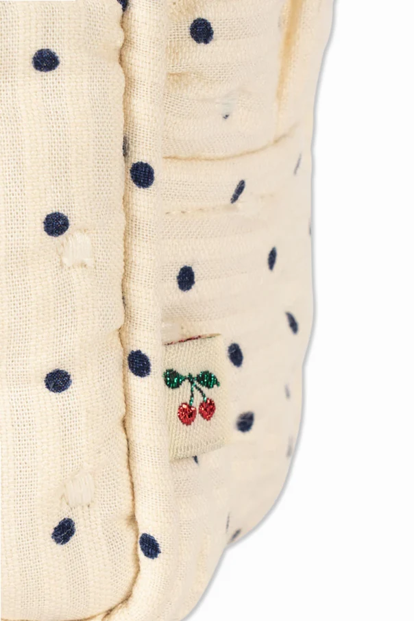Die Baumwoll-Kosmetiktasche mit Punktemuster der Marke Konges Sløjd verkörpert subtile Eleganz und praktisches Design. Ihr sanft-rechteckiges Format mit weich abgerundeten Ecken begeistert durch eine außergewöhnliche Steppung und die samtige Haptik hochwertiger Baumwolle. Die cremefarbene Oberfläche ist mit einem gleichmäßigen Muster aus feinen, marineblauen Punkten verziert, die den zeitlosen und raffinierten Charakter dieses Produkts unterstreichen.