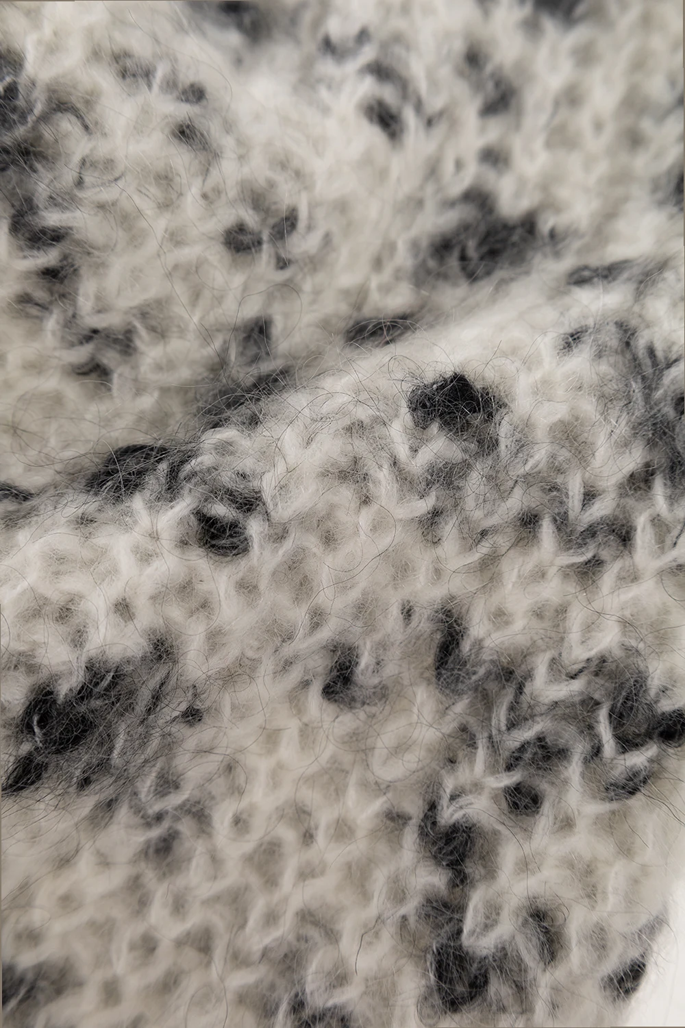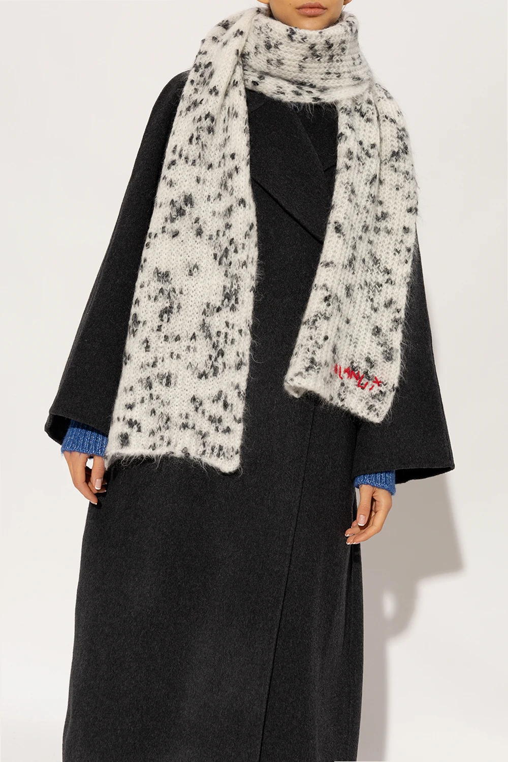White and black ‘Icelandic Glacier’ scarf from Alanui. Crafted from a mohair and wool blend, this item features red logo embroidery.