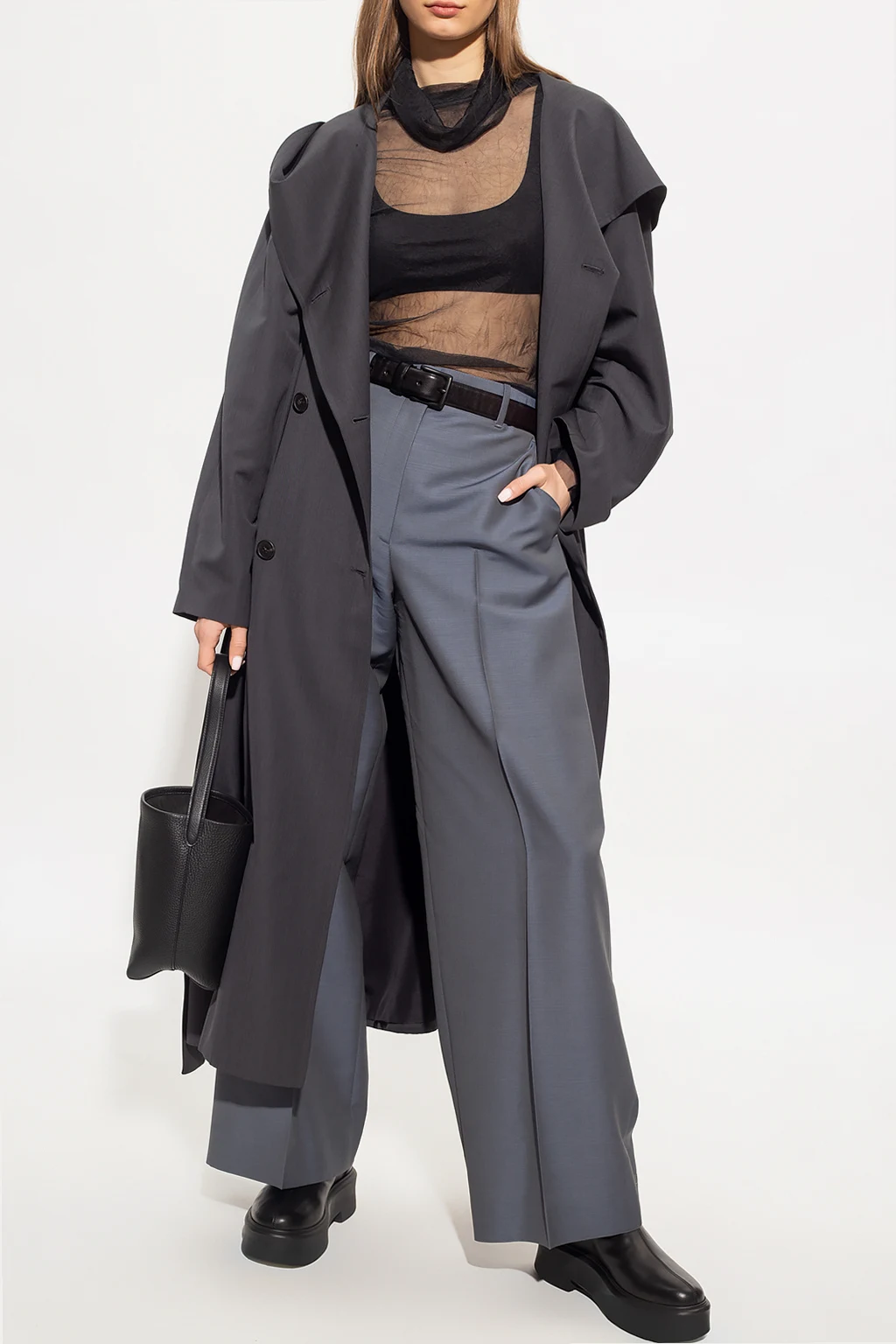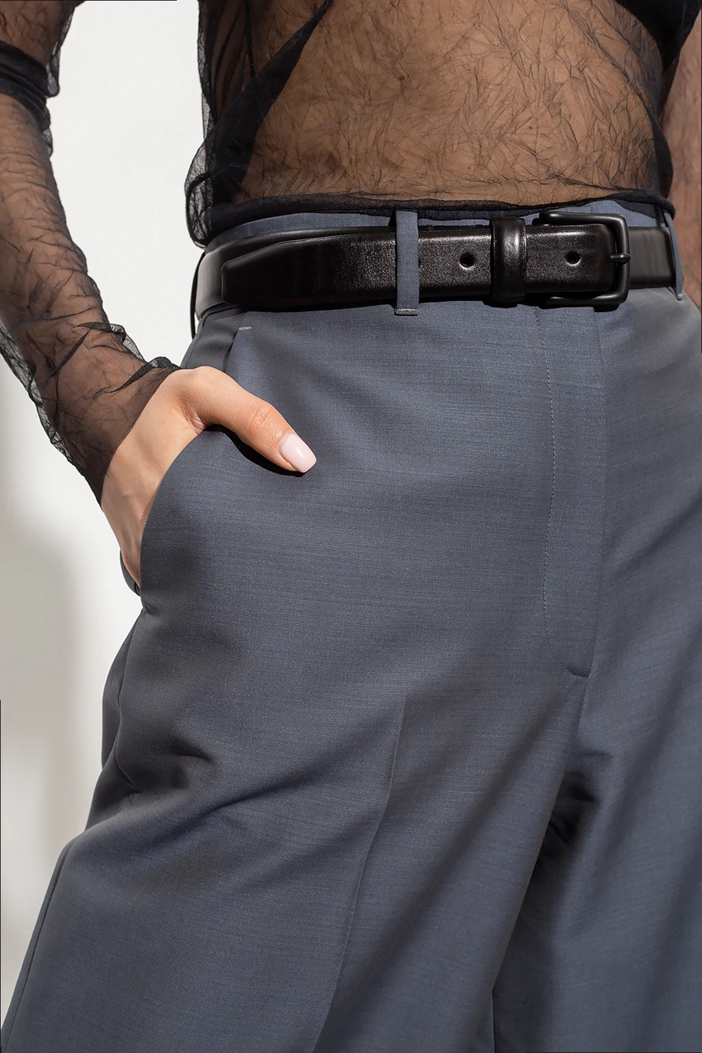 Greyish blue ‘Triny’ pleat-front trousers from The Row. Crafted from a wool and mohair blend, this straight leg design features a zip and hook closure and four slip pockets.