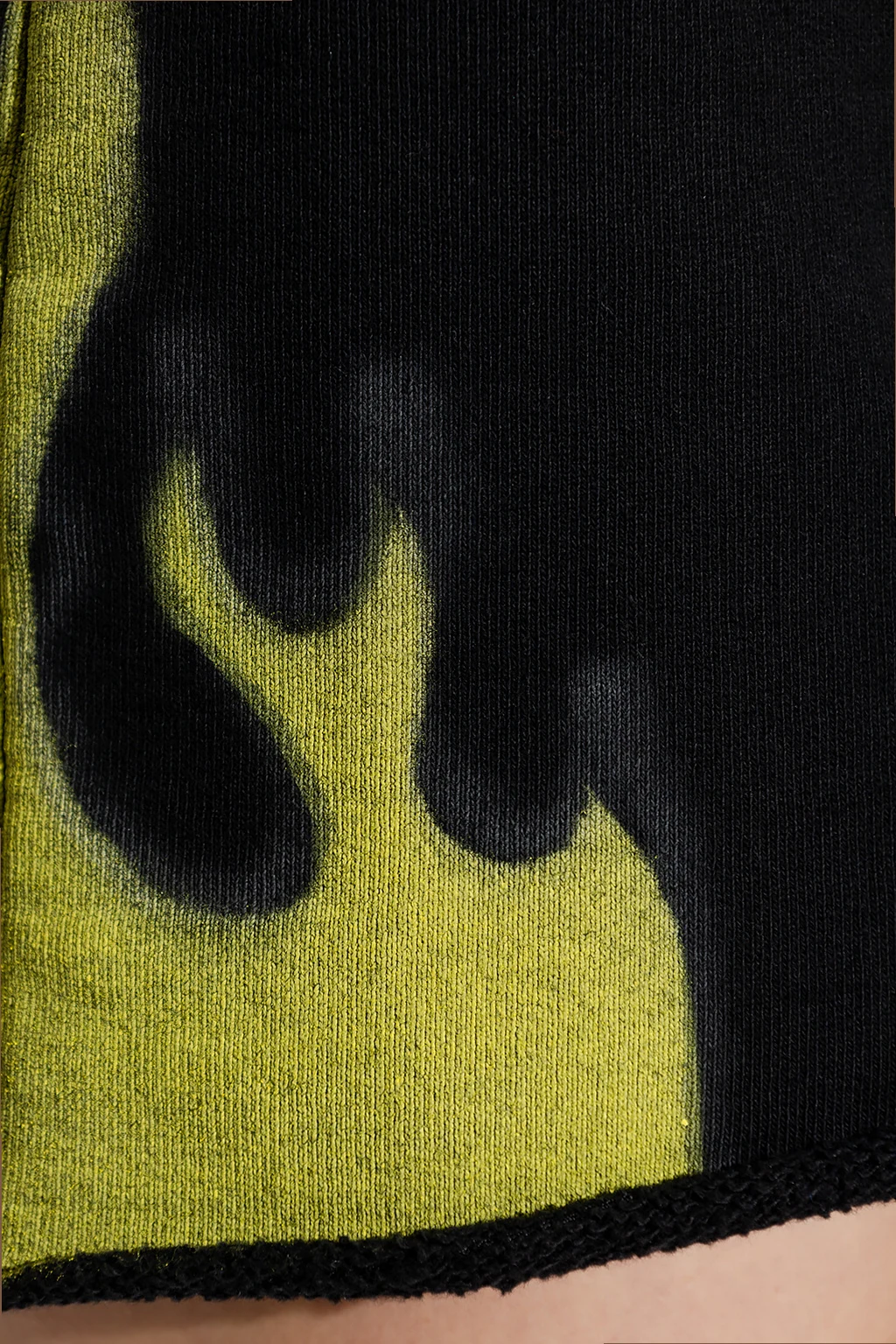 Black mini skirt from Heron Preston. Made of cotton, this design features an elastic drawstring waist, green flame prints on the sides, orange and black logo patch at the back and raw cut edges.