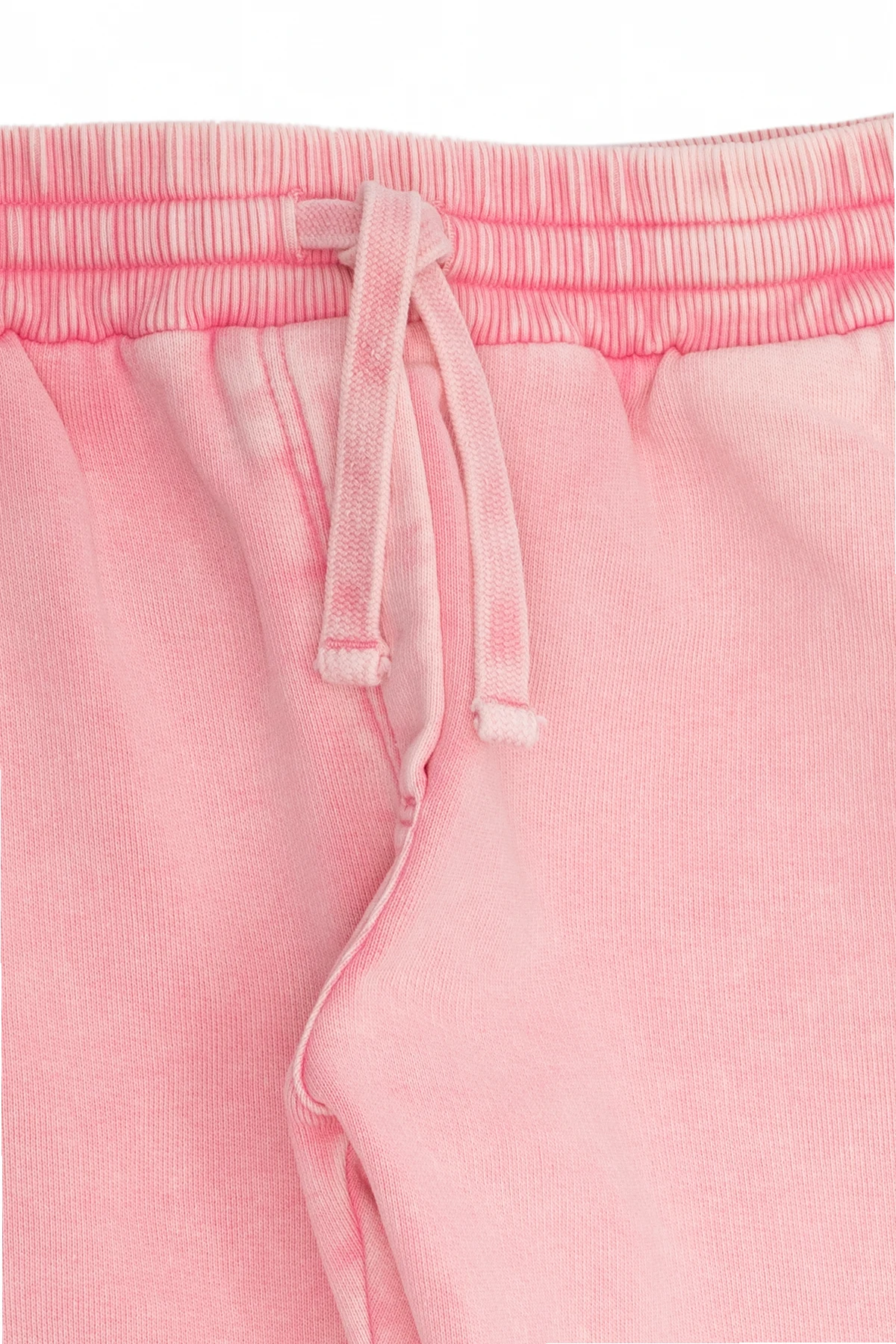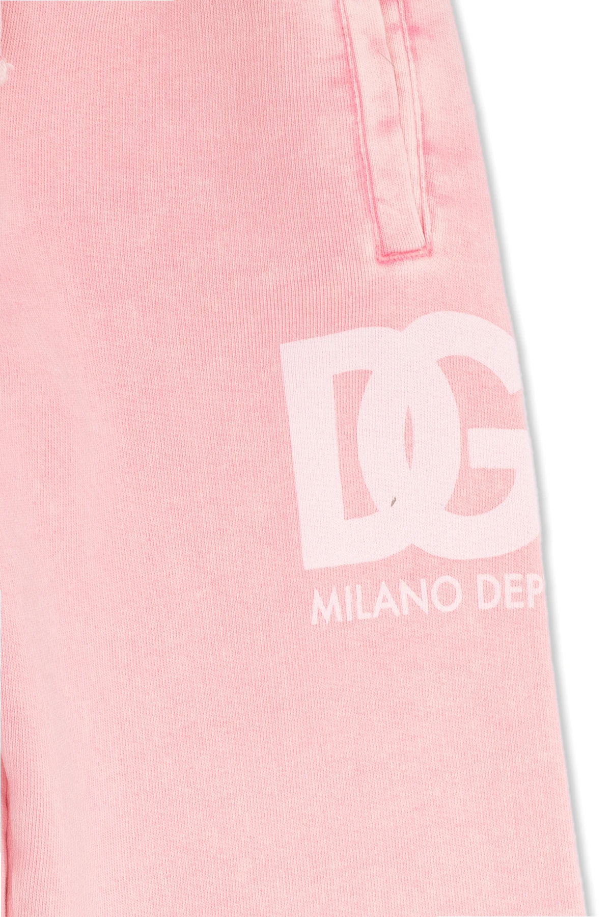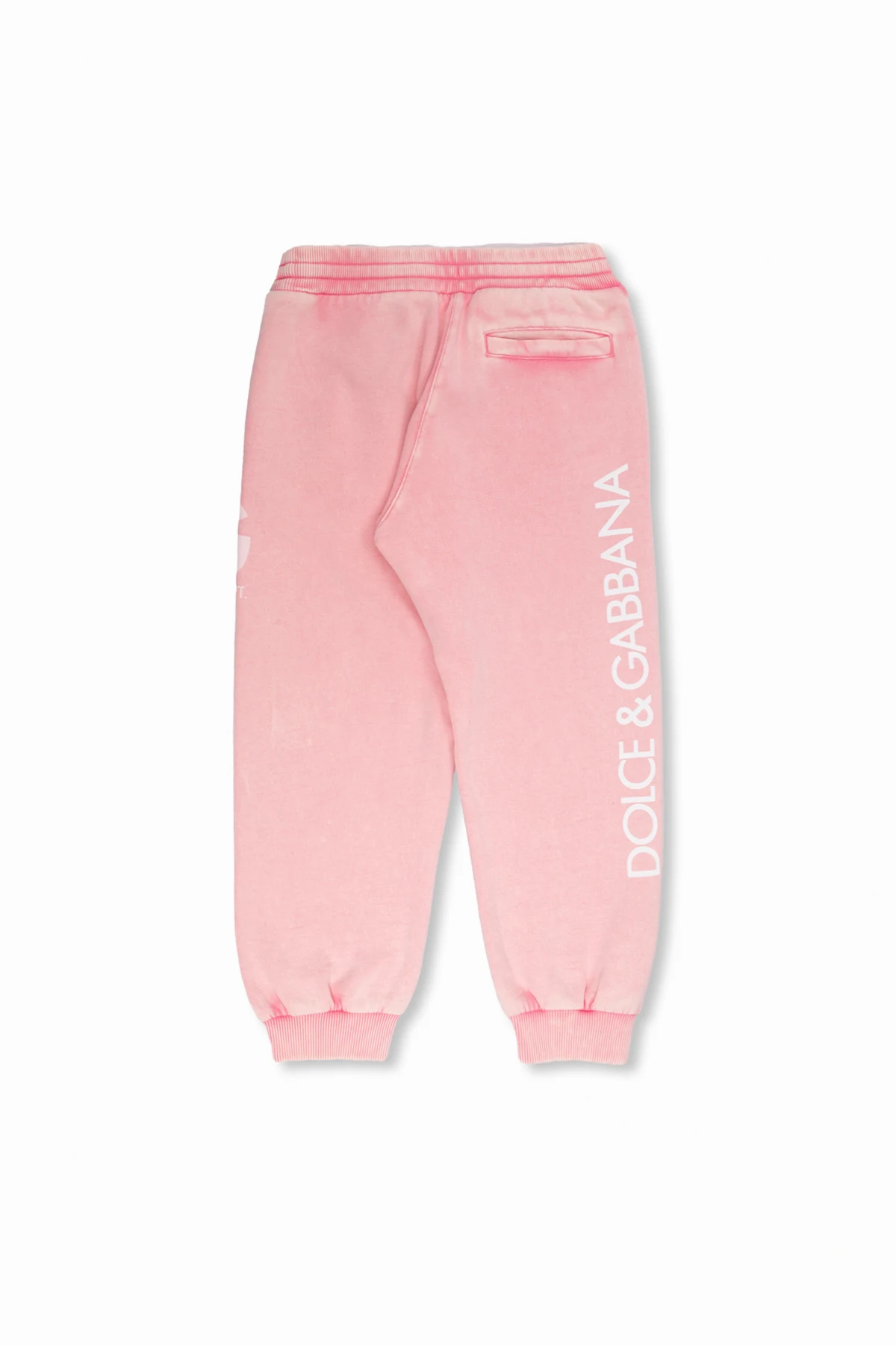 Pink sweatpants from Dolce & Gabbana Kids. Made from washed cotton, this pair is cinched with drawstrings at the waistband and showcases a white logo on the front and back, three slip pockets and elasticated cuffs.