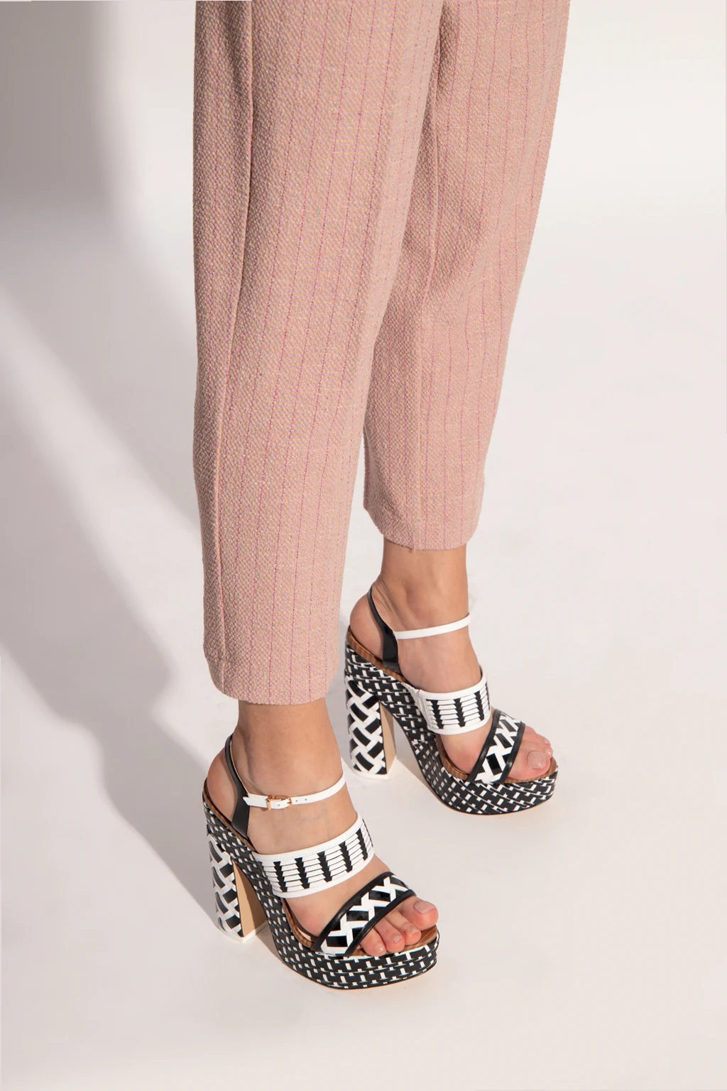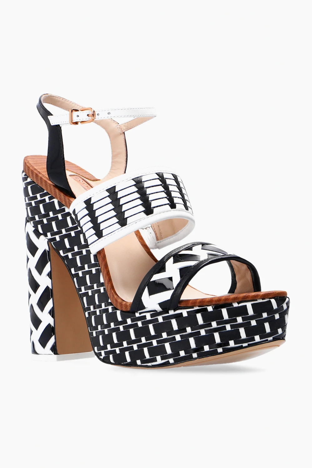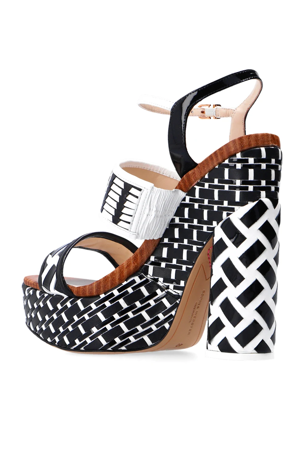 Brown, black and white ‘Celia’ platform sandals from Sophia Webster. Crafted from leather, they feature geometrical inserts and a buckle strap at the ankle.