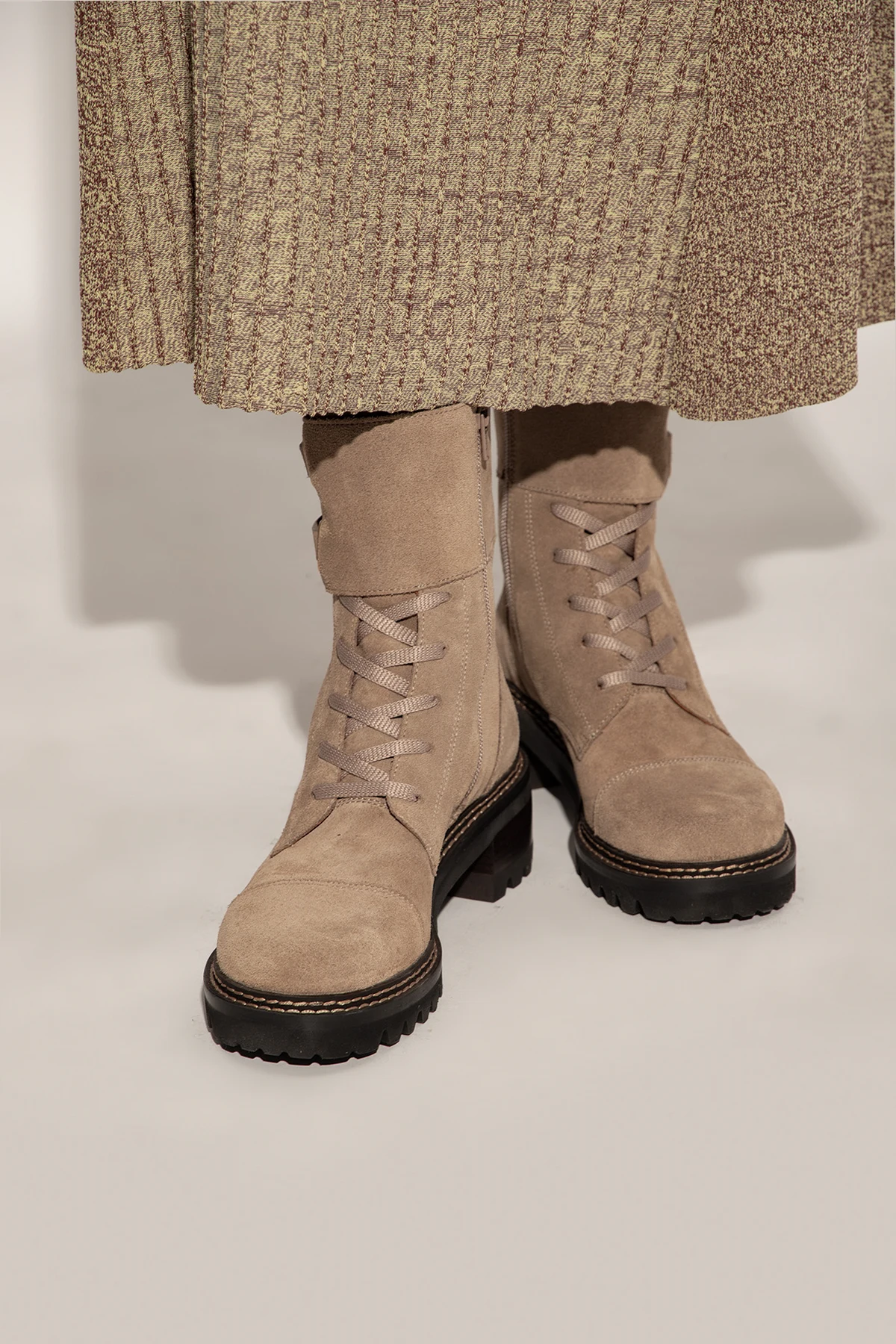 Beige ‘Mallory’ ankle boots from See By Chloe. Made of suede, this lace-up model sits on a black rubber sole and features a side zipper and decorative buckle straps at the hem.