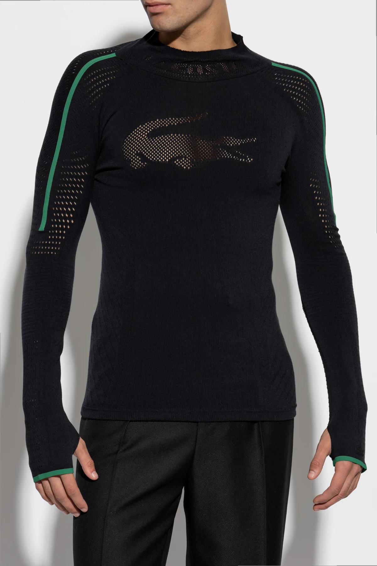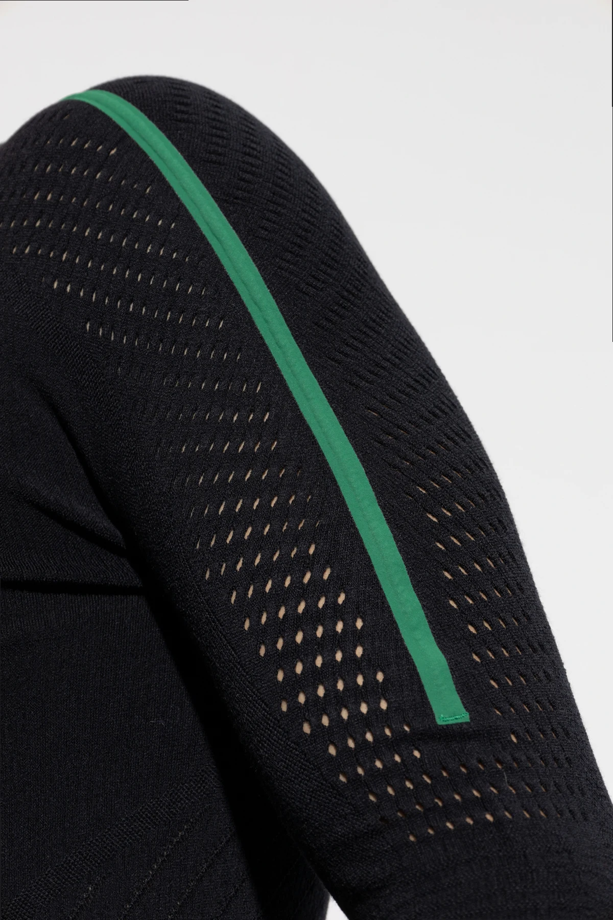 Auf der Vorderseite des Tops befindet sich das charakteristische Krokodillogo, das aus feinen Perforationen besteht und ihm einen einzigartigen Stil verleiht. Ein grüner Streifen, der entlang der Ärmel verläuft, sowie grüne Paspeln an den Manschetten sorgen für einen Kontrast, der die Blicke auf sich zieht.