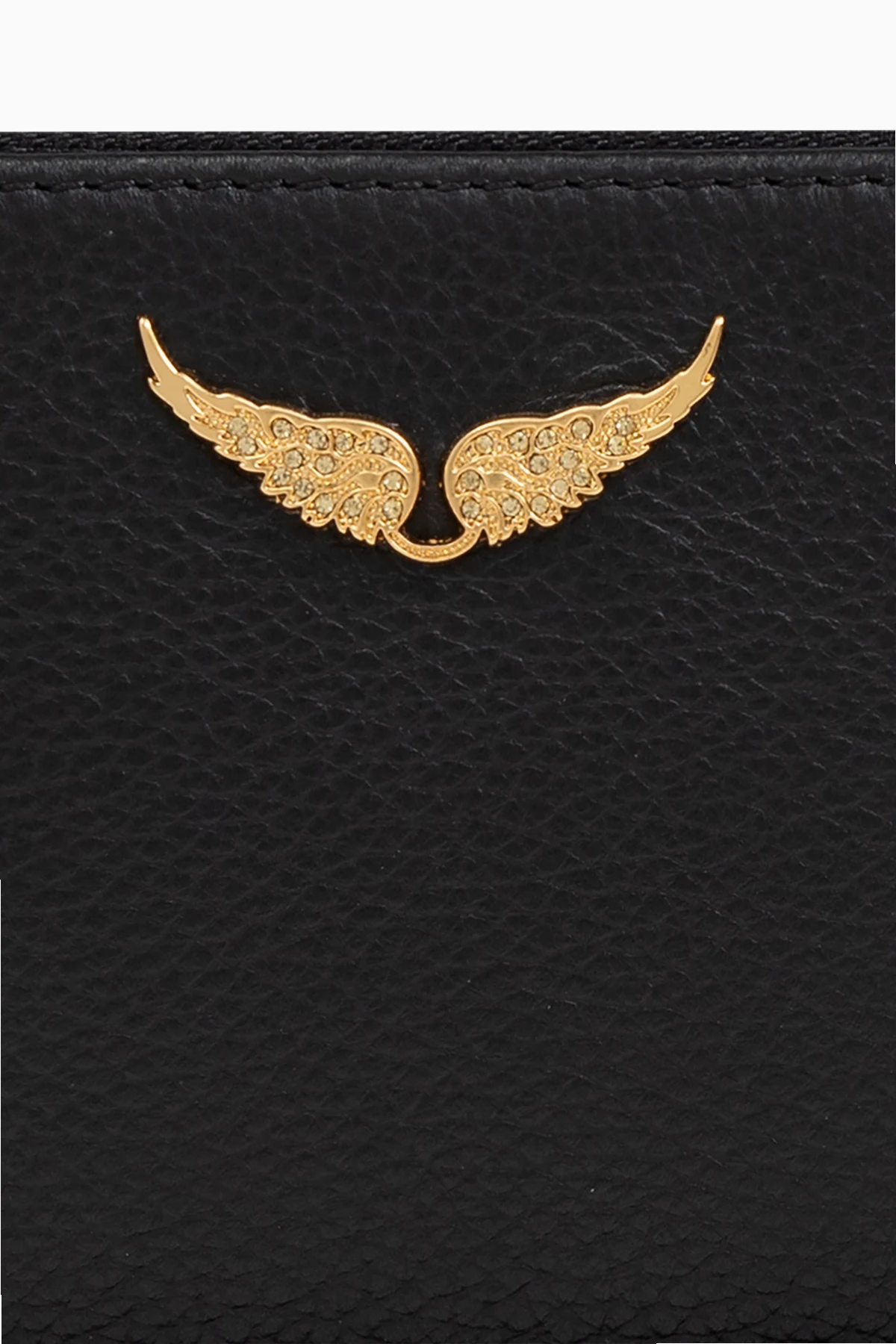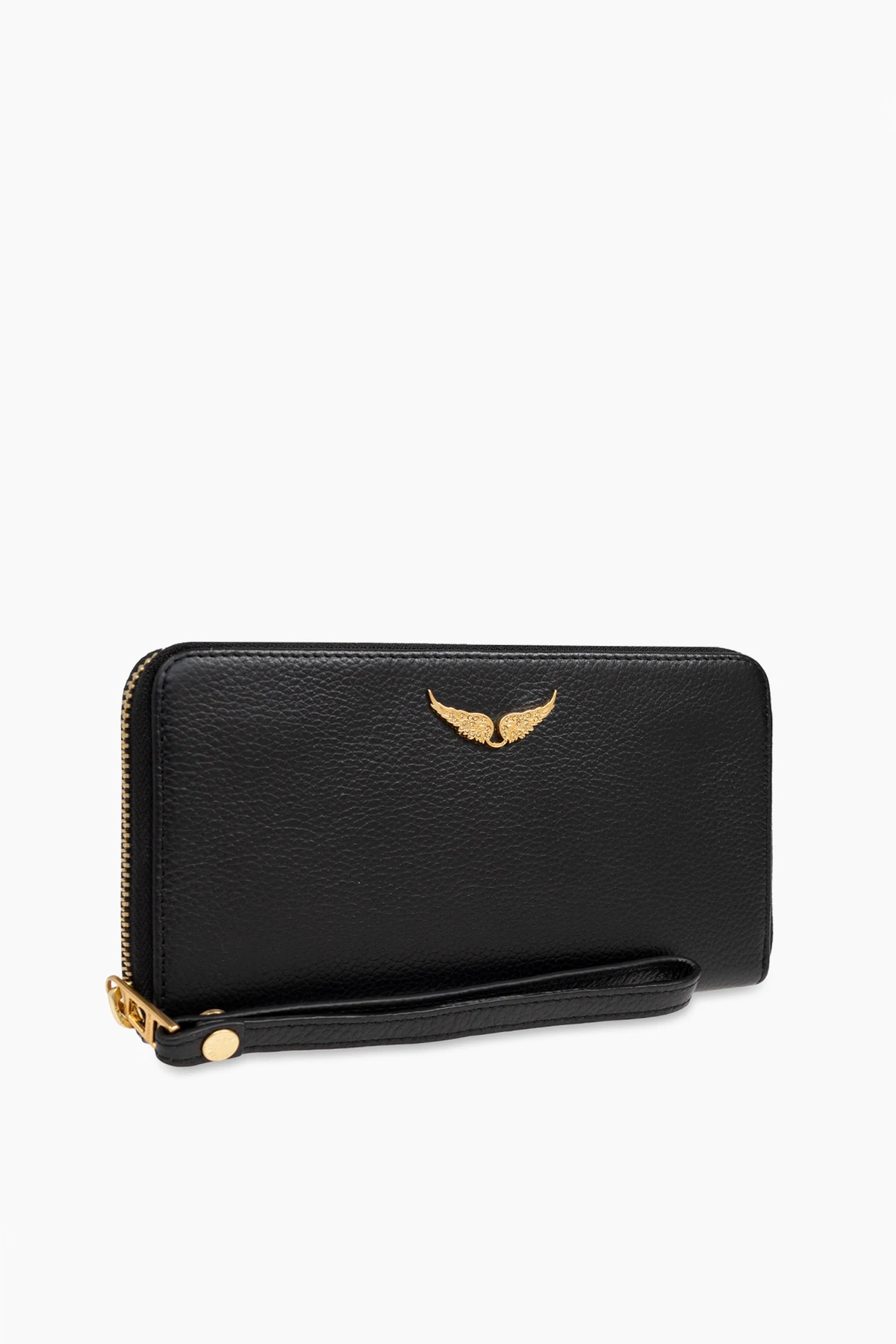 Die Brieftasche hat eine rechteckige Form mit abgerundeten Ecken, was ihr eine subtile Leichtigkeit verleiht. Ein robuster, goldfarbener Reißverschluss verläuft entlang drei Seiten und sorgt für die Sicherheit des Inhalts. Goldene Akzente wie das Emblem in Form von Flügeln und der Druckknopf am Handgelenksriemen verleihen Eleganz und unterstreichen die Exklusivität des Produkts.