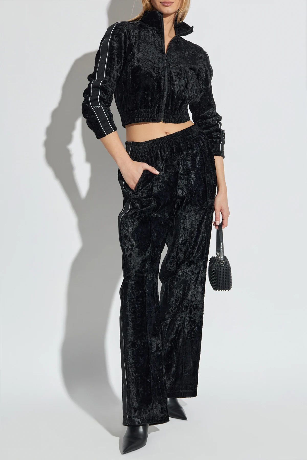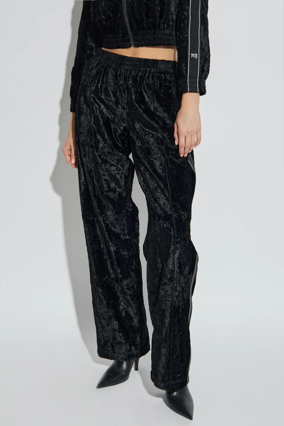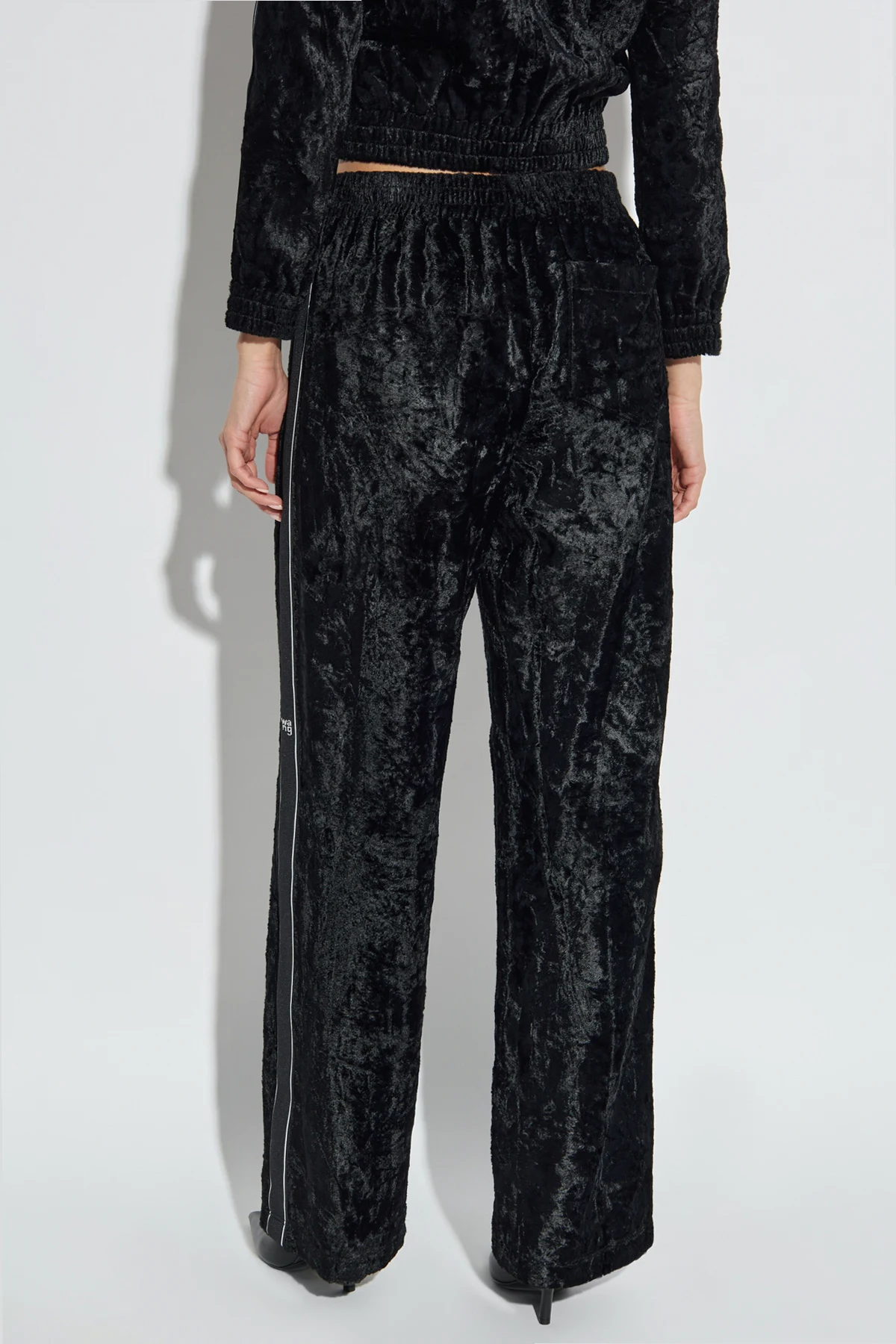 Hier sind die Samthosen aus der exklusiven Kollektion T by Alexander Wang , die Eleganz mit modernem urbanem Stil verbinden. Hergestellt aus hochwertigem Samt mit einem zarten Glanz, präsentieren sie ein luxuriöses Erscheinungsbild, ideal für Liebhaber der Grunge-Ästhetik.