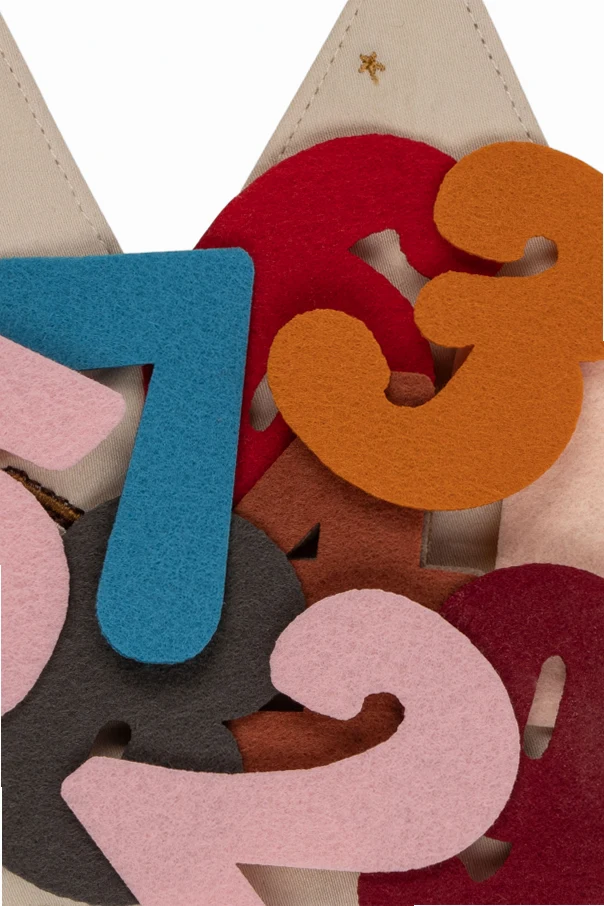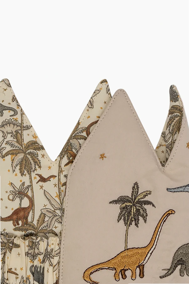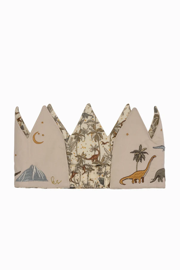 Beige birthday crown from Konges Slojd. Made from organic cotton, this item showcases dino embroidery. Comes with velcro numbers.