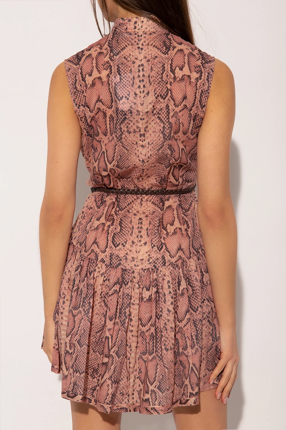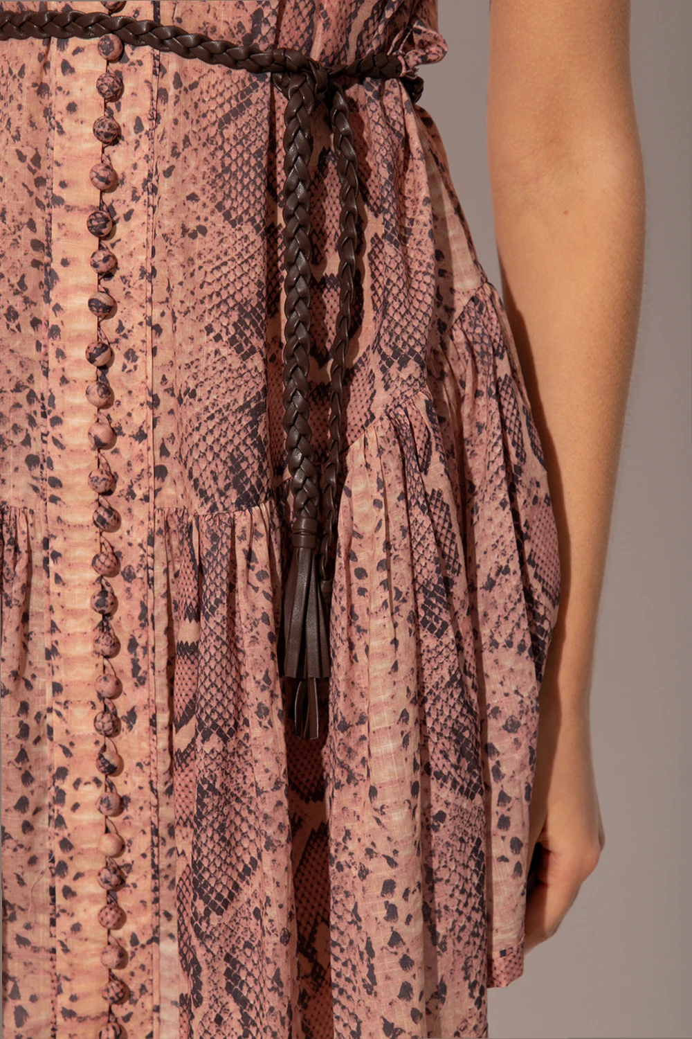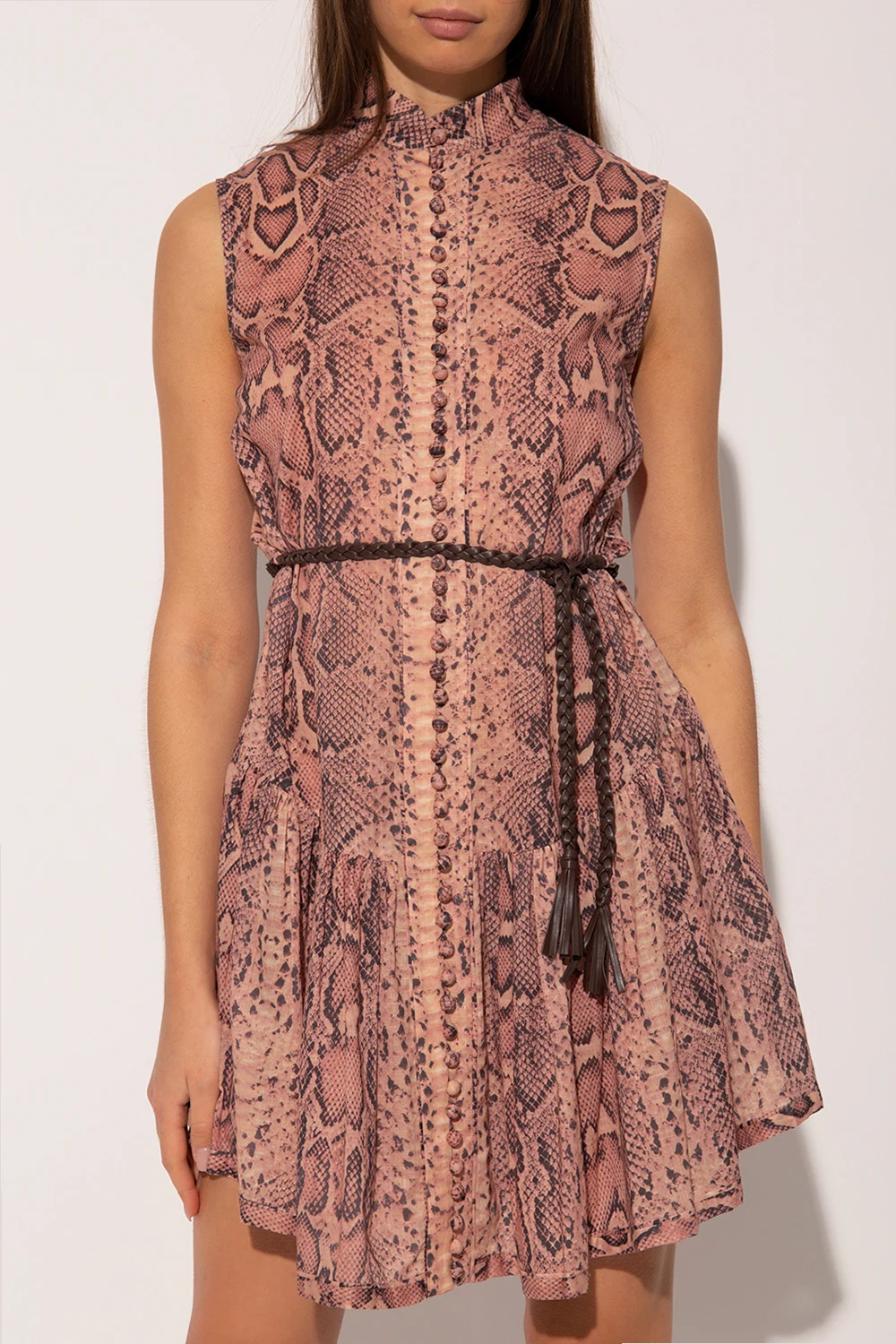 Beige, pink and black sleeveless dress from Zimmermann. Made of cotton, this garment features a back zip, button fastening, brown woven waist belt, snakeskin print and high neck.