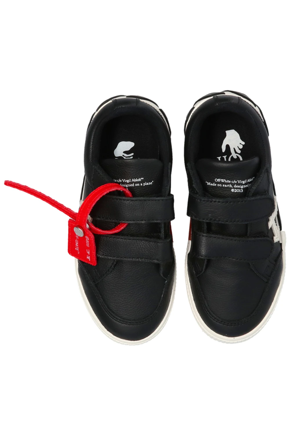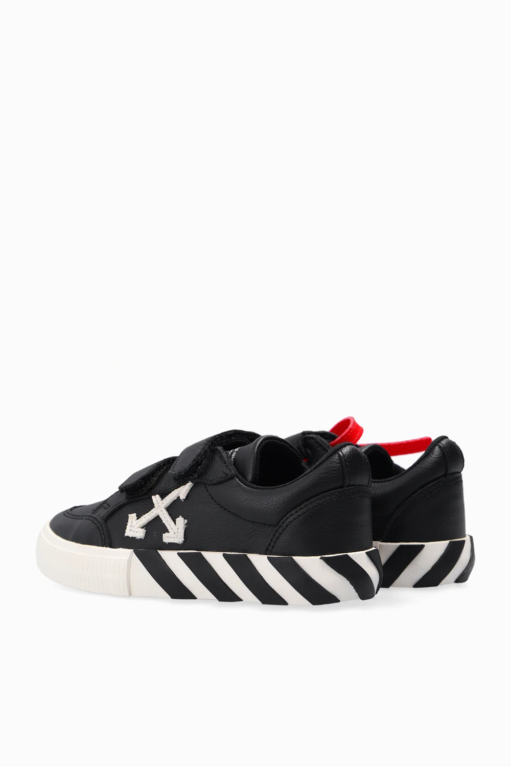 Black ‘Low Vulcanized’ sneakers from Off-White Kids. Crafted from leather, this pair features hook-and-loop fastening, logo print and patch in white, transparent orange insert on the side, the label’s signature red zip tie and a rubber sole in black and white.