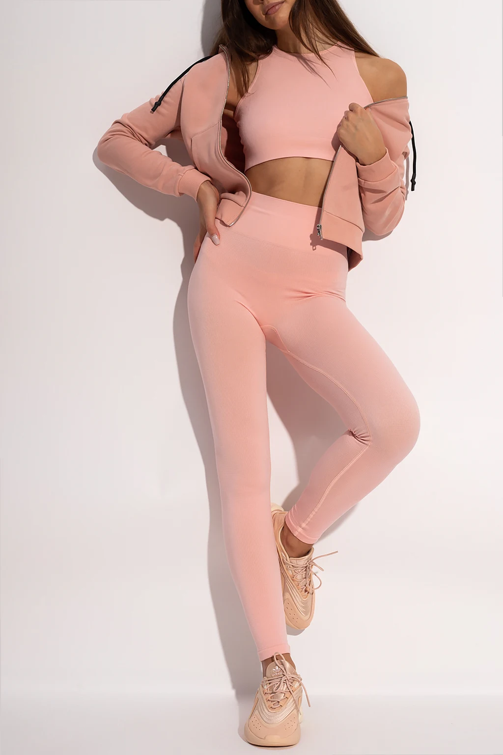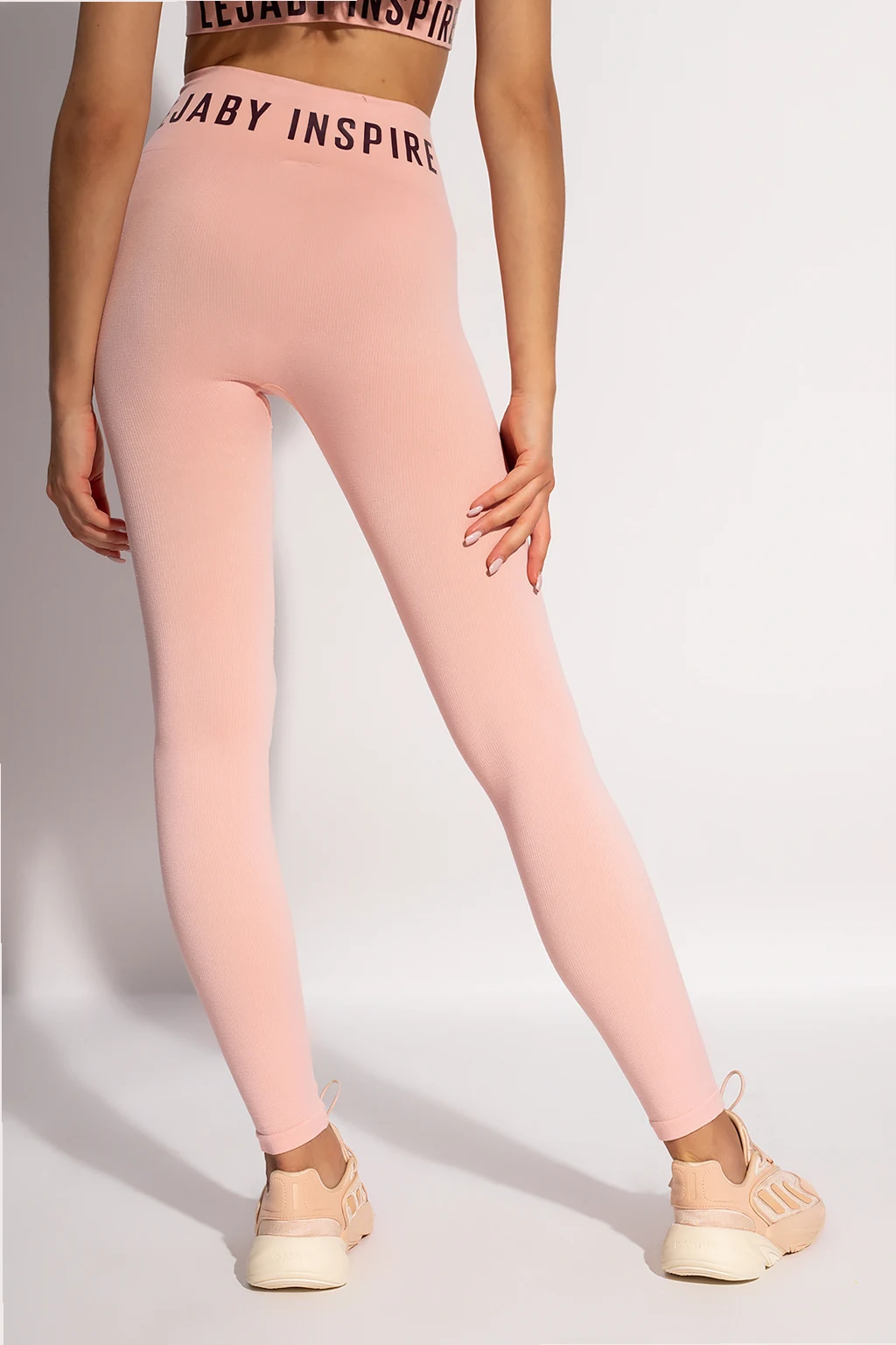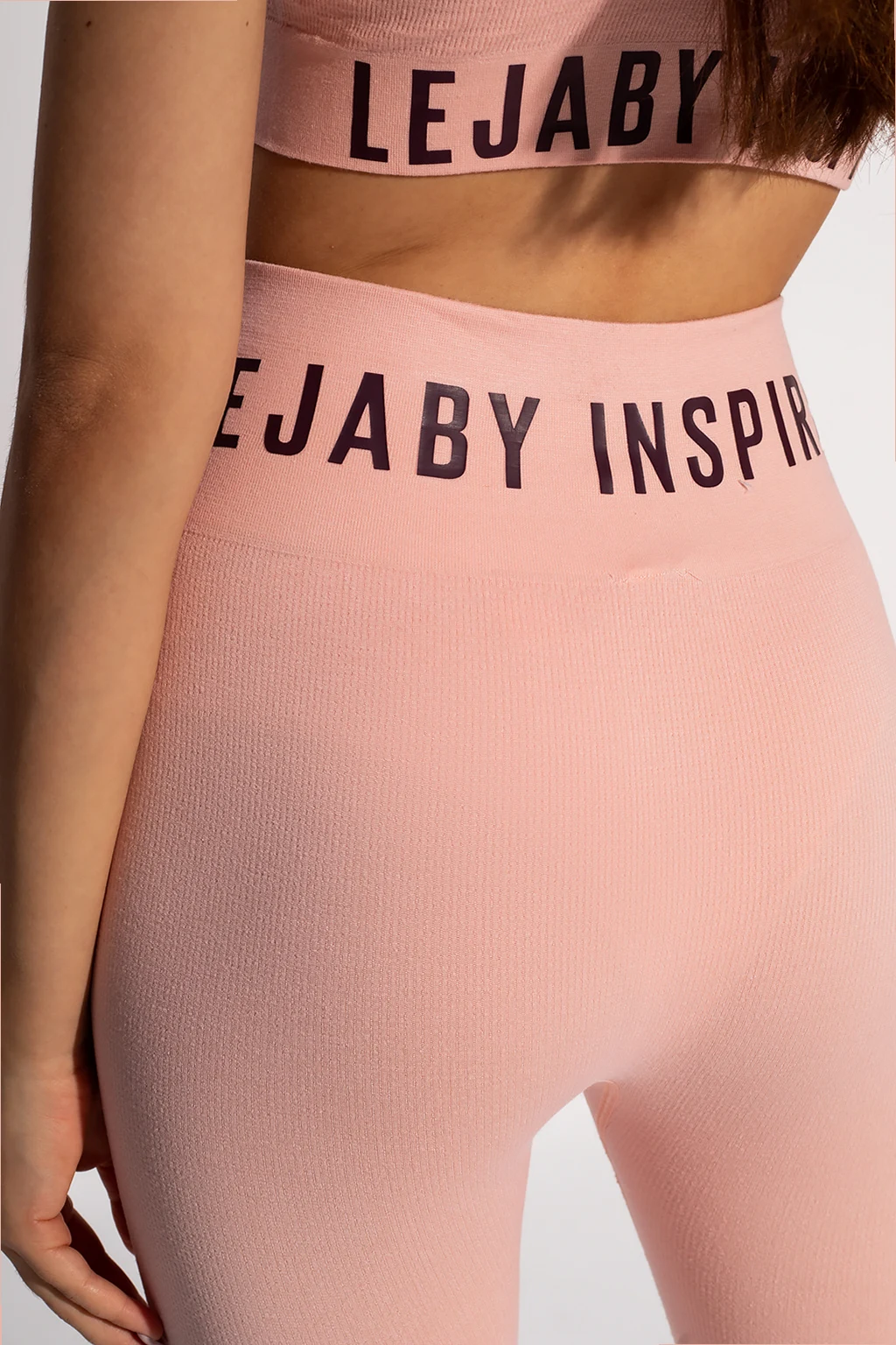 Light pink seamless leggings from Maison Lejaby. Crafted from floral fibres which ensure moderate compression for all activities where the body is in movement, this pair features an elasticated waistband and cuffs and a brown graphic print with the brand's logo on the back.