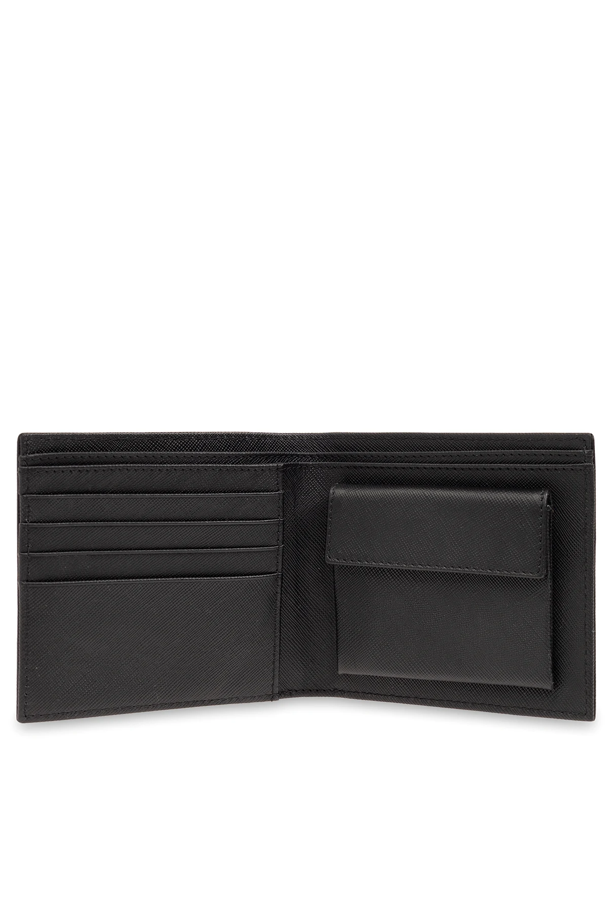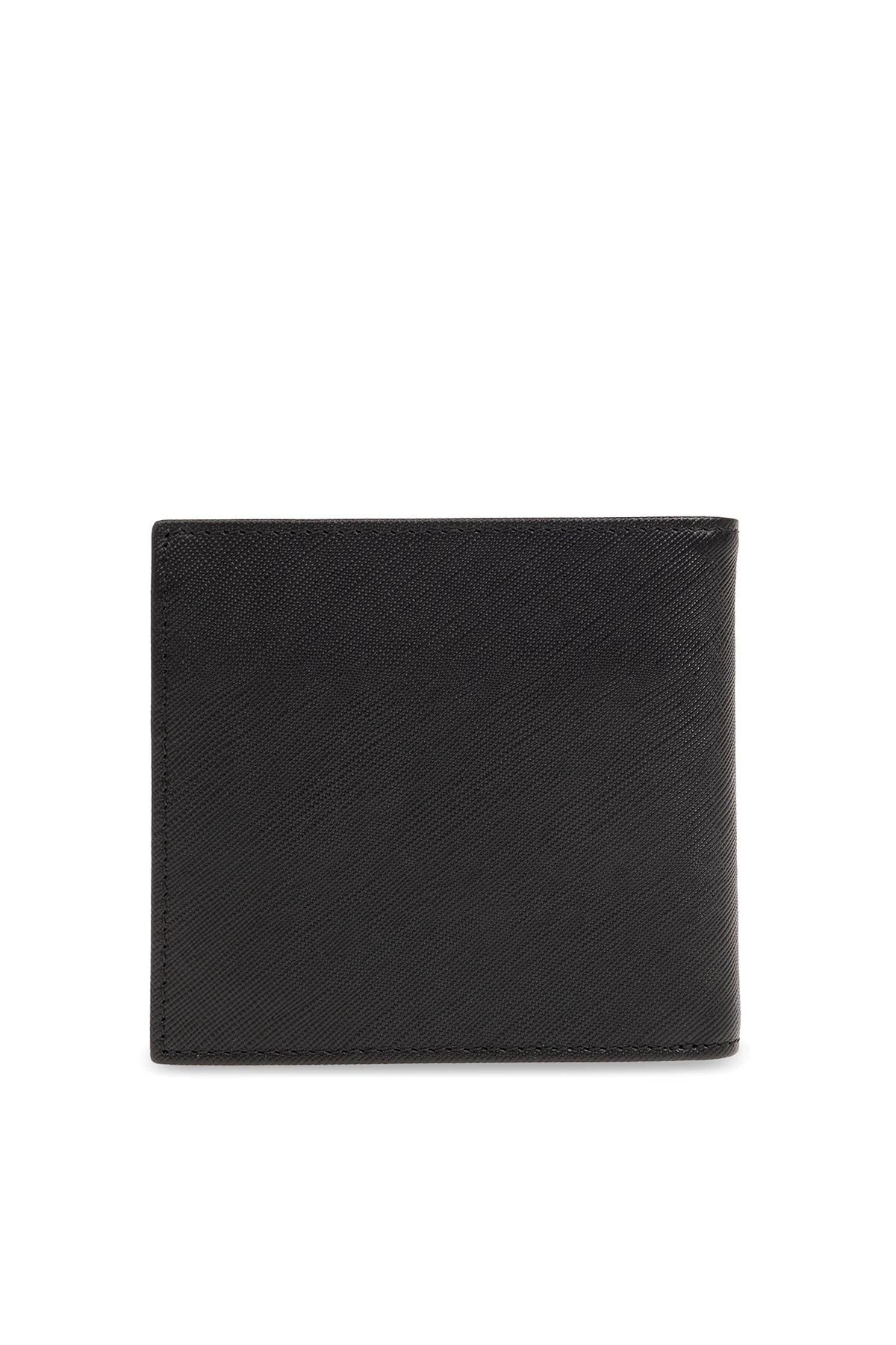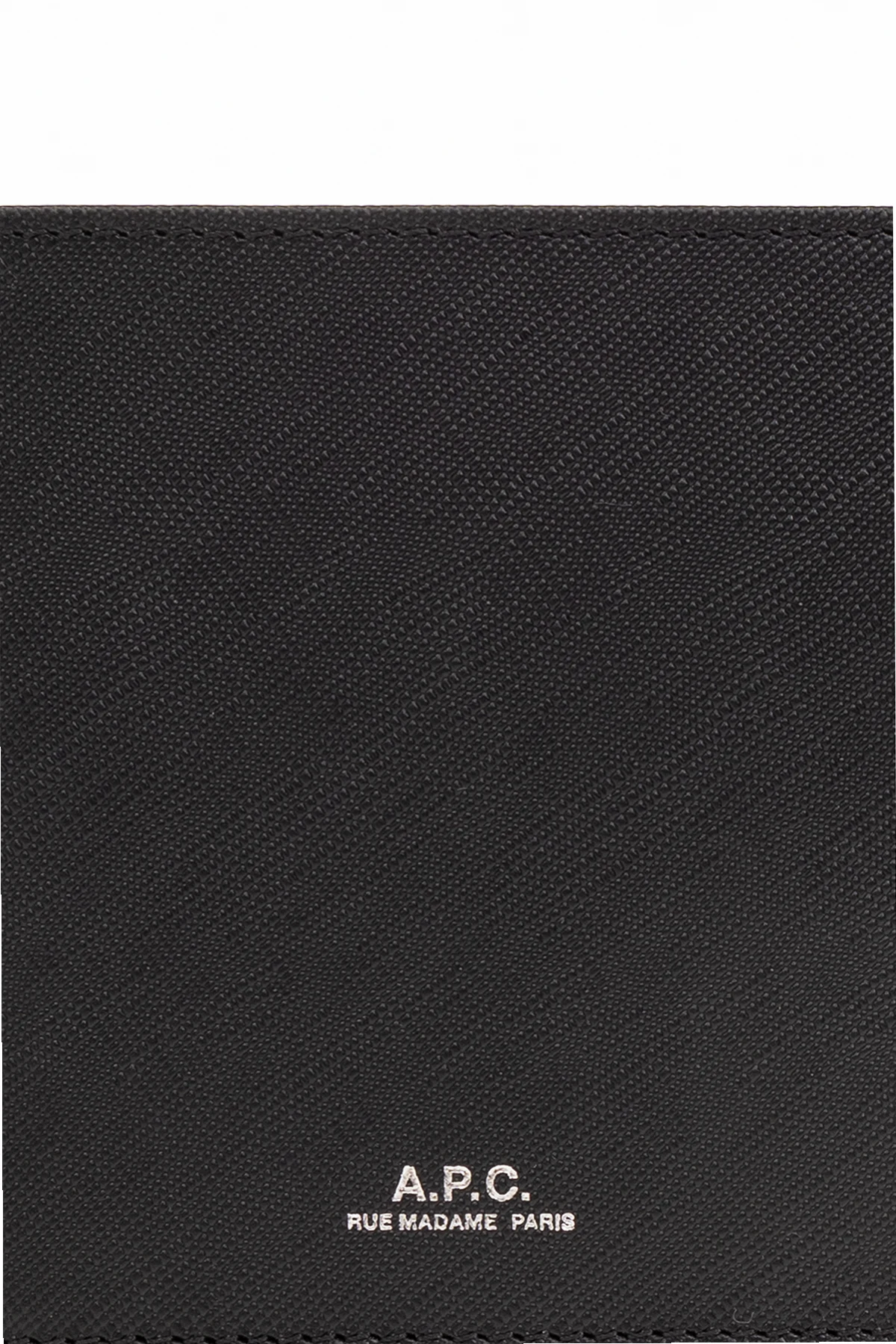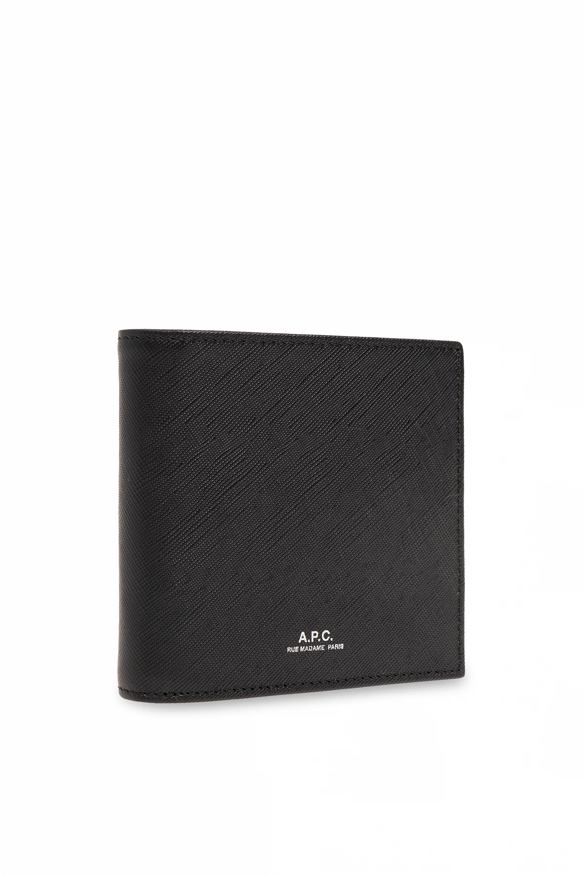 Black ‘New London’ folding wallet from A.P.C. Made from Saffiano leather, this design showcases a silver-tone logo pattern as well as two slip pockets, four card slots and one snap-fastened coin pocket inside.