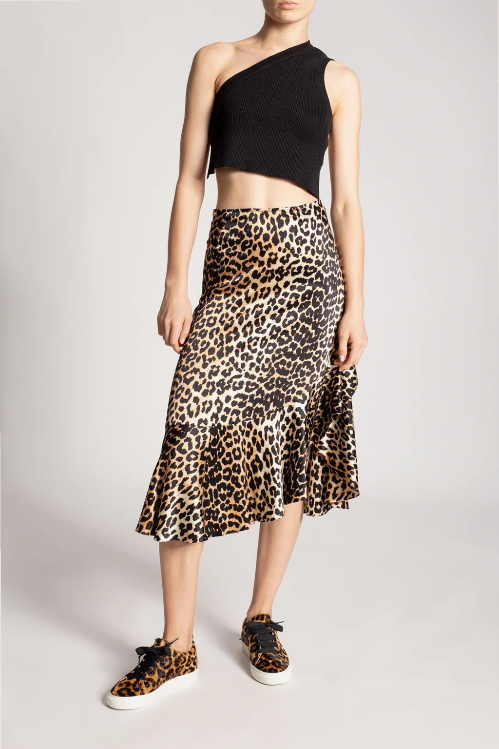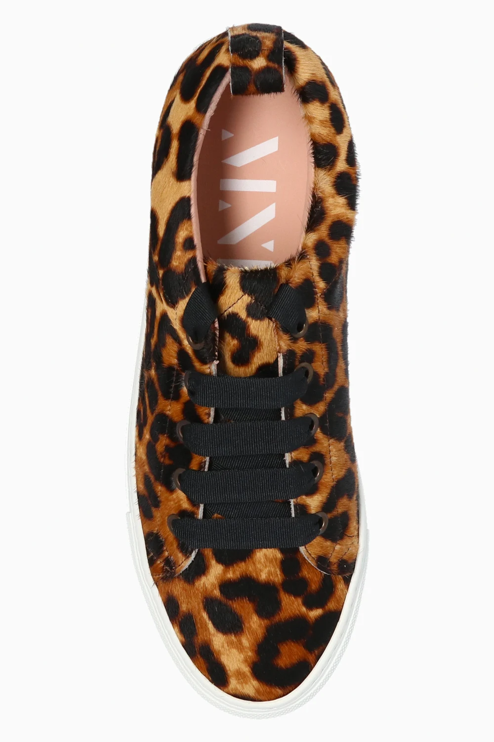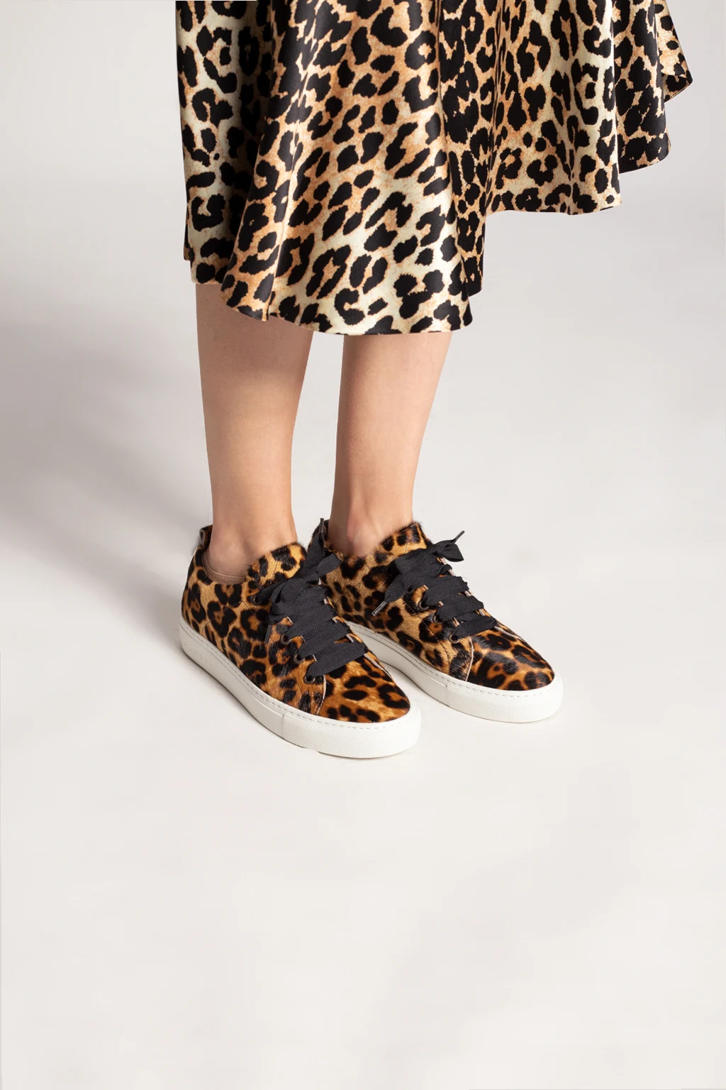 Brown and beige ‘Dakota’ sneakers from Manebi. Made from calf hair, this lace-up model sits on a white rubber sole and showcases an animal motif.