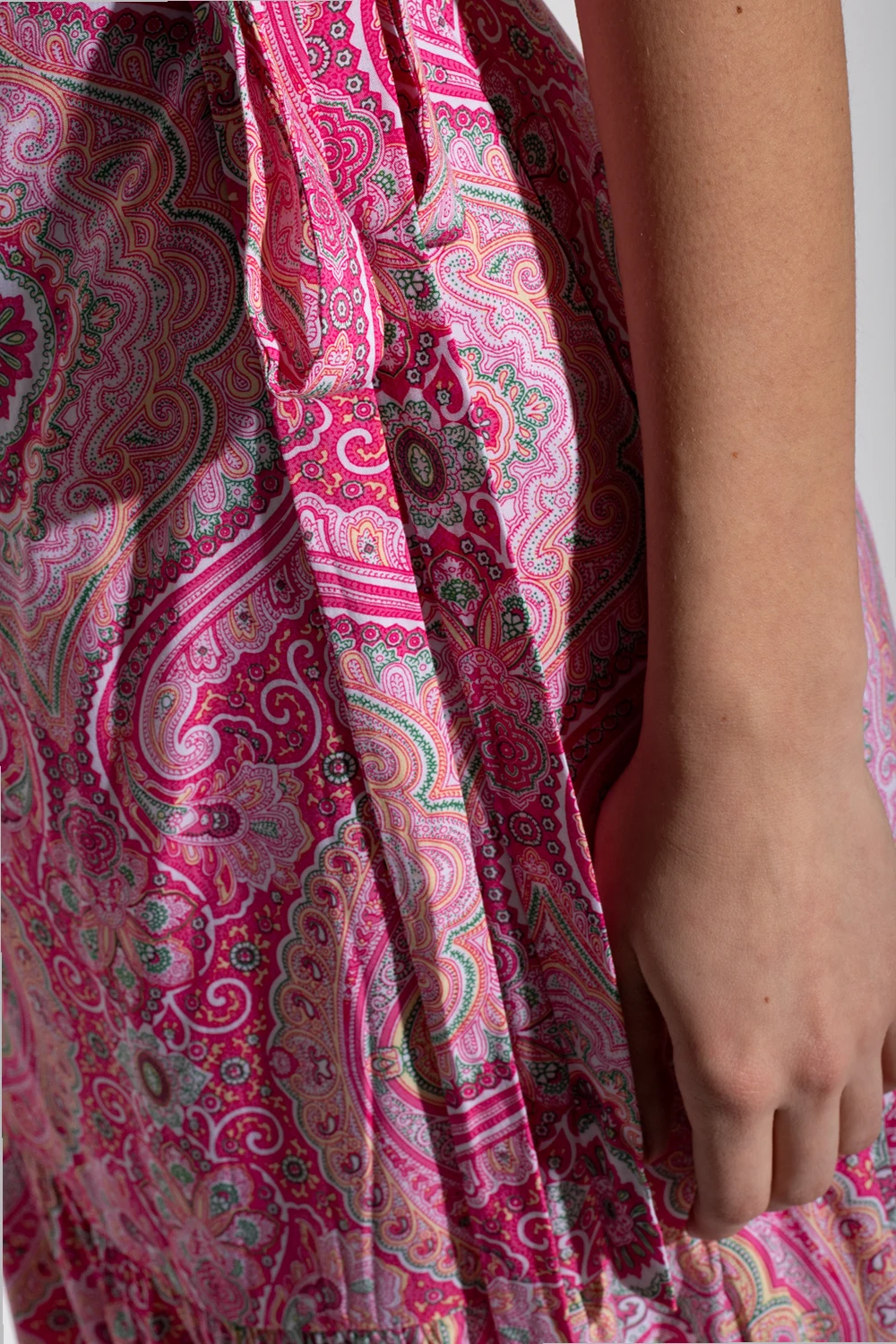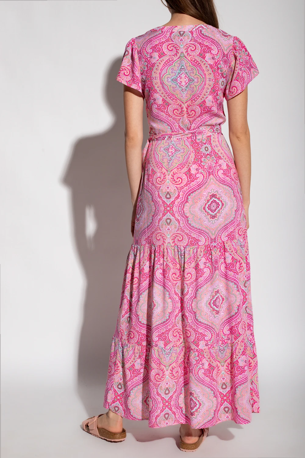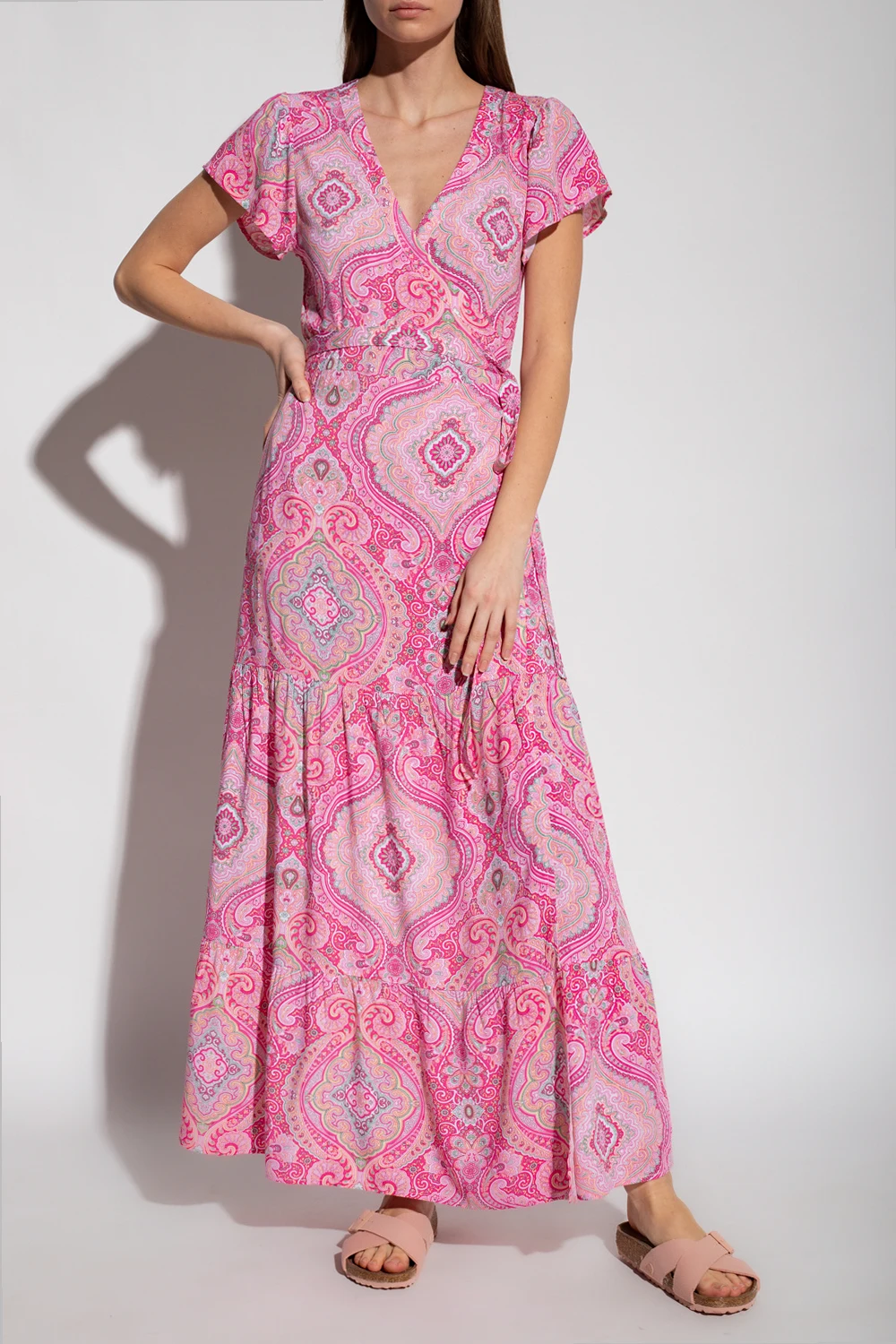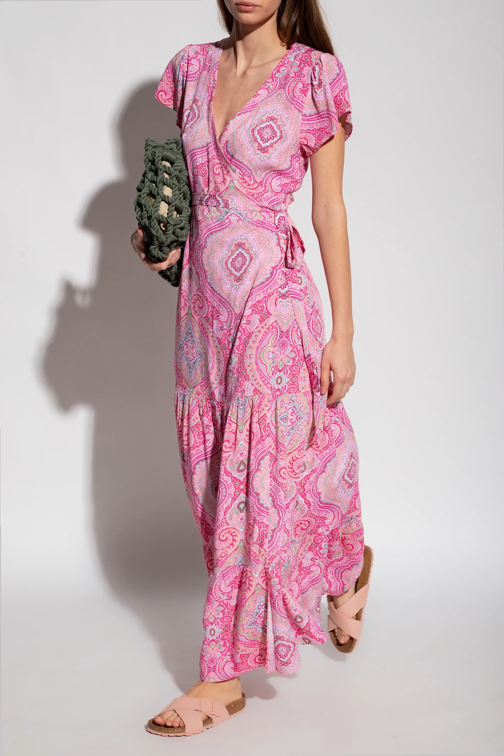 Pink wrap beach dress from Melissa Odabash. Embellished with a paisley print, this style features a self-tie fastening, a V-neckline, short sleeves and ruffle detailing.