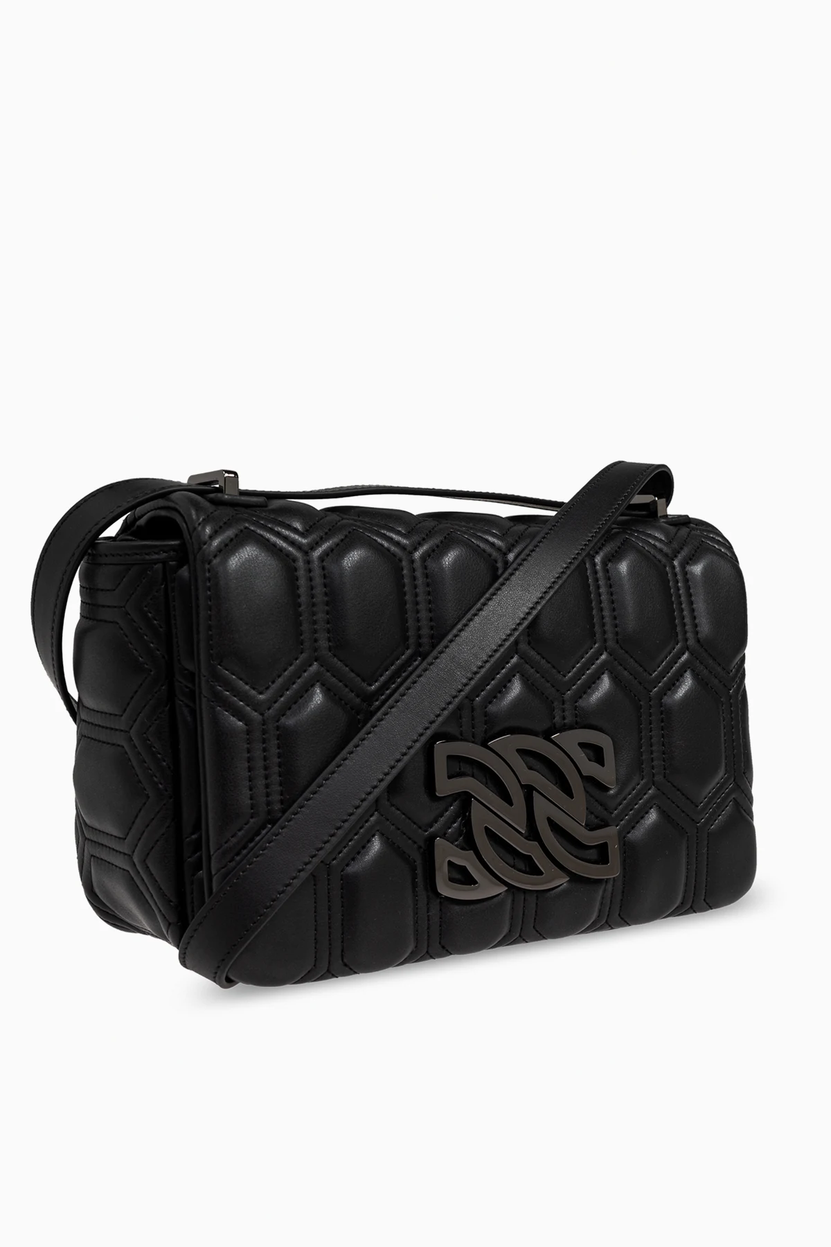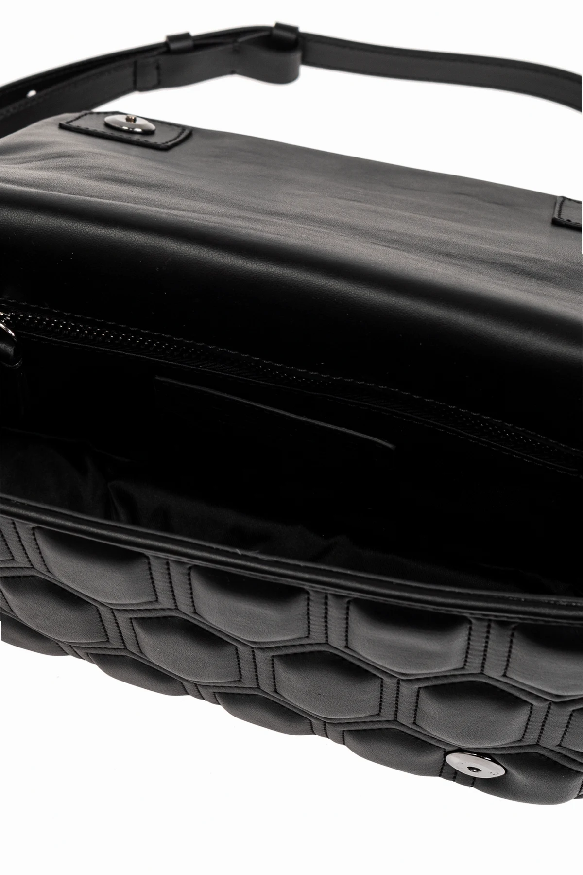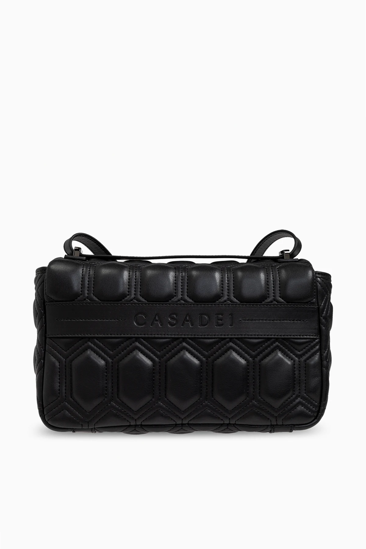 Hergestellt aus hochwertigem schwarzem Leder , begeistert die Tasche mit einem charakteristischen hexagonalen Steppmuster, das ihr ein einzigartiges, modernes Aussehen verleiht. Auf der Vorderseite befindet sich das große Metalllogo des Designers in Form ineinandergreifender Buchstaben, während auf der Rückseite der geprägte Schriftzug "CASADEI" zu sehen ist. Der ebenfalls aus Leder gefertigte Riemen ist verstellbar, was einen bequemen Tragekomfort gewährleistet.