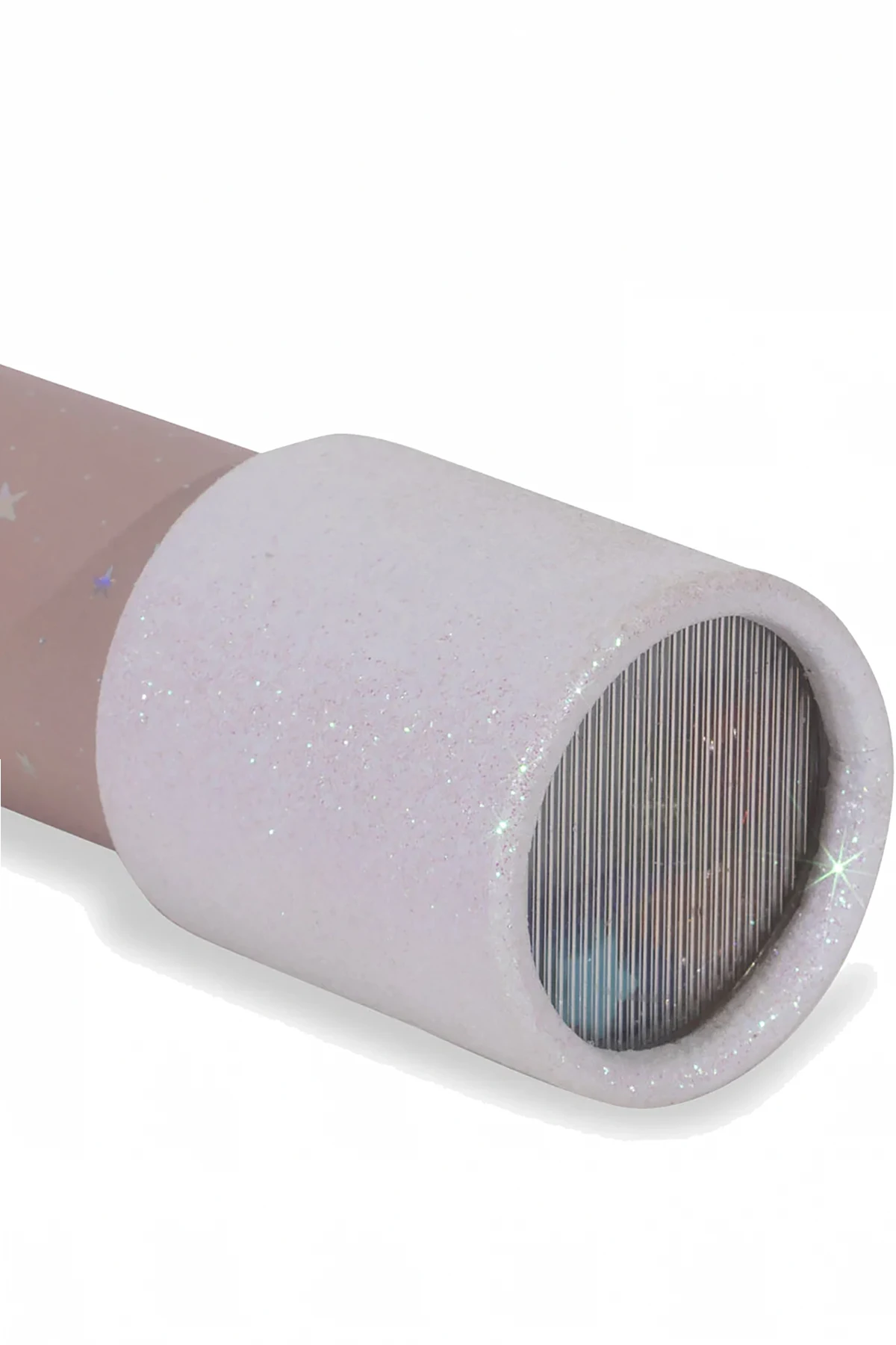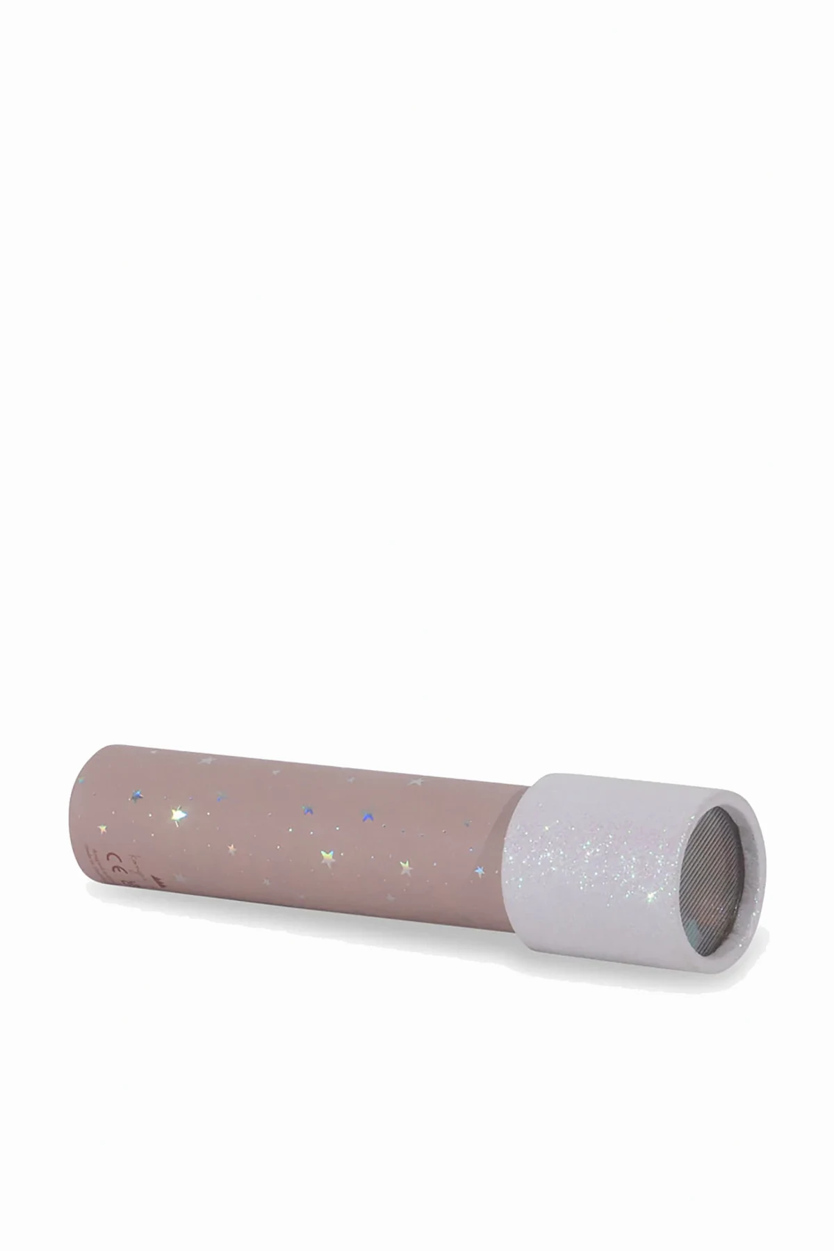 Seine zylindrische Form und die rosa Farbe mit subtilen Glanzeffekten, verziert mit kleinen, glänzenden Sternen, schaffen ein beeindruckendes und magisches Aussehen. Das transparente Ende des Kaleidoskops mit mehr glänzendem Material offenbart die wahre Schönheit im Inneren - Perlen, die dank der Spiegelungen von Spiegeln und farbigen Steinen einzigartige Muster und Farben bieten.
