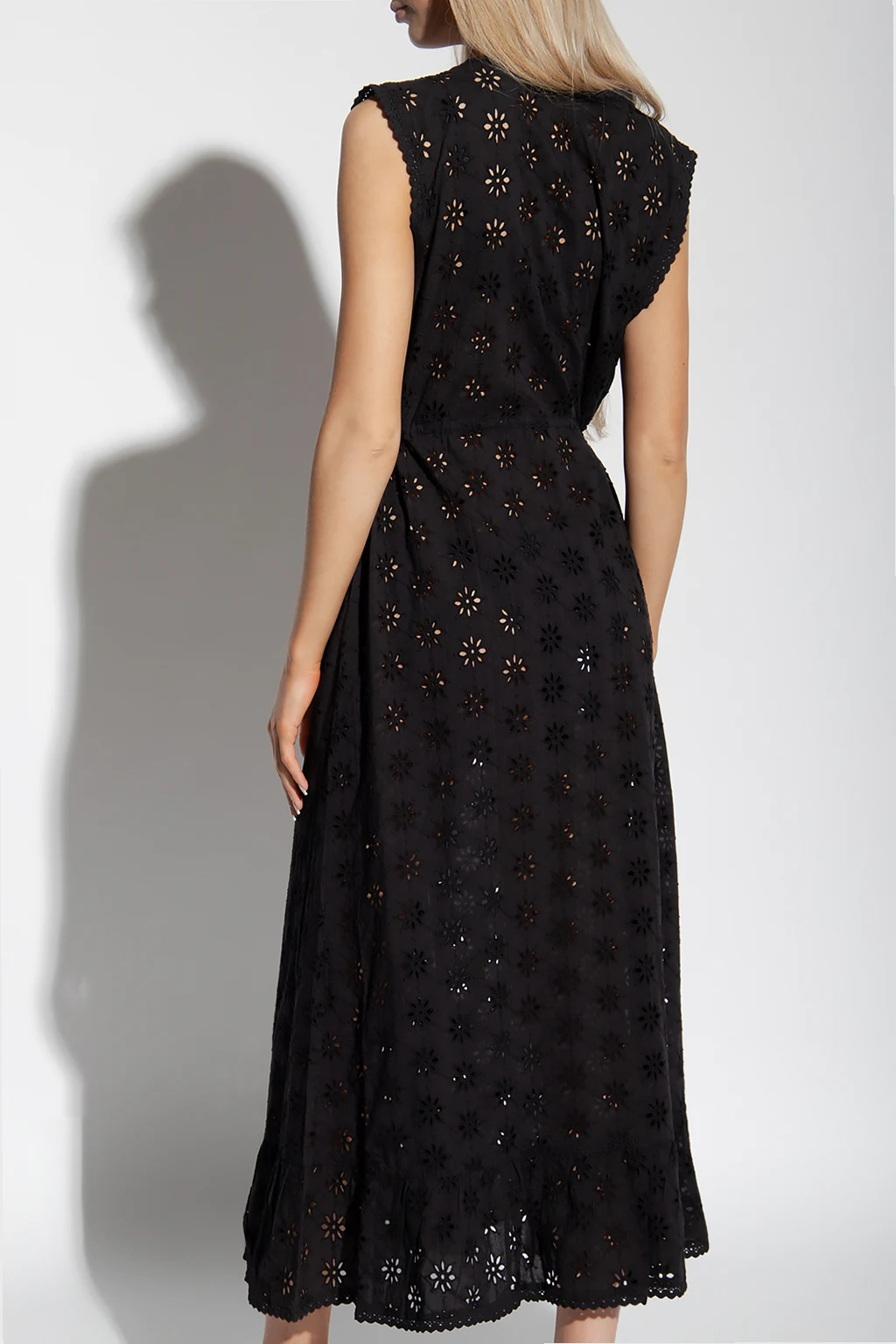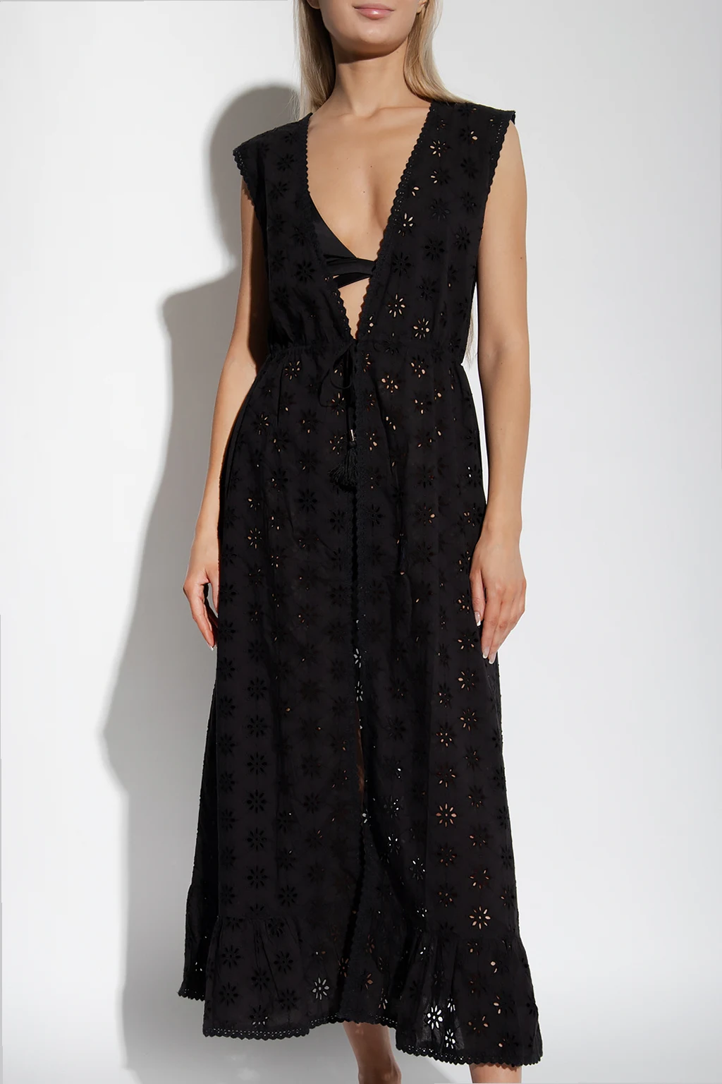 Black ‘Tessa’ dress from Melissa Odabash. Made of cotton, this design features a waist tie, short sleeves and openwork floral cut-outs.
