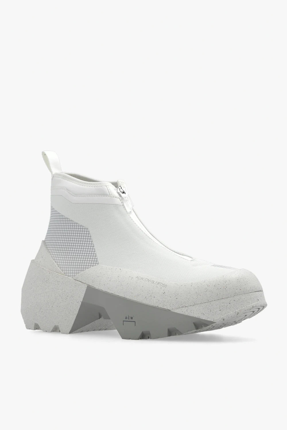 White and grey ‘Geo Forma Boot’ slip-on sneakers from Converse by A-COLD-WALL*. Made partially from synthetic fabric, this pair is complete with a logo detail, geometric pattern for a futuristic effect and grey rubber sole.