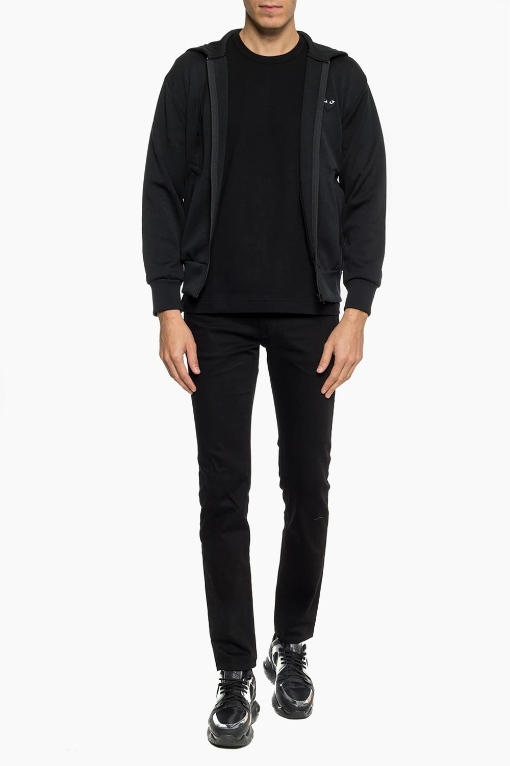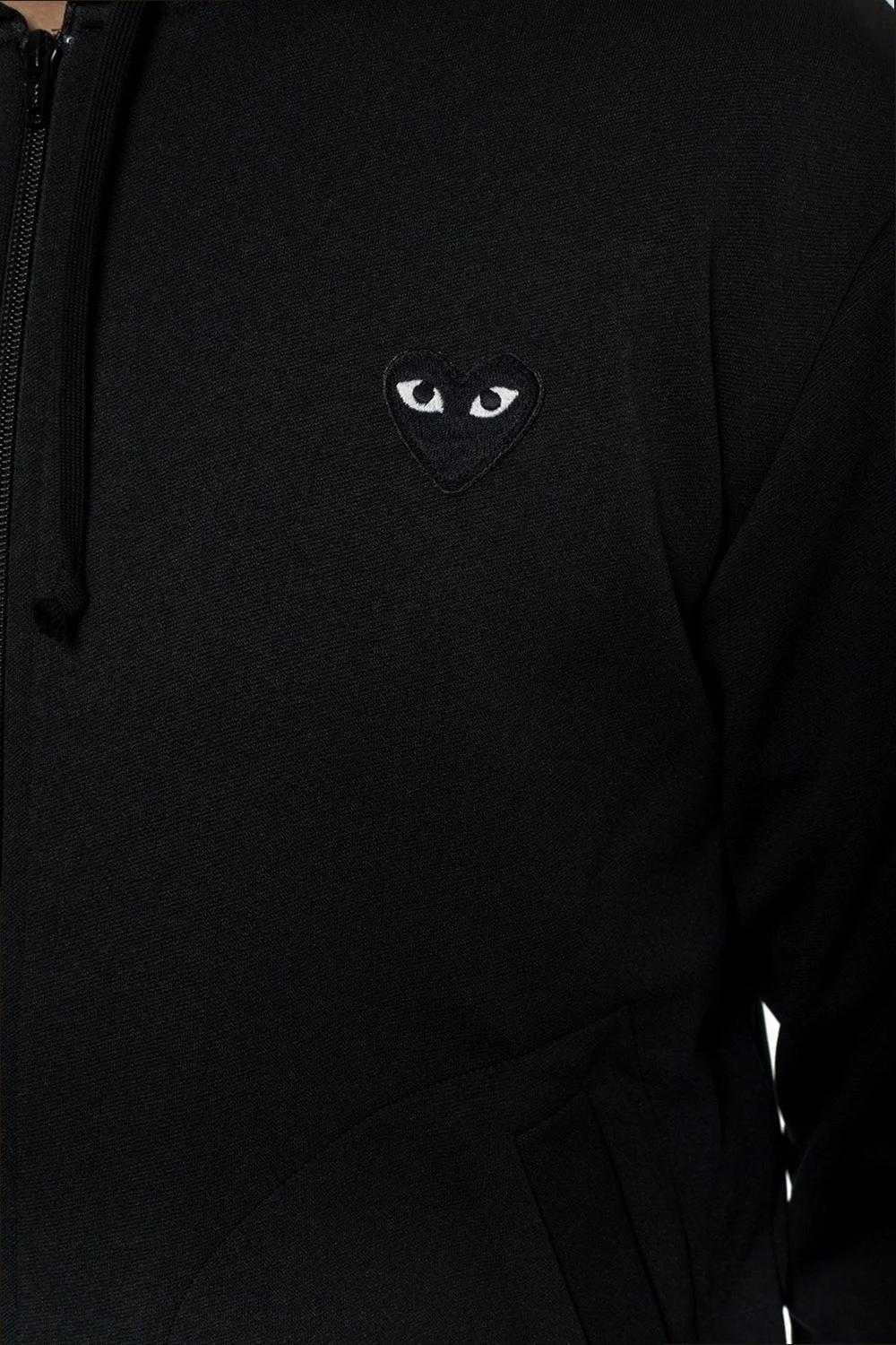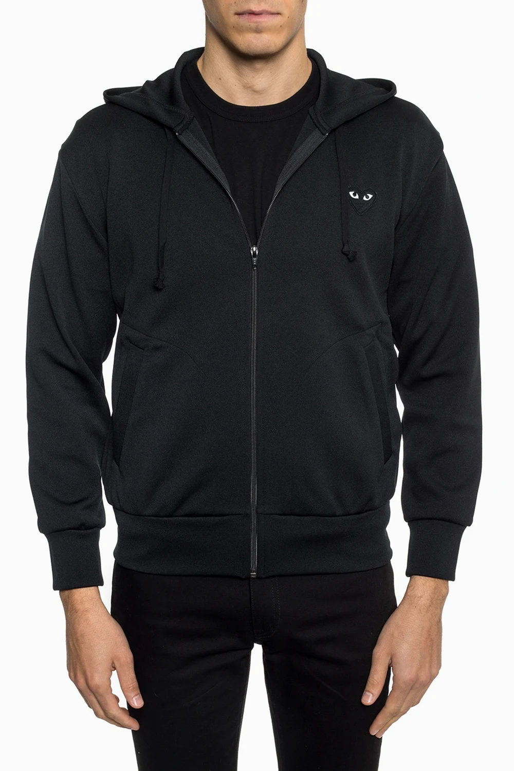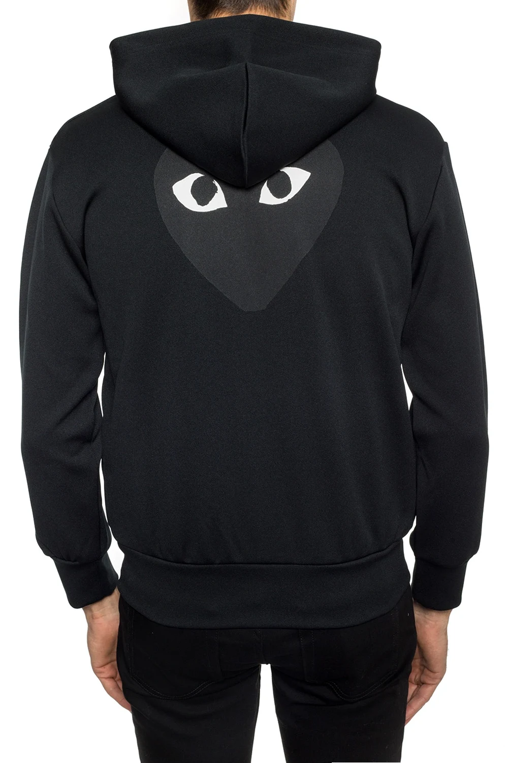 Black hoodie from Comme des Garçons Play. Hood pulled with straps. Fastened with a zip. On the front a sewn on application including a heart motif characteristic for the brand in black and white, as well as two inset pockets. On the back a printed pattern. Bottom and sleeves finished with welts.